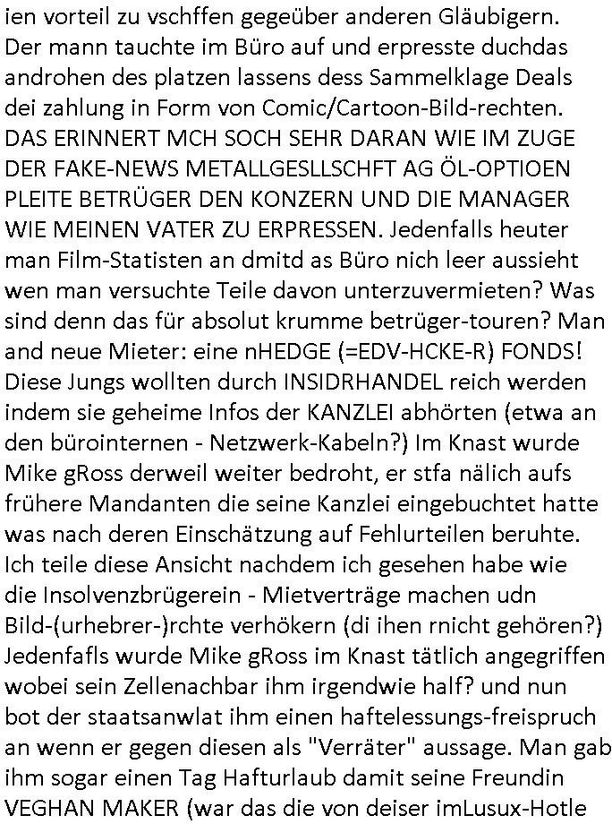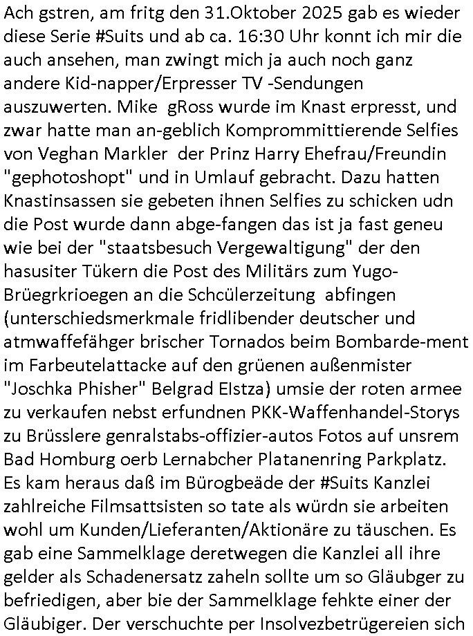 01.11.2025 07:00 Ach gstren, am fritg den 31.Oktober 2025 gab es wieder diese Serie #Suits und ab ca. 16:30 Uhr konnt ich mir die auch ansehen, man zwingt mich ja auch noch ganz andere Kid-napper/Erpresser TV -Sendungen auszuwerten. Mike gRoss wurde im Knast erpresst, und zwar hatte man an-geblich Komprommittierende Selfies von Veghan Markler der Prinz Harry Ehefrau/Freundin "gephotoshopt" und in Umlauf gebracht. Dazu hatten Knastinsassen sie gebeten ihnen Selfies zu schicken udn die Post wurde dann abge-fangen das ist ja fast geneu wie bei der "staatsbesuch Vergewaltigung" der den hasusiter Tükern die Post des Militärs zum Yugo-Brüegrkrioegen an die Schcülerzeitung abfingen (unterschiedsmerkmale fridlibender deutscher und atmwaffefähger brischer Tornados beim Bombarde-ment im Farbeutelattacke auf den grüenen außenmister "Joschka Phisher" Belgrad EIstza) umsie der roten armee zu verkaufen nebst erfundnen PKK-Waffenhandel-Storys zu Brüsslere genralstabs-offizier-autos Fotos auf unsrem Bad Homburg oerb Lernabcher Platanenring Parkplatz. Es kam heraus daß im Bürogbeäde der #Suits Kanzlei zahlreiche Filmsattsisten so tate als würdn sie arbeiten wohl um Kunden/Lieferanten/Aktionäre zu täuschen. Es gab eine Sammelklage deretwegen die Kanzlei all ihre gelder als Schadenersatz zaheln sollte um so Gläubger zu befriedigen, aber bie der Sammelklage fehkte einer der Gläubiger. Der verschuchte per Insolvezbetrügereien sich ien vorteil zu vschffen gegeüber anderen Gläubigern. Der mann tauchte im Büro auf und erpresste duchdas androhen des platzen lassens dess Sammelklage Deals dei zahlung in Form von Comic/Cartoon-Bild-rechten. DAS ERINNERT MCH SOCH SEHR DARAN WIE IM ZUGE DER FAKE-NEWS METALLGESLLSCHFT AG ÖL-OPTIOEN PLEITE BETRÜGER DEN KONZERN UND DIE MANAGER WIE MEINEN VATER ZU ERPRESSEN. Jedenfalls heuter man Film-Statisten an dmitd as Büro nich leer aussieht wen man versuchte Teile davon unterzuvermieten? Was sind denn das für absolut krumme betrüger-touren? Man and neue Mieter: eine nHEDGE (=EDV-HCKE-R) FONDS! Diese Jungs wollten durch INSIDRHANDEL reich werden indem sie geheime Infos der KANZLEI abhörten (etwa an den bürointernen - Netzwerk-Kabeln?) Im Knast wurde Mike gRoss derweil weiter bedroht, er stfa nälich aufs frühere Mandanten die seine Kanzlei eingebuchtet hatte was nach deren Einschätzung auf Fehlurteilen beruhte. Ich teile diese Ansicht nachdem ich gesehen habe wie die Insolvenzbrügerein - Mietverträge machen udn Bild-(urhebrer-)rchte verhökern (di ihen rnicht gehören?) Jedenfafls wurde Mike gRoss im Knast tätlich angegriffen wobei sein Zellenachbar ihm irgendwie half? und nun bot der staatsanwlat ihm einen haftelessungs-freispruch an wenn er gegen diesen als "Verräter" aussage. Man gab ihm sogar einen Tag Hafturlaub damit seine Freundin VEGHAN MAKER (war das die von deiser imLusux-Hotle geplatzten "ORANGEN ENTEN" - hochzeit wie Skeretärin /Ansstgehiflin "DONNA" absagte) ihn überredet. Das ist diese Rothaarige (benutzt die wie Emma Stone ihr rotes Hexen - Haar als Antenne um als Alien - Reptiloide mit ihrem Mutter-schiff zu kommuniziren?) Donna/Rafferty (wenn ich den DTAG-Time-Boogie Titelsong richtig im gedächtnis habe) die mich erinnert hat an diese Pierson von der band B52s respektive Dorotha Popolski von "der Familie Popolski", da ging es um richtig penetrant nach inisderhandel-Infos bohrende Wirtschafts-Journaille zum Thema Metllegsellschaft Öl zeitnah zum Bankvorstand #Herrhausen RAF Sprengstoffanschlag in Bad Homburg. Bei der Frage ob "Onkel Dagobert" beim Milchbar-Terror Schülerzetungs-Artikel hinrreichnder Satire-Detektor sei. https://tvinfo.de/fernsehprogramm/2219091378-suits https://tvinfo.de/fernsehprogramm/2219091381-suits https://tvinfo.de/fernsehprogramm/2219091384-suits https://tvinfo.de/fernsehprogramm/2219091387-suits Kursmanipulation um an Frirmen-Insolvenz-Immobilen zu kommen? TELEKOM DCF-77 ZEIT - STEMPEL https://en.wikipedia.org/wiki/The_Bomb!_(These_Sounds_Fall_into_My_Mind) https://www.bpb.de/kurz-knapp/hintergrund-aktuell/196955/vor-30-jahren-ermordung-von-alfred-herrhausen/ https://www.bild.de/unterhaltung/stars-und-leute/paris-hilton-wird-an-halloween-zur-spears-das-doppelte-britchen-69047e8edf9fa029228eed41 https://www.bild.de/unterhaltung/film-kino/emma-stone-fuer-ihre-rolle-in-bugonia-rasierte-sie-eine-echte-glatze-69023c34fa1876cd16274554 https://de.wikipedia.org/wiki/Evolution_(Film) https://www.fernsehserien.de/south-park/folgen/11x03-laustrophobie-103057 https://www.tvinfo.de/fernsehprogramm/2202975619-south-park [0] "202511010700-0-1.jpg" [1] "202511010700-0-2.jpg" [2] "202511010700-0-3.jpg" [3] "202511010700-0-4.jpg" |