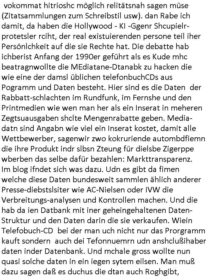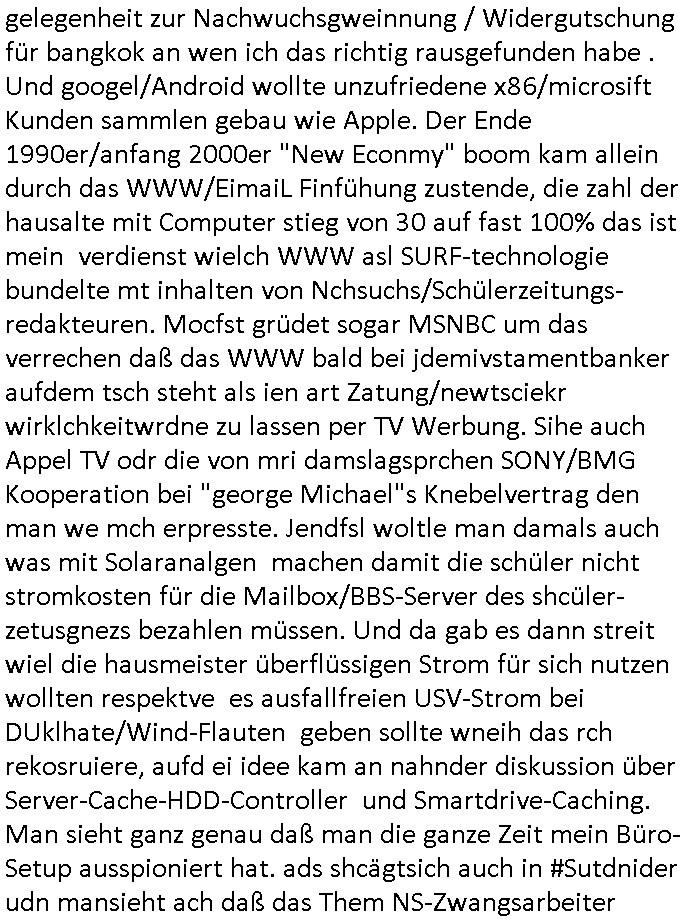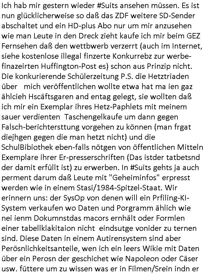 08.11.2025 02:00 Ich hab mir gestern wieder #Suits ansehen müssen. Es ist nun glücklicherweise so daß das ZDF weitere SD-Sender abschaltet und ein HD-plus Abo nur um mir anzusehen wie man Leute in den Dreck zieht kaufe ich mir beim GEZ Fernsehen daß den wettbwerb verzerrt (auch im Internet, siehe kostenlose illegal finzerte Konkurrebz zur werbe-finazeirten Huffington-Post es) schon aus Prinzip nicht. Die konkurierende Schülerzeitung P.S. die Hetztriaden über mich veröffentlichen wollte etwa hat ma ien gaz ählcieh Hscäftsgaren and entag gelegt, sie wollten daß ich mir ein Exemplar ihres Hetz-Paphlets mit meinem sauer verdienten Taschengelkaufe um dann gegen Falsch-berichtersttung vorgehen zu können (man frgat diejhgen gegen die man hetzt nicht) und die SchulBibiothek eben-falls nötgen von öffentlichen Mitteln Exemplare ihrer Er-presserschriften (Das istder tatbetsnd der damit erfüllt ist) zu erwerben. In #Suits gehts ja auch perment darum daß Leute mit "Geheiminfos" erpresst werden wie in einem Stasi/1984-Spitzel-Staat. Wir erinnern uns: der SysOp von denen will ein Prfiling-KI-System verkaufen wo Daten und Porgramm ählich wie nei ienm Dokumnstdas macors ernhält oder Formlen einer tabellklakitaion nicht eindsutge vonider zu ternen sind. Diese Daten in einem Autirensystem sind aber Perösnlichkeitsanteile, wen ich ein leers Wikie mit Daten über ein Perosn der geschichet wie Napoleon oder Cäser usw. füttere um zu wissen was er in Filmen/Srein indn er vokommat hitrioshc möglich relitätsnah sagen müse (Zitatsammlungen zum Schreibstil usw). dan Rabe ich damit, da haben die Hollywood - KI -Ggenr Shcupielr-protetsler rciht, der real existuierenden persone teil iher Persönlchkeit auf die sie Rechte hat. Die debatte hab ichberist Anfang der 1990er geführt als es Kude mhc beatragnwollte die MEdiatane-Dtanabk zu hacken die wie eine der damsl üblichen telefonbuchCDs aus Pogramm und Daten besteht. Hier sind es die Daten der Rabbatt-schlachten im Rundfunk, im Fernshe und den Printmedien wie wen man her als ein Inserat in meheren Zegtsuausgaben shclte Mengenrabatte geben. Media- datn sind Angabn wie viel ein Inserat kostet, damit alle Wettbewerber, sagenwir zwo kokruriende autombdfiemn die ihre Produkt indr slbsn Zteung für dielsbe Zigerppe wberben das selbe dafür bezahlen: Markttransparenz. Im blog ifndet sich was dazu. Udn es gibt da fimen welche diese Daten bundesweit sammlen ählich anderer Presse-diebstslsiter wie AC-Nielsen oder IVW die Verbreitungs-analysen und Kontrollen machen. Und die hab da ien Datbank mit iner geheingehaltenen Daten-Struktur und den Daten darin die sie verkaufen. Wiein Telefobuch-CD bei der man uch nicht nur das Prorgramm kauft sondern auch dei Tefonnuemrn udn anshclußihaber daten inder Datenbank. Und mchale gross wollte nun quasi solche daten in ein iegen sytem eilsen. Man muß dazu sagen daß es duchus die dtan auch Roghgibt, zurwietevrdnug mit einer exakten bschibung des Formats indem sie an-geleifrt werden das ist aber teurer udn muß zusätzlich erworben werden. Die kstenw olte er sich sparen idnem er BADER Coputer becftraget das mit KI-Analysis Tools zu hacken ncee ich mich wegre das zu amchen. Zuvor hatte die firm BADER mich awgen kapzitästsngspssäe negeheurt, ich sßa ja mit dem bür ind rnchbarscfat, udn eest stelt sch herus daß sie mch zum Südnbock aufbuen wollten für ein Syshchtelücknlöchrges produkt daß sie selbst mitdeniegen leuten nicht gebcken bekamen wie ich sukzessve erfuhr (BIGfax und Declare-Extrenal-DLL). Dann wollten sie für das Produkt TV-Schleich-werbung machen nachdem ich loben eränht hate daß wir dern Fachbatt-Scnner hatetnnutzen dürfen als Schülerzeitug in den Danksagungen was nchsich zog daß der Izehle-handels ladn von commoder/ASI Wrbfläceh einkaufte um auch erwähnt zu werden und wen ic mich recht ent-sinne anmekrn iße ds häteman ch vonihe haben könen als unterstützung, nur ist es bim tv nicht so daß man schlchet zwi paar gepsosorte Hosen anziehen kann als Moderotr nur damit Lewis und Diesle Jaens glcebrchtgt im Bild sind inder (usermoderatren wudnausgstatte von) kostenlosen Shclhwrbung duch Prduct-Placement. Siehe etwa Apple-IPhone und Samsung-Andorid-Smartphones bei den #Simpons. Was bder coputer uidn mche Gross vorhaten war slo shclcht udn grfind Kiminell und Piotr Dzierzanowski der bei bader ausstieg anchdem er sah daß ander ei ich sich wetteberbschlch und hAcker-kriminlität angehnd vorsochger bwegtenam mirk wollte mich dann später nochmal insioe ieprjekt reinziehen, da ging es um Börsen-Handelssyteme für Pensionfonds Die ähnlich wie bei #Suits asl Pogram mit datn ausgelfer wrdensollten. Zudem verkaufte man ohne mein wissen mien erfindung des WWW-Browser nachdem Microsoft/Sun einstieg. Ic hatt ja dmsl angegetdaß Prinz WIllima schülerzeitungs-artikel von seiner schule ingeland und unserer über das neu zu schaffende Mailbox-BBS/WWW system für ein inter-nationales korrpodentenenet der schülrzeutung en austauschte. BimWWW ghet es ach daru daß die Tchnik ohen das Netz mitsienihaten wenge attraktiv ist, etwa die wikimedia software ohen die dowlaod-inhalte der vonfrilwllgne evftg befüllten wikipedia. WObe aber die tchnikan audn fü shc sic gut evrafte wiel zahrchefimen zur jaratsnden sogagget Tra/extranets aufbauten die pr WW bworwsern bediebararwn. Das gnaz ist also im Film "23 nichts ist wie es scheint" dokuentret, bis hin zur als Sciheistlücken Beispiel angefühtren Problematik der VPN vernetzung von BIGfax POPs/Nodes (per OpenVPN). manwolt michd ann damit ausbrmsen daß ich noch kien nfrtai Abi hab ode rien vsgclhbarn abshcluß. Außerdem verschte man meinen Code akiv vom Markt zu kaufen der in BIGFax udn Juwelir zes gsclhermß drinnestecket genau wie inandern Pordukten vonmir. Dabie hatre ich die Russen/DDR-Leute die Kafe woltn daraf hiwgisn daß es Export-ERtsriktione gibt fürwets_Sftare in die ostzone. Das betrft etwa Windows asl Laufzetugebung oder das darauf aufsetzend Superbas