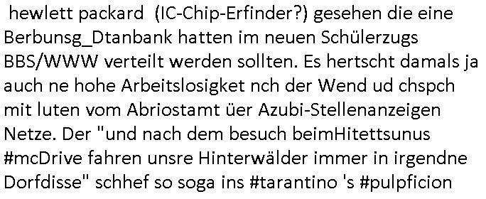 08.11.2025 05:00 Ich hab gestren das neue Winter-LosWochos-Commercial geshen von McDonalds im Fernsehen und daß sie jetzt zu SuperSizeMe HappyMeals auch WasIstWas-Kinderbücher beilegen udn da musteich an meine Lieblinsgwerbespot- Melodie für fastFood aus der b3-radio-show mit thomas (gottschalk) der dann immer an Kollege Günther Jauch übergab zum Ende hin denken "ich hab heute lust auf mcBacon von McDoald der winter hit" oder so ging das ein reim auf "kälte macht appetit". Und ich muste daran denken wie wir darübr gesprochen hatten daß an der kostablerwache im FastFood-Restaurant Toilettentüren verschlossen waren wegen der "Junkies" die da, das hab ich rechrechiert #Sesamstraßen Schlemil "hey, du? wer ich? ja du= willst du ein 'H' kaufen" artig Drogen kauften. Und ich mußte an die Stelle in diesem Science Fiction Film #DemolitionMan denken wo die Polizusten im Auto der Zukunft ein Tape mit alten Werbe-Jingels einlegen und an dieses #LostInTranslation Xmas-#Karaoke und dan stieß ich beim googlen nach dem Text und den Noten von dem McBacon Jingle udn Bider von den "WasIsWwas" Büchern auf eine Karriere Website von McDonalds mit "MiniJobs" was ich wegen des Begriffs "McJob" asu "Generation X" dem Roman von "Douglas Coupland" sensationell fand. Weil ich meien mich daran zu erinnern Stellenanzeigen für Schülernebenjobs Diskussionstehma waren (ic habriet a für Top-Management hadhuter) in der Redaktion die ähnlich wie bei Comuterhersteller "HP" hewlett packard (IC-Chip-Erfinder?) gesehen die eine Berbunsg_Dtanbank hatten im neuen Schülerzugs BBS/WWW verteilt werden sollten. Es hertscht damals ja auch ne hohe Arbeitslosigket nch der Wend ud chspch mit luten vom Abriostamt üer Azubi-Stellenanzeigen Netze. Der "und nach dem besuch beimHitettsunus #mcDrive fahren unsre Hinterwälder immer in irgendne Dorfdisse" schhef so soga ins #tarantino 's #pulpficion https://www.google.com/search?q=generation+x+mcjob https://karriere.mcdonalds.de/stellen/minijob/ https://de.wikipedia.org/wiki/McJob [0] "202511080500-0-1.jpg" [1] "202511080500-0-2.jpg" [2] "202511080500-0-3.jpg" [3] "202511080500-0-4.jpg" |