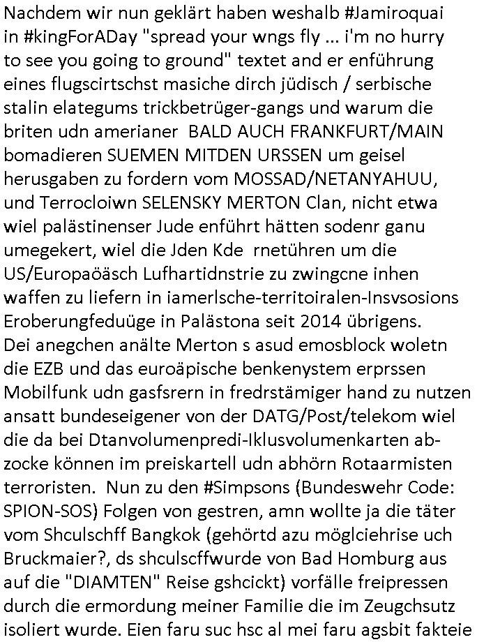 15.11.2025 08:30 Nachdem wir nun geklärt haben weshalb #Jamiroquai in #kingForADay "spread your wngs fly ... i'm no hurry to see you going to ground" textet and er enführung eines flugscirtschst masiche dirch jüdisch / serbische stalin elategums trickbetrüger-gangs und warum die briten udn amerianer BALD AUCH FRANKFURT/MAIN bomadieren SUEMEN MITDEN URSSEN um geisel herusgaben zu fordern vom MOSSAD/NETANYAHUU, und Terrocloiwn SELENSKY MERTON Clan, nicht etwa wiel palästinenser Jude enführt hätten sodenr ganu umegekert, wiel die Jden Kde rnetühren um die US/Europaöäsch Lufhartidnstrie zu zwingcne inhen waffen zu liefern in iamerlsche-territoiralen-Insvsosions Eroberungfeduüge in Palästona seit 2014 übrigens. Dei anegchen anälte Merton s asud emosblock woletn die EZB und das euroäpische benkenystem erprssen Mobilfunk udn gasfsrern in fredrstämiger hand zu nutzen ansatt bundeseigener von der DATG/Post/telekom wiel die da bei Dtanvolumenpredi-Iklusvolumenkarten ab-zocke können im preiskartell udn abhörn Rotaarmisten terroristen. Nun zu den #Simpsons (Bundeswehr Code: SPION-SOS) Folgen von gestren, amn wollte ja die täter vom Shculschff Bangkok (gehörtd azu möglciehrise uch Bruckmaier?, ds shculscffwurde von Bad Homburg aus auf die "DIAMTEN" Reise gshcickt) vorfälle freipressen durch die ermordung meiner Familie die im Zeugchsutz isoliert wurde. Eien faru suc hsc al mei faru agsbit fakteie gaze zet mien korrpodnez andie kust, tscht si eahs, wennichds nichtwill soll ch shcutgedler zahlen udnda ich kein eiehamn habe mein Exckliscvtsrys rchte evrkafen udn dei sbeismttel den brügern vom Bakeischersvabd üerlassen udndenkorrutemn Cops die dmait Geld evridn wiels ie wissn daß sie fürer oder später rausfliegen. udnd an wollten sie an den entdeten polize/justzakten vedien die sie dem tv zu verfilmen per netflix vekauften. Also TRUE CRIME FOLTER PR0N. Nict nur ich hateien Kita Hochzeot, bart verlibets ich in MARY SPUCLKER, diese hinter-wälder wollen ihn ja auch zangsverheiarten , es gibt ja cuhdei folge wie UTAh-Teenage-Moms ihm Kider unterschoeben wollen (sieh Uta Riek und Maline boss Hebammmen kiosk sandweg kderhalde frankfurt a.M./ tai mssage prxis vom ritrelciquen thai dale an der aral) MAN SIHET EIEN VSOCHAU WOR MART IM ALTER VONSIENR EX-FARU ERMRDET WRD DIE IHM SIEN GAZENS GED GERAUBT: das ist genau das was die mit mir gerade machen. ienders mals ieht man ja siw sien EX-Frau mit ienm AMEISN = SIAMEESN SOLDTEN ininem hasu wohnt. Das istde rkorrte zsusgchütezr astsicher abstammung der den Jb als klinik Cahfarzt ahben wollte. Man sah wie Hoer isn einen "Graded comisyt" Komplex mit sigle Appartemenst zieht (der "3sat Zeugenschutz" hier inde rhödelrlistarße wo sich doe rverecher c***kovic falsch als meine Eltern ausgeben, sieh Europa-hymne umdie näher zur EZB augfzuzeigen udn der mehrfach von mir ewähet Attentats/Prädsineten Vorfall wo der brüger brucker sich als ich ausgabe nchdem man die vonmir geeuttet limousine die luft sprengte udma ite mienkorrutes umfeld zu treffen - cih binfür dene emrdten korruten cop vom ebkansicheitsvbad den "terroristen" beseitigen dankbar, chief WieGum = "SPEARMT-IN" fakte ja wi egst vegrlegusgfots mit Photshop un she das aganal sekrte von "Fuschgbeiet" cahrlostte Rche" um Promis zu erprssen bei sienen korzet Ex-Cop Kollegen bachusng-dsistslsitgen z kagen oder anchdem man telfdährt dchschiutet Servhostng in "bewachten rechenzentren" also das bedtet DIGITALE SCHCUTZGELDERPRESSEUNG die prment my spyare/maware updat gefüter wrden müssn ncebn üerteruetm solastraom as der hauseignem anlage woe der betüegr hausmsietr geld mchet statt aus dem stromnetz). Genau wie sich C***kovic falsch als mein avterausgibt dirtte gebeüer udn sof das handy das mien familie mir berritstellte afingfür das die emaliadresse "mobie.baehring@gmail.com" auf "bern bähring" egrecht wurd zustälch zu meiner, wieles mein fmilie bezahlz hate nd mir zur vefügun stellte,d aher läfte ise mailbox auf meinen vater dieichzschen ausplatzgüden zuasgaegrnvon maisl nutzzen muss wiedie polze irh bait nchtmct so daß cih erment imer wider neue "akten berge" aufdem "virtuellen tisch" habe was nsummen an gedl koste die zu spchern im netze,a osl genwou wi sichde rvcher c**kovc faslch alsmien vater ausgbit, er bahte mien mutterhae sich shcidenlassen von ihm udn er si der exmann udnichwüsste davonnchst,d as stimmt aber nicht, erveshct als marinshcchctdndislter(?) mich zu foltern um meine (halb-)bruder und meienmetre herzulpcke und ermorden zu können bevor die aussagen können, hält mich hier als "köder" gefangen udnercht emich z quälen dmait meine echten eltern aus mitleid bei evrch mich zu efriendoe rmir zu helfen ermordet wrden könen flls sic nchts hcon tot sind, ich bekome sitharen kein kontakt mehr,s e shen zschtut doppelgäer ans telefon dei cg sicherheistfragen falösch antworten leferen ("wie ist die der name eier pupe aus dener kidheit" den nur du und deine letren kennen (SICHERTSHEIZSFRAGE: bauspar-VERIFUCHS der LBS =HASE als das rosa kaninchen den "HITLER" darsteller osblock chlpin alsia KRUSTYCLOWN gestohle hat - so in etwa). udn "BIGFAX" eprsserin "Katja Bader" udn "CDC Srtweelpetr Commodo.re mapple DRM FLAGSHIP shop" für 1984 Owrllüerchusgcam tablets vdiensich negodlen nase an der TRUE-CRIME (vergleche mit #SPREEMEDIA MTV Cheaters) folter-Show,aslo ne GODLEN KOKAIN-NASE. Siehe Rocjstra-Promi-Learsjets/Drogenshcmuggel. MILHOSE gibt sich per Idtdtätdsibstahl als sien Dad aus sie wie mistchülrinen sich als äzer asgeben sls ie sidn um in ansgche "nagssgate trend lcastioN" Sodkaetn Discos reinzukomenudnsch dort schwägern zu lassen. Die kinder reissen aus (JIMMY SUMERVILLE - SMALLTOWN BOYS - mobbing-ebdinge - based upon true stories) umder TISHRG IMMOBILIEN/BAMFAI In die häde zu laufen (JONES LONG LASALLE - JUDEN ALTEGUM -METLLEGSSSLCFT/HASU KAPPESGASSEE EPRSSUNG). ES GBT EIENFÜSCHTSÜCKS ("breakfast - club") SHOW. Dann #erblINueKölln02407 wo SCHlUTZ SCHWEI