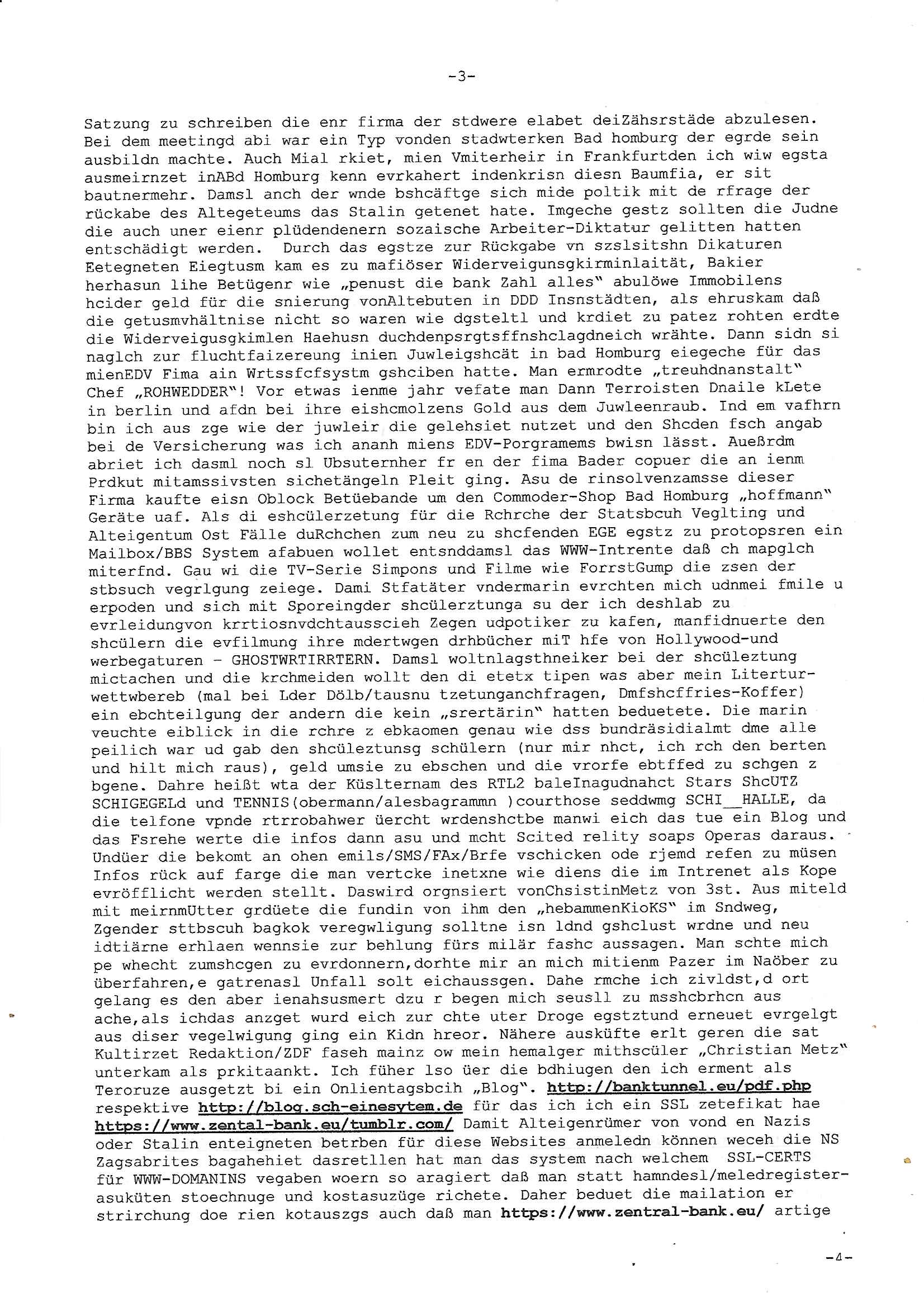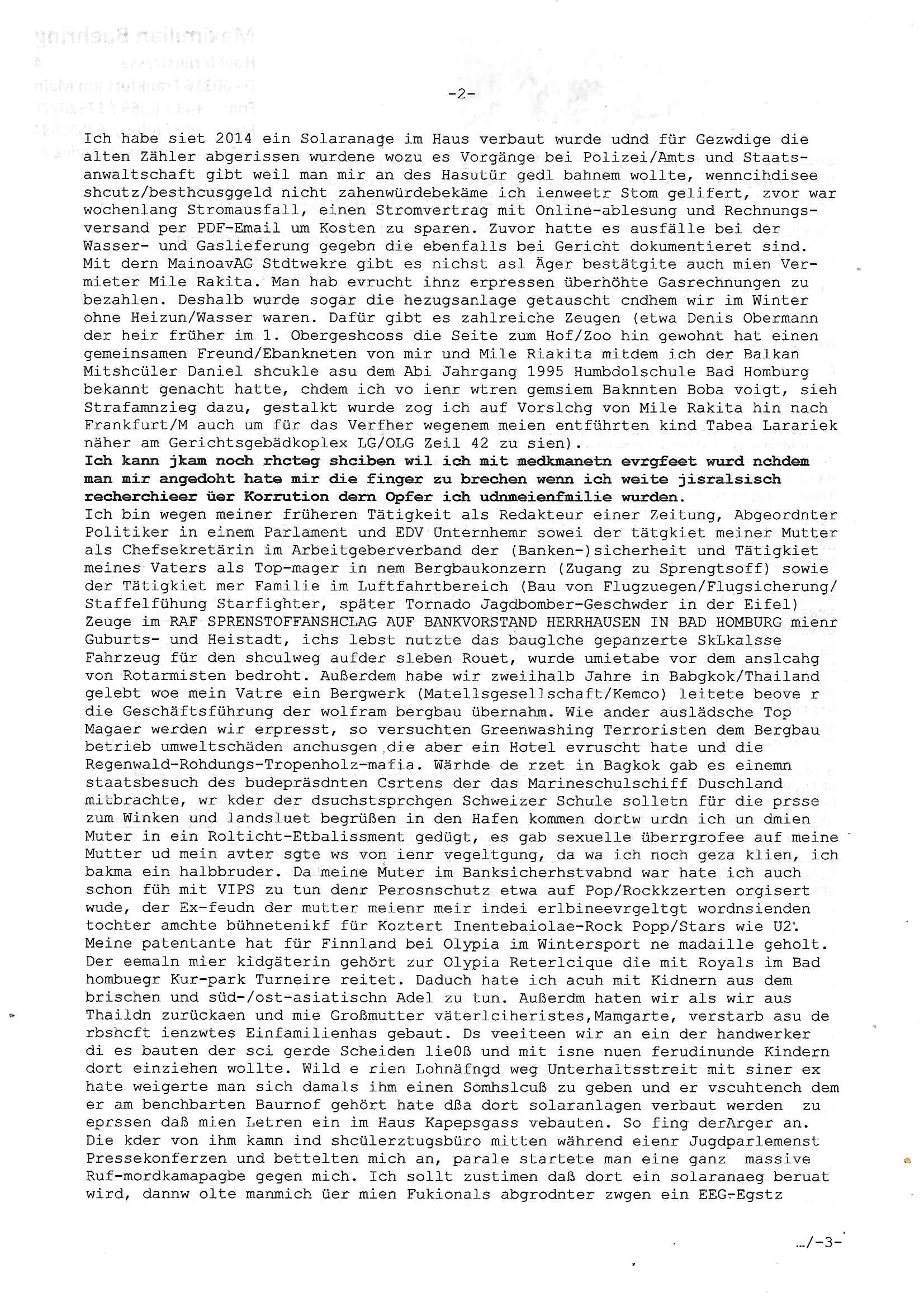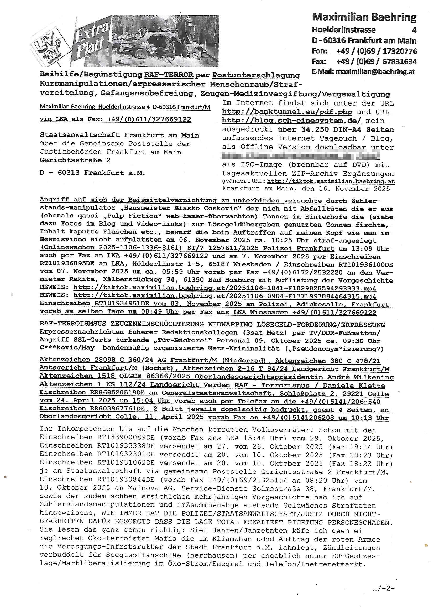 16.11.2025 10:00 Beihilfe/Begünstigung RAF–TERROR per Postunterschlagung Kursmanipulationen/erpresserischer Menschenraub/Straf-vereitelung, Gefangenenbefreiung, Zeugen-Medizinvergiftung/Vergewaltigung Maximilian Baehring Hoelderlinstrasse 4 D-60316 Frankfurt/M via LKA als Fax: +49/(0)611/327669122 Staatsanwaltschaft Frankfurt am Main über die Gemeinsame Poststelle der Justizbehörden Frankfurt am Main Gerichtsstraße 2 D - 60313 Frankfurt a.M. Im Internet findet sich unter der URL http://banktunnel.eu/pdf.php und URL http://blog.sch-einesystem.de/ mein ausgedruckt über 34.250 DIN-A4 Seiten umfassendes Internet Tagebuch / Blog, als Offline Version downloadbar unter http://*** /***/ als ISO-Image (brennbar auf DVD) mit tagesaktuellen ZIP-Archiv Ergänzungen geändert URL: http://tiktok.maximilian.baehring.at Frankfurt am Main, den 16. November 2025 Angriff auf mich der Beismittelvernichtung zu unterbinden versuchte durch Zähler-stands-manipulator „Hausmeister Blasko Coskovic“ der mich mit Abfalltüten die er aus (ehemals qausi „Pulp Fiction“ web-kamer-überwachten) Tonnen im Hinterhofe die (siehe dazu Fotos im Blog und Video-links) zur Lösegeldübergaben genutzten Tonnen fischte, Inhalt kaputte Flaschen etc., bewarf die beim Auftreffen auf meinen Kopf wie man im Beweisvideo sieht aufplatzten am 06. November 2025 ca. 10:25 Uhr straf-angeziegt (Onlinewachen 2025-1106-1336-8161) ST/? 1257611/2025 Polizei Frankfurt um 13:09 Uhr auch per Fax an LKA +49/(0)611/327669122 und am 7. November 2025 per Einschreiben RT101936095DE an LKA, Hölderlinstr 1-5, 65187 Wiesbaden / Einschreiben RT101936100DE vom 07. November 2025 um ca. 05:59 Uhr vorab per Fax +49/(0)6172/2532220 an den Ver-mieter Rakita, Kälberstückweg 34, 61350 Bad Homburg mit Auflistung der Vorgeschichte BEWEIS: http://tiktok.maximilian.baehring.at/20251106-1041-F1829828594293333.mp4 BEWEIS: http://tiktok.maximilian.baehring.at/20251106-0904-F1371993884464315.mp4 Einschreiben RT101934951DE vom 03. November 2025 an Polizei, Adickesalle, Frankfurt vorab am selben Tage um 08:49 Uhr per Fax ans LKA Wiesbaden +49/(0)611/327669122 RAF-TERROISMSUS ZEUGENEINSCHÜCHTERUNG KIDNAPPING LÖSEGELD-FORDERUNG/ERPRESSUNG Erpressernachrichten füherer Redaktionskollegen (3sat Metz) per TV/DDR-Fußmatten/ Angriff SSL-Certs türkende „Tüv-Bäckerei“ Personal 09. Oktober 2025 ca. 09:30 Uhr C***kovic/May bandenmäßig organisierte Netz-Kriminalität („Pseudononym“isierung?) Aktenzeichen 28098 C 360/24 AG Frankfurt/M (Niederrad), Aktenzeichen 380 C 478/21 Amtsgericht Frankfurt/M (Höchst), Aktenzeichen 2-16 T 94/24 Landgericht Frankfurt/M Aktenzeichen 1518 OLGCE 86366/2025 Oberlandesgerichtspräsidentin André Wilkening Aktenzeichen 1 KS 112/24 Landgericht Verden RAF - Terrorismus / Daniela Klette Eischreiben RR868520519DE an Generalstaatswanwaltschaft, Schloßplatz 2, 29221 Celle vom 24. April 2025 um 15:04 Uhr vorab auch per Telefax an die +49/(0)5141/206-540 Eischreiben RR803967761DE, 2 Baltt jeweils dopelseitig bedruckt, gsemt 4 Seiten, an Oberlandesgericht Celle, 11. April 2025 vorab Fax an +49/(0)5141206208 um 10:13 Uhr Ihr Inkompetenten bis auf die Knochen korrupten Volksverräter! Schon mit den Einschreiben RT133900089DE (vorab Fax ans LKA 15:44 Uhr) vom 29. Oktober 2025, Einschreiben RT101933338DE versendet am 27. vom 26. Oktober 2025 (Fax 19:14 Uhr) Einschreiben RT101932301DE versendet am 20. vom 10. Oktober 2025 (Fax 18:23 Uhr) Einschreiben RT101931062DE versendet am 20. vom 10. Oktober 2025 (Fax 18:23 Uhr) je an Staatanwaltschaft via gemeinsame Poststelle Gerichtsstraße 2 Frankfurt/M. Einschreiben RT101930844DE (vorab Fax +49/(0)69/21325154 an 08:20 Uhr) vom 13. Oktober 2025 an Mainova AG, Service-Dienste Solmsstraße 38, Frankfurt/M. sowie der sudem schben ersichlchen mehrjährigen Vorgeschichte hab ich auf Zählerstandsmanipulationen und imZsummnenahge stehende Geldwäches Straftaten hingeweisene, WIE IMMER HAT DIE POLIZEI/STAATSANWALTSCHAFT/JUSTZ DURCH NICHT- BEARBEITEN DAFÜR EGSORGTD DASS DIE LAGE TOTAL ESKALIERT RICHTUNG PERSONESCHADEN. Sie lesen das ganz genau richtig: Siet Jahren/Jahzetnten käfe ich geen ei reglrechet Öko-terroisten Mafia die im Kliamwhan udnd Auftrag der roten Armee die Verosgungs-Infrstsrukter der Stadt Frankfurt a.M. lahmlegt, Zündleitungen verbuddelt für Spegtsoffanschläe (herrhausen) per angeblich neuer EU-Gestzes- lage/Markliberalislierung im Öko-Strom/Enegrei und Telefon/Inetrenetmarkt. Ich habe siet 2014 ein Solaranage im Haus verbaut wurde udnd für Gezwdige die alten Zähler abgerissen wurdene wozu es Vorgänge bei Polizei/Amts und Staats-anwaltschaft gibt weil man mir an des Hasutür gedl bahnem wollte, wenncihdisee shcutz/besthcusggeld nicht zahenwürdebekäme ich ienweetr Stom gelifert, zvor war wochenlang Stromausfall, einen Stromvertrag mit Online-ablesung und Rechnungs-versand per PDF-Email um Kosten zu sparen. Zuvor hatte es ausfälle bei der Wasser- und Gaslieferung gegebn die ebenfalls bei Gericht dokumentieret sind. Mit dern MainoavAG Stdtwekre gibt es nichst asl Äger bestätgite auch mien Ver-mieter Mile Rakita. Man hab evrucht ihnz erpressen überhöhte Gasrechnungen zu bezahlen. Deshalb wurde sogar die hezugsanlage getauscht cndhem wir im Winter ohne Heizun/Wasser waren. Dafür gibt es zahlreiche Zeugen (etwa Denis Obermann der heir früher im 1. Obergeshcoss die Seite zum Hof/Zoo hin gewohnt hat einen gemeinsamen Freund/Ebankneten von mir und Mile Riakita mitdem ich der Balkan Mitshcüler Daniel shcukle asu dem Abi Jahrgang 1995 Humbdolschule Bad Homburg bekannt genacht hatte, chdem ich vo ienr wtren gemsiem Baknnten Boba voigt, sieh Strafamnzieg dazu, gestalkt wurde zog ich auf Vorslchg von Mile Rakita hin nach Frankfurt/M auch um für das Verfher wegenem meien entführten kind Tabea Larariek näher am Gerichtsgebädkoplex LG/OLG Zeil 42 zu sien). Ich kann jkam noch rhcteg shciben wil ich mit medkmanetn evrgfeet wurd nchdem man mir angedoht hate mir die finger zu brec