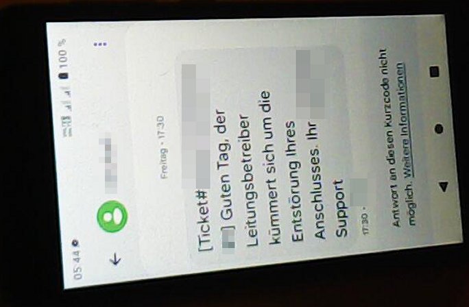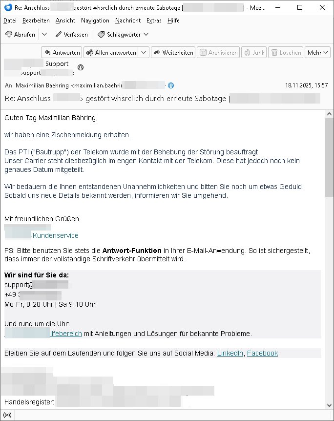 20.11.2025 12:00 -------- Nachricht -------- Betreff: Re: Anschluss **** gestört whsrclich durch erneute Sabotage [***] Datum: Tue, 18 Nov 2025 15:57:20 +0100 Von: *** Support <support@***> An: Maximilian Baehring <maximilian.baehring@***> Guten Tag Maximilian Bähring, wir haben eine Zischenmeldung erhalten. Das PTI ("Bautrupp") der Telekom wurde mit der Behebung der Störung beauftragt. Unser Carrier steht diesbezüglich im engen Kontakt mit der Telekom. Diese hat jedoch noch kein genaues Datum mitgeteilt. Wir bedauern die Ihnen entstandenen Unannehmlichkeiten und bitten Sie noch um etwas Geduld. Sobald uns neue Details bekannt werden, informieren wir Sie umgehend. Mit freundlichen Grüßen *** ****-Kundenservice PS: Bitte benutzen Sie stets die *Antwort-Funktion* in Ihrer E-Mail-Anwendung. So ist sichergestellt, dass immer der vollständige Schriftverkehr übermittelt wird. *Wir sind für Sie da:* support@*** +49 30 8095 1000 Mo-Fr, 8-20 Uhr | Sa 9-18 Uhr Und rund um die Uhr: Der ***-Hilfebereich < https://www.***/hilfe/ > mit Anleitungen und Lösungen für bekannte Probleme. Bleiben Sie auf dem Laufenden und folgen Sie uns auf Social Media: LinkedIn < https://www.linkedin.com/company/***/ >, Facebook < https://www.facebook.com/*** > *** *** *** Handelsregister: *** ... [0] "202511201200-0-1.jpg" |