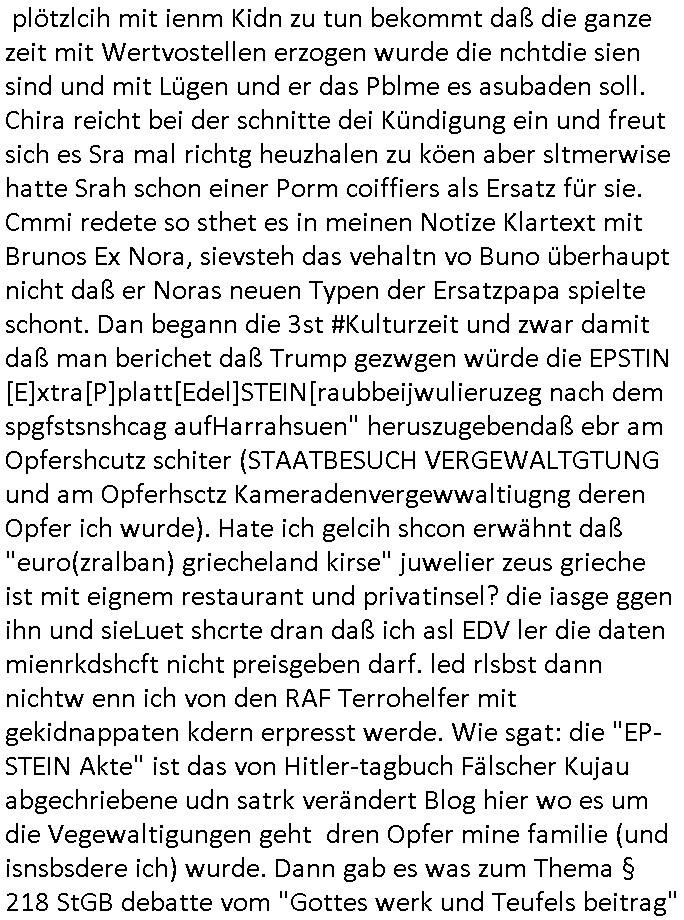 20.11.2025 07:00 Es ging dann auch noch um Fake - Bilder. Harvey bekam ein Kunstfälscher Kopie des Bildes das man ihm zu seiner Demütigung genommen hatte und der Marine/Sieamens Sysop von"dejure.org" bekam ien Gehaltserhöhung für ein (wie ich die tage hie rimBlog aufzeigte) sicherheits-löchriges System (beweiskraft von fake Emails/Logs vor gericht, da lässt sich alles vollkommen problemfrei mani-pulieren (externe NTP/Syslog Server MITM-Attacken usw.) "Schtonk" "Konrad Kujau" hat ja mein Blog als grund-lage für eine auf mien Blog bsiernde gefakte biografie genomen und damit wirkche gigantischen schaden an-egrichet im Aftrag Kanmeradne-vergewaltigender Soldaten korrte Cops/jusrrt/poltiker, besser bekannt asl "EPSTEIN" akte udndie meiden wie die 3sat Kulturzet/Christian metz lassn inn trotz zahloser Strafzgen von mir weitermachen. Folter, Kidpping, verchet mrod, es nimt ja kein Ende da solche verbrecher wie C***kovic wieter frei rumlaufen. Ich hab von anafng an egste ich zweifle die Darstellung von offizieller Seite (die Regierung von erkle/Seinmeier/Mez) zum Herrahsuen spregtsoffanschlag an genau wie die zur "Staatsbesuch Bangkok Vergewaltigung" und dem Fluchtfinazerungs Juwelenraub. Es gab egstre gege etwa 20:15 Uhr den Film "#theGame" mit Michael Douglas. Auch der bsiert auf dern Schweinereien die Kurdirektor-sohn Bruckmaier/Vera zanner (geb bergr) veranstalteten, man erknet kalr daß es sich bei der "fima #CRS Curotemr recretion services" um die kurbetre bad homburg handelt. Wie bei der kostelose Zeutungen austragen Türken Mafia ging e sum fehlender krankvesricherungen (im Original für "abgefrorene hände"). Wie Film #ClockwerkOrange zwang man den Hauptdarstellr mit Agkllammern dazu sich Filem anszushen, so wie man das mit mir tut, ich muß "okle dagboetr grüsts sien neffen als seit ### Tagn gfangder der RAF im geisel-drama von gladbeck (wo ja enrfüherer üer die medien denensie itevriews geben kommuniizieren)" artig siehe Blog das TV-programm auswerten. So wie ich es in meiner kindheit an der Kita mit dem Terrorclown "Krusty" = "Chaplin" Immitator mitbekam gab es einen puschartgen-überfall von liks-etxrmsichen gewrscfstappasztchicks (RAF/OstblockDDR) woe der sohn mitbekma wie sein Sohn vom Dach sprang. DEN GEFALLEN TUE ICH EUCH VERBRECHERN DEFITIV NICHT, ICH HAB INDER SHCÜLERZTEUNG BESCHWERDEN ÜER SDSICHE PAKTIKEN KORRUPTEE "AUSBLIDER" ER-HALTEN DENEN ICH NACH-GEHE / BRUTAL JOB-INITIARIONSRIETE USW. . ICh wrde dfür sogend aß dei Koltetn führiusgrigen die das alel sz evrtwrtenhaben den rst irhe lebsn imKanst sitzen das garantiere ich, agefngen bei Julweir zeus udn den bakscehristlute sowei dem metalgesellschaft und Persnaebrtungs sowei Copuetrfimen Managment genu wie beim öflich rechltichen rundfunk de rdi egaze zet lügt udn whalmiauation erögelcht. Auch mich evcht man ja inden scheibaren suuzid zu treiben. Eich mal im Blog nch Fien shcue wo Luet imberch von Bank/Juwelen- rab von Fenstismes der Dächern springen. Ich habe dazu imRahend er TV Porgrmmauswertung was geschrieben. Man chte indesm Zusmnhga auch auf die teure Uhr die Muchal Doglas asl Zhalugsmittel nutzt bie de Erprssung. Aber jezt erstmal zum 18:00 Uhr TV Vprbanporgramm von egstren, Mittwoch dem 19. November 2025 und den #Simpsons Auch dotr ging es um ien dämliche angebliche "Hochzeit auf den ersten blik" #surpriseParty. Dabei restaurierte Homer eine Bimmelbahn so wie mal die Bad homburger kommnalpolitk einen elektro-zug wi es sie in freizeitparks gibt duch die fußgägerzone innenstadt fahrn lassen wollte für kurgäste die nicht so gut zu fuß sind. siehe dazu auch das thema "golf-(platz-)wagen". Ahte ich währnt daß einer asu der weidgartestraße-kita? "immig" ne lehhamn großbhan (für den garten?) hatte udn daß aine muter un die trauzeugin mienr elze mal bei MÄRKLIN gearbeitet hatten, dem Modellbahnhersteller? jefdlls logte sich Marge bei eienr Dtaing Website ein wie die wlche Faru C**kovic für menschenschleuserei rings um den"staatsbesuch Vergewaltigung Zeugenschutz" aufmachen wollte und lernte dort einen verheirateten Mann kennen mit dem sie chatte, dabi ging es um ien TV Serie die beide ansahen, das bereits ewrähnete "Downtown Abbey", (siehe das Thema englisch Kirche eben Möbel Meiss und cento Bar am Ratahsuplatz nahe meien laten Büro in der louisenstraße in bad homburg). In Teil zwoe ging es um einen Kernspalter Kongress zu dem Homer fuhr wobi er die EDVbailugvshscte (an wen sichds mal niht irgenwnn rächt bei seiner mAppleDRM Abhängigkeit). Ählich wie mien Vater zetnah zum Uwe Bar-scheel mord bei der UNCTAD in GENF antraben musste im "BEAU RIVAGE" woh wiel Bruckier mal wieder Scheiße rzählt hat oder Zanner (geb. Berger) oder Rakita verucht men Home rumzuden un in den schwitzkastem zu nehmen. Es gab ein Stinkbomben Attentat aufd as AKW das er zusamman mit lisa verübte nachdm er plötzlich frühsport machet der form Richtung mekka beten. Öko Terroisten haten versucht ihn für hre Sache zu gewinnen. Das erinenrt mcih an das Stinkbomben attentat auf den Stadtbus. Home rbakm es mit FBI betan z tundi rgndlche bewußtseinevrädenrdne Substanzen shclckten und mit den #simpsons schliefen (handelt es sishc dai um S*x?) Dann begann wie imer #berlinNeukölln02407 respektive #berlinTagundNacht wo es darum ging daß Bruno nun ch Nora nicht zwgen wollte sienr tchter ell zu sgen daß er ihr vater ist wiel er doch selbst fäschlcherise angegeben hate der Vater von Jonas zu sein (wil ctahy ihn disbzüglch getäscht hatte) zu dem der Kontakt nun abgbsochn ist. Wenn ich wie Jona mitbäme daß man mic mien gazes lben lang belogen hat udas uch noch gauz beußt dann würde ich mit den Elterna uch nichstmer zu tun haben wollen. Udn genau davor hat Bruno Angst. Daß er es plötzlcih mit ienm Kidn zu tun bekommt daß die ganze zeit mit Wertvostellen erzogen wurde die nchtdie sien sind und mit Lügen und er das Pblme es asubaden soll. Chira reicht bei der schnitte dei Kündigung ein und freut sich es Sra mal