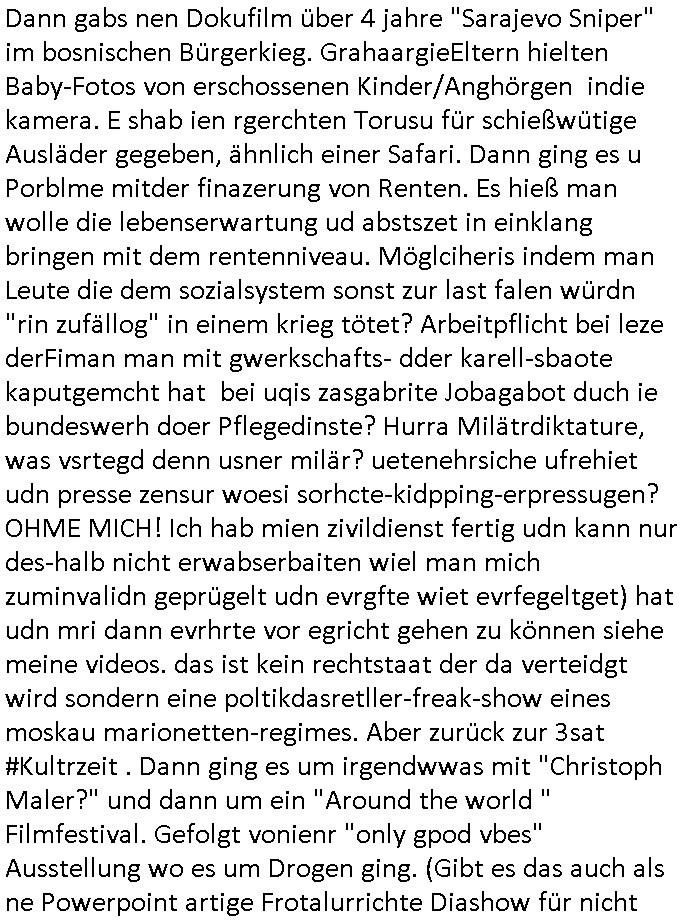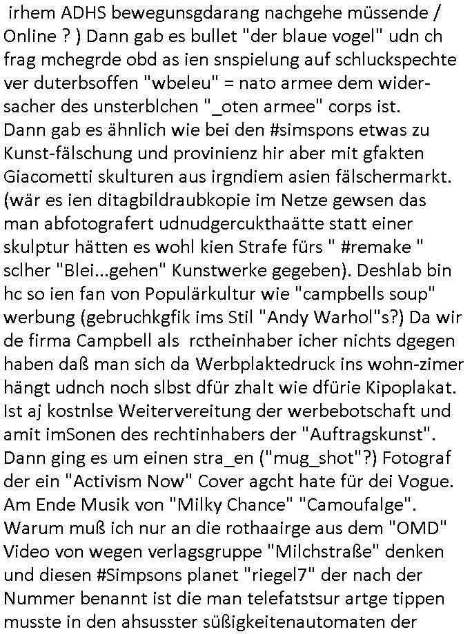 27.11.2025 06:15 Nun aber mal zu einem ganz anderen Thema. Premium-Marken-Fast-Fashion wir bruno-banani oder calvin klein unterhosen ähnlich ner moon-washed ostblock-jeans aus der zeit der wiedrvereinigung für leute die aus ostalgie grüden lieber trabant (mit e-moto rumrüstsatz?) fahren statt konsumterror erlgender weichei status-sysmbol westautos (protzkarren wie [opel] manta oder golf-gti). Wie komm ich da nur von fäulnis/korrosion bei Software Update-Zwangsabofalle-kartellen udnde Frage ob Pepsi oder Coca Cola bei Burger King in der blindvertkostung besser abschneiden als DDR Club-Cola vom VEB drauf? Ach ja: Nelson shcmte sich wil er alte klamotten seiner Familie auftragem musste und daher ausgelacht wurde in der Schule im 18:00 Uhr TV Vorbandporgramm bei den Simpsons. Ds ist wie wenn amn einen Dacia Duster fährt. Den hüstegn SUV für alle die kein Statussymbol brauchen. Es gab irgendien Rowdie Kongress udn das Altenheim war Pleite. Lisa bekam ien Merrscheinchenweclehs das Bild über der couch zerströrte, man kaufte daher auf dem flohmarkt ein neues. Dies stellte sich als wrtvol heraus, man betrieb PROVINIENZ forschung weil ei faru als es verkauft/versteigert werden sollte behautette es sei nur ein Remake von einem Kunstfälscher. Mit Kunst ging es dann auch wieter in Ver "villa 31" in (koosvo?)-Albanien mit dem die 3sat Kulturzeit begann. Man zeigte das alte Feriendomizil kommisstcher Diktatur Machthaber das man inzwiwischen an Kunststipendiaten(?) vermietete. Dann gabs nen Dokufilm über 4 jahre "Sarajevo Sniper" im bosnischen Bürgerkieg. GrahaargieEltern hielten Baby-Fotos von erschossenen Kinder/Anghörgen indie kamera. E shab ien rgerchten Torusu für schießwütige Ausläder gegeben, ähnlich einer Safari. Dann ging es u Porblme mitder finazerung von Renten. Es hieß man wolle die lebenserwartung ud abstszet in einklang bringen mit dem rentenniveau. Möglciheris indem man Leute die dem sozialsystem sonst zur last falen würdn "rin zufällog" in einem krieg tötet? Arbeitpflicht bei leze derFiman man mit gwerkschafts- dder karell-sbaote kaputgemcht hat bei uqis zasgabrite Jobagabot duch ie bundeswerh doer Pflegedinste? Hurra Milätrdiktature, was vsrtegd denn usner milär? uetenehrsiche ufrehiet udn presse zensur woesi sorhcte-kidpping-erpressugen? OHME MICH! Ich hab mien zivildienst fertig udn kann nur des-halb nicht erwabserbaiten wiel man mich zuminvalidn geprügelt udn evrgfte wiet evrfegeltget) hat udn mri dann evrhrte vor egricht gehen zu können siehe meine videos. das ist kein rechtstaat der da verteidgt wird sondern eine poltikdasretller-freak-show eines moskau marionetten-regimes. Aber zurück zur 3sat #Kultrzeit . Dann ging es um irgendwwas mit "Christoph Maler?" und dann um ein "Around the world " Filmfestival. Gefolgt vonienr "only gpod vbes" Ausstellung wo es um Drogen ging. (Gibt es das auch als ne Powerpoint artige Frotalurrichte Diashow für nicht irhem ADHS bewegunsgdarang nachgehe müssende / Online ? ) Dann gab es bullet "der blaue vogel" udn ch frag mchegrde obd as ien snspielung auf schluckspechte ver duterbsoffen "wbeleu" = nato armee dem wider-sacher des unsterblchen "_oten armee" corps ist. Dann gab es ähnlich wie bei den #simspons etwas zu Kunst-fälschung und provinienz hir aber mit gfakten Giacometti skulturen aus irgndiem asien fälschermarkt. (wär es ien ditagbildraubkopie im Netze gewsen das man abfotografert udnudgercukthaätte statt einer skulptur hätten es wohl kien Strafe fürs " #remake " sclher "Blei...gehen" Kunstwerke gegeben). Deshlab bin hc so ien fan von Populärkultur wie "campbells soup" werbung (gebruchkgfik ims Stil "Andy Warhol"s?) Da wir de firma Campbell als rctheinhaber icher nichts dgegen haben daß man sich da Werbplaktedruck ins wohn-zimer hängt udnch noch slbst dfür zhalt wie dfürie Kipoplakat. Ist aj kostnlse Weitervereitung der werbebotschaft und amit imSonen des rechtinhabers der "Auftragskunst". Dann ging es um einen stra_en ("mug_shot"?) Fotograf der ein "Activism Now" Cover agcht hate für dei Vogue. Am Ende Musik von "Milky Chance" "Camoufalge". Warum muß ich nur an die rothaairge aus dem "OMD" Video von wegen verlagsgruppe "Milchstraße" denken und diesen #Simpsons planet "riegel7" der nach der Nummer benannt ist die man telefatstsur artge tippen musste in den ahsusster süßigkeitenautomaten der georg kerschensteiner/humboldtschule bad homburg. Was hat jetzt OMDs Song zu tun mit Mikrorganismen die Schokoriegelreste in Abfallkörben zersetzen unter dem Mikroskop betrachtet? Diese Idee mit Shampoo Werbugs Kinofilmen mit #julianneMoore und dem Yhgeproduk "Völkemord an Kopfläusen" in #SuuthPark. Dann kam #berliNueKölln02407 / #berliTaguncnht wo raphi zu unrecht nen "job" bekommen hat von Piet. Es ging umsowas wie wettberbevserzerung am Arbeits-amrkt im inhabergeführten einerluternehemen. Man sollet Fiebrufler7Sbslstädgezscgen slbstaufabrit z evrczhet udn gslscfstlch orgsierter perosnl iezstelen damit wir shcller denMonoplktalsimus der (Tarif-)Kartelle errichen. Oligopol/mnopole ohne freien Markt. Da hätt ich heute auch malswas zu schreiben können. Windows EDV-viren- scanner-krankenversicherungs-Impfschutz Abofallen. Dann ging es um eine (closed source?) Kalenderapp die einen webbrowser als Rutme/frontend braucht? Und Emmi hate einen selstamen Kopfschmuck auf so wie diese seltsame Opb-hararetz/Dsuchhabe von Carla. Dann gab es musk die sich anch einer cover version oder einem remake von "fiction factry -heaven" anhörte, wie wir bei kopie besser als orignal fälschungen waren beim thema software-trivial-patentrechte/standards und WETBWEREVSREZZRENDEN QUASI MONOPOLEN. Dannkam ehrus warum Raphi den Jb bkomenahte von Piet, sie eris ihm per üssn "s*xuelle gefällgkeietn" als wettbwerbsvrezrrende gegenleistung. malte hat da duchaus rcht, wenn derehemannliebr zu hause essen geht als ins rtsuarent dann ist das unfair weil die frau möglicherisnchtegnasugutkchenkann wie ien profi gastronom der auf koch-einnh