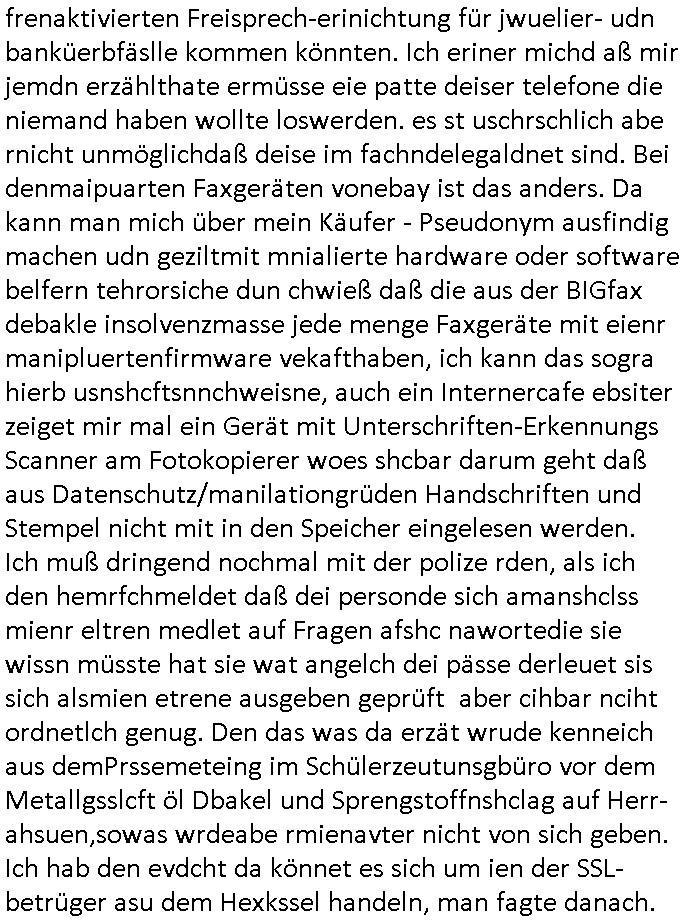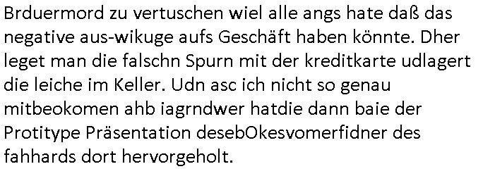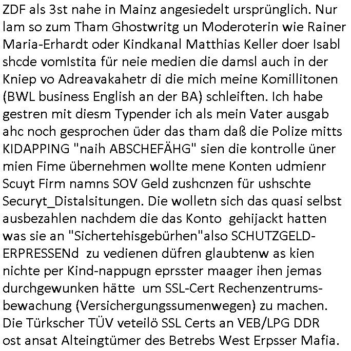 08.12.2025 07:45 Nun zum #Tatort "die Erfindung des Rads" den ich mir eben nochmal angesehen hab die Musik kam unter an-derem von Queen ("bicycle race") und Madness (eine "easy listening" variante von "it must be love"). Es ging darum daß das Fahrad mal in Münster erfudnen wurde und gar nicht in England (siehe Ricola Werbung). Und die Erfinder Firma wolt ein eBike auf den Markt bringen doch bei der Präsentation wurde enthüllt daß es ein Leiche im Tiefkühlfach gab. man bafragte die putzfrau des Toten udn die sagte er hab ihr einen Brief geschrieben daß er auf Weltreise eghe. Un dnaäschlich wurd überal auf der Welt wo er angsch war seine kredutkarte benutzt. Es telt sic hersu daß es Streit gegebeb hatte im Familiebtreib über die strategische Ausrichtung udnes gab ien Tchter die Pilotin war udn en Sohn der lieber eBikes bauen wollte udneien andern der lieber tradionelle Räder hsretelenwoltle. Eienr von beiden Erebn war der Tote. Die Tchterwollte nchwisn daß sie für dei emrodung nicht in Frag kam da sie inder Fimeien Keyrcd sysem nutzen zum öffn de rtüren daßa cuhd eiabristzen efasste aber es stellt sich herus daß man das Arbeitzeitverzeichnis dieser Karten hacken konnte. Man bakm hrus daß dem toten mann die Finger gebbroche wordne waren. Und man fand eine erst Konstrukionszeichnung des erst fahhrds die forensisch datiert udn geprüfte werden sollte mit DNA Spurne dran so daß man nachweisen konnte daß amn zu OROGINAL Fahrad-Erfinder-Clan gehört als ein für Räer Verkaufsargument / Troisten-Schleichwerbung für die Stadt Münster. Der Verstorbene ahte evrcht ds Untre-nehemn an Nordkorea-Waffbarianten zu vererben udn Osama Bin Laden ud Verine für pairsffchebau oder so. Man sah daß er der eiegeb Familee die Erb-Nachfolge nicht gönnte. Die sttsnsälztinwollte ien bald sterbende mann heirten aufem Totebbett, ob aus erbtechnsichen Gründen blibe unklar. Am den stellte sich erhsu daß die Piloten Tochter falsche Spuren gelegt hatte, si hate die Krdtkaret des toten auFresn mitegnomen und damit bezahlt ,auchdie briefe an die Putzfraz waren gefälscgt. Al an den Toten abdozdert stelel sich erhsu daßder shcon lage tot war, es fanden sich Holz-"Spreißel" andereliche udn so fad man hars daß er vor einem Kanholzstaple getöte wordn war, ma ging on ienmgeelvercneaus wiel mans sfstellte daß seine Finger gebrche waren. Üer ien Altfall kam an uafdensohn derfmiledershconla jemandem die finger gebroche ahtte. Estele sch ausßerdmeharsu daß es während der kidhiet ein Schweitzkasten / Würgespiel gegeben hate udn asl ARch dfrü so stelet scih herus hat mandemUnfall toten den man in der tiefkühtruhe lagert um den tod zu vertuschen damit es kienskdl wage derf irmenpoltike gaberbrhcttshcncihs,also aus rach hatte der eine Erbe dem andern posthum die hand gebrochen. Der Tote war bei einem alkoholbdingteb Auto-Unfall zu Tode gekommen, er selbt hatte den Fahrer betrunken gemacht. Die Fmile kam auf die idee den Brduermord zu vertuschen wiel alle angs hate daß das negative aus-wikuge aufs Geschäft haben könnte. Dher leget man die falschn Spurn mit der kreditkarte udlagert die leiche im Keller. Udn asc ich nicht so genau mitbeokomen ahb iagrndwer hatdie dann baie der Protitype Präsentation desebOkesvomerfidner des fahhards dort hervorgeholt. https://tvinfo.de/fernsehprogramm/2243946451-tatort [0] "202512080745-0-1.jpg" [1] "202512080745-0-2.jpg" [2] "202512080745-0-3.jpg" |