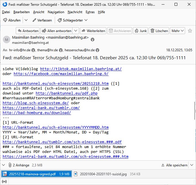 19.12.2025 04:30 -------- Nachricht -------- Betreff: Fwd: mafiöser Terror Schutzgeld - Telefonat 18. Dezeber 2025 ca. 12:30 Uhr 069/755-1111 Datum: Thu, 18 Dec 2025 13:05:40 +0100 Von: Maximilian Baehring <maximilian@baehring.at> An: hr-info@hr.de, thema@hr.de, hessenschau@hr.de nochmal von hier falls es im spam filter landet -------- Weitergeleitete Nachricht -------- Betreff: mafiöser Terror Schutzgeld - Telefonat 18. Dezeber 2025 ca. 12:30 Uhr 069/755-1111 Datum: Thu, 18 Dec 2025 13:02:50 +0100 Von: Maximilian Baehring <maximilian.baehring@***> An: hr-info@hr.de, thema@hr.de, hessenschau@hr.de https://www.fr.de/frankfurt/offenbach-sonderermittlungen-zu-brandserie-in-frankfurt-und-93877489.html schauen sie mal am 06./07. Oktober 2020 in mein Blog http://banktunnel.eu/sch-einesystem/20201007.htm kann das als inder mit enführtemkidn voll bestägtigen, das hängt miteinander zusammen https://www.fr.de/frankfurt/scheinrechnungen-aufgeflogen-millionen-euro-betrug-in-sicherheitsbranche-zr-94079175.html https://www.hessenschau.de/panorama/frankfurter-justizskandal-um-korruption-bewaehrungsstrafe-fuer-it-unternehmer-v2,prozess-korruption-102.html Alles Shcutzgelderpressung/Korrution mit Terror Hintergund um von Stalin enteignete jüdische Osblock Altbesitz (treuhand Rowdder/herrahsuen) der (nicht) zurückgegebe werden soll auch Rohtsoff/Öl-Aktien(Elf Aquitaine metallgesellschaft öl/Nalyn/northStream/gazporm /ukraine und gazakrieg) siehe V(ideb)log http://tiktok.maximilian.baehring.at/ oder http:s//facebook.com/maximilian.baehring.9/ http://banktunnel.eu/sch-einesystem/20251218.htm ([1] auch als PDF-Datei (sch-einesystem.168) ([2] zum download unter http://banktunnel.eu/pdf.php #herrhausen#RAFterror#badHomburg#zentralBank http://blog.sch-einesystem.de/ oder https://zentral-bank.eu/tumblr.com/ http://bad-homburg.eu/download/ --- [1] URL-Format http://banktunnel.eu/sch-einesystem/YYYYMMDD.htm YYYY = Year/Jahr, MM = Month/Monat, DD = Day/Tag [2] URL-Format http://banktunnel.eu/tumblr.com/sch-einesystem.###.pdf ### = fortaulfene, seit 84 monatlich um 1 erhöhte Nummer wahlweise als PDF oder HTML Datei, auch per HTTPS (SSL) https://zentral-bank.eu/tumblr.com/sch-einesystem.###.htm === https://www.fr.de/frankfurt/scheinrechnungen-aufgeflogen-millionen-euro-betrug-in-sicherheitsbranche-zr-94079175.html https://www.hessenschau.de/panorama/festnahmen-nach-explosion-vor-shisha-bar-in-offenbach-v3,offenbach-explosion-102.html https://www.hessenschau.de/panorama/explosionen-und-brandanschlaege-im-rhein-main-gebiet-polizei-ermittelt-in-neun-faellen-v3,brandanschlaege-serie-rhein-main-100.html https://www.hessenschau.de/panorama/frankfurter-justizskandal-um-korruption-bewaehrungsstrafe-fuer-it-unternehmer-v2,prozess-korruption-102.html === -------- Nachricht -------- Betreff: Fwd: mafiöser Terror Schutzgeld - Telefonat 18. Dezeber 2025 ca. 12:30 Uhr 069/755-1111 Datum: Thu, 18 Dec 2025 13:04:10 +0100 Von: webmaster@zentral-bank.eu <webmaster@zentral-bank.eu> An: hr-info@hr.de, thema@hr.de, hessenschau@hr.de -------- Weitergeleitete Nachricht -------- Betreff: mafiöser Terror Schutzgeld - Telefonat 18. Dezeber 2025 ca. 12:30 Uhr 069/755-1111 Datum: Thu, 18 Dec 2025 13:02:50 +0100 Von: Maximilian Baehring <maximilian.baehring@yahoo.com> An: hr-info@hr.de, thema@hr.de, hessenschau@hr.de [...] === Datum Name / Rufnummer Dauer (hh:mm) 18.12.25 12:32 0691551111 0:15 18.12.25 12:26 0692578290 0:01 [0] "202512190430-0-1.jpg" [1] "202512190430-0-2.jpg" [2] "202512190430-0-3.jpg" [3] "202512190430-0-4.jpg" [4] "202512190430-0-5.jpg" [5] "202512190430-0-6.jpg" [6] "202512190430-0-7.jpg" |