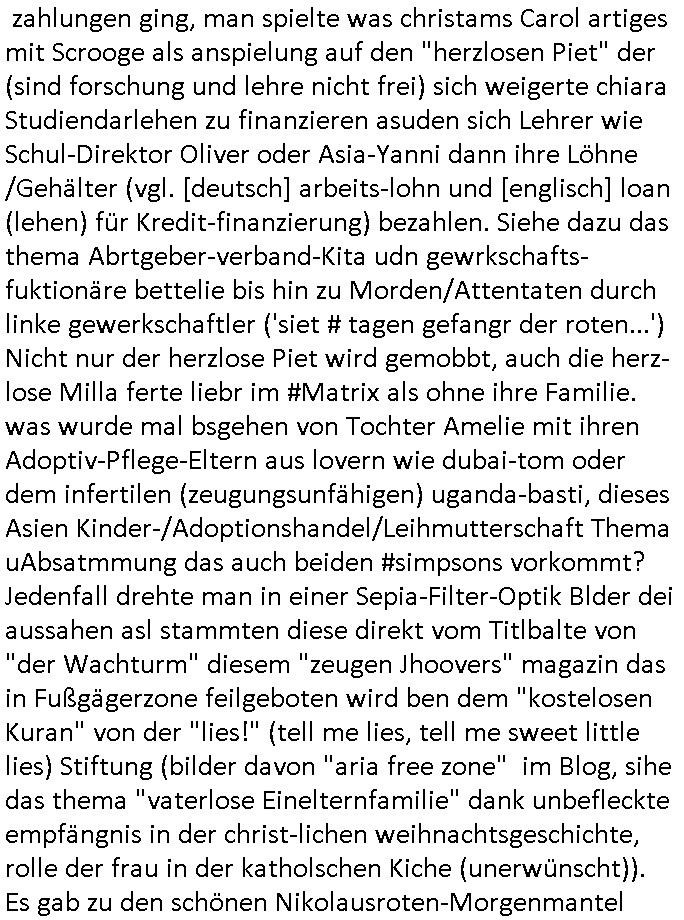 20.12.2025 02:30 Nun zum 18:00 Uhr TV - Vorabendprogramm von gestern, Freitag dem 19. Dezember 2025. Als ich fertig war damit zu versuchen meine Eltern zu informieren daß mir mal wieder zähne aus dem Mund brechen weil Zahnärzte mit ihren Komplizen bei Krakenkassen und wiederum deren Komplizen bei Jobcntren absichtlich gepfuscht haben udn den Fernsher einschaltete sah man gerade wie Homer in einem Junkie Viertel aufräumte zusammen mit Nachbar Ned Flanders und dafür von der Kirchengemeide belohnt wurde mit einer Reise zum Grand Canyon. Auf dem weg dorthin gab es eine Szene mit einer Bären - Parkplatz erleichterung. Im Grand Canyon stiß man auf ein film-team das man angelich ausplünderte. Gabes da nicht ahc mle ien szen wo die #simpsons bei eienr "scripted Reality" serie mit-machen in einem Hotel am Flughafen und zu früh aus-scheiden wo sie leben müssn wie zur jahrhundert-wende? Dann ging es passend zur 90 Mrd Spende für Waffen an die Ukraine aus eigefrorenem russischen Staatsvermögen (Oligarchen Yachten, Steuer-/Kapitalfucht Zaren-familie) um aserviertes Geld daß sich Chief "Spearmdtin" #wieGum-P aus der Beute krimineller ruabzüge in die eigene Tasche steckte (siehe dazu auch MEINE Idee zu #aSeriousFlanders im Stile eines Tarantino Films). Homer sollte ein Rede halten und hatte angeblich lampenfiber,d as ist fsch, richtg ist daß Burns der ja imer alles von seinen Ghostwerter-Anwälte schreiben lässt (siehe mikeGross #Suits) ihm sein Rede-manuskript stahl (per EDV-hack wie Frau C**kovic Inhate küftegr simposn folgen aus mien Blog das sie unerlaubterweise pseudononyosuiert nchdem sie dch ien medikanetn-ver-giftung dertwgen ich nicht mer shciben kann ordlche erricht hat daß man mir eine Sekrtäterin bezahlt damt mien aussge fürs gericht ditrert werdnekanndwobe sie aber das Diktat sinetsletend verfälscht und mienPost abfängt?) Es entstand der Mythos Hoemr hab angst ien rde zu haten "ANST IM DUKLEN ZU REDEN" (stimmt nicht, ich erinnere mal als Gewebis epximrnt an die as der Stehgreif Reden die wir im BWL Studium proben sollten oder fats imemr gut bewertete Refate von mir in der Schule). Ich glaube da gings eher darum einem von der Balkan- Geburtstags-clown-Mafia (siehe Vater Kur-Einstellungs-Gesundheitscheck musterung "Suizid" Film #theGame/#fullDisclosure mit Michael Douglas) nen Impro-Comedy "Caching Beratervertrag" zu geben von dieser "U-Bahn Kontrollöre" a-cappella Sychornsprcher Kidnapper Mafia um Matthias Keller vom Kinder-fernsehen. Homer sollte als "open microphone / Spke word" veranstaltung "Stslsistch hsuporzess gerichts-poesie" Stand-Up Comedian lernen auf Bühnen vor großem Publikum zu sprechen. Ich gabe es gibt da ganz andere Gründe für sie anst vor ien Auftitt, einfach mal an "Monika Lewinsky" alias "vera Zanner (geb. Berger)/Kita-heirat Ehefrau Tina Kreuzer" denken siehe diese "Blues brothers" Stalkerin aus dem Stadionkatakomben-Tunnel beim "th_Police" Auftritt. Angst vor Kidapping (Kongress-Sauna Anschlag Folge)/"herrhausen Attentat" Spreng-stoff-explosionen. Auch das thema der Rede im Kollegekreis wurde klar: Homer saß im Bunker der Studios (das ExtraPlatt Schülerzeitungsbüro, Humboldt-schule, Jacobisstraße 37, 61348 Bad Homburg) und machte zur "MAUER-FALL" Zeit Wahlkampf per TV statt per "Straßenwahlkampf" wegen der Stalerinnen - Gang. Es gibt noch ne zwote solche "Wahlkampf-panne" folge in den #Simpsons dort tritt #tomHanks auf udn st er müsse als Stunt-Double einsrpringen für den Präsidenten wegen der Subprrme oder auch "Euro-Krise" damals. Dann kam #berliNueKölln02407/#berlinTagUndNacht wo es um Christ-Stol_en Weihnachst-bäckerei "taste of" Tsraisttster Koch-Show Product-Placement Content ging. Aueßrdem darum daß Trennusgkder kien Lust af Weih-nachten haben wielsie kien intakte klein-Famile haben mit ihen liebcheneltren udn sie das Fest sie stets vor LOYALITÄTS-/GEWISSENS-KONFLIKTE stellt, fier ic mit demieneltzreteil dann mcheichd an dnern traurig/sauer. Auch Krätze bakm mal wieder Besuch von seinem Sohn, dem Trennungs/Scheidungskind "Ben Daniel" der sich wohl erher sein "zusatzeltetiel- satt gemeisames Eltern" Geschenk abholen wollte. Das Kind wurde genötigt bei einem Krippen-spiel/theatersrücke mitzumachen wo es ums erbetteln von Geld aus eventuellen weihnachtsgeld zahlungen ging, man spielte was christams Carol artiges mit Scrooge als anspielung auf den "herzlosen Piet" der (sind forschung und lehre nicht frei) sich weigerte chiara Studiendarlehen zu finanzieren asuden sich Lehrer wie Schul-Direktor Oliver oder Asia-Yanni dann ihre Löhne /Gehälter (vgl. [deutsch] arbeits-lohn und [englisch] loan (lehen) für Kredit-finanzierung) bezahlen. Siehe dazu das thema Abrtgeber-verband-Kita udn gewrkschafts-fuktionäre bettelie bis hin zu Morden/Attentaten durch linke gewerkschaftler ('siet # tagen gefangr der roten...') Nicht nur der herzlose Piet wird gemobbt, auch die herz-lose Milla ferte liebr im #Matrix als ohne ihre Familie. was wurde mal bsgehen von Tochter Amelie mit ihren Adoptiv-Pflege-Eltern aus lovern wie dubai-tom oder dem infertilen (zeugungsunfähigen) uganda-basti, dieses Asien Kinder-/Adoptionshandel/Leihmutterschaft Thema uAbsatmmung das auch beiden #simpsons vorkommt? Jedenfall drehte man in einer Sepia-Filter-Optik Blder dei aussahen asl stammten diese direkt vom Titlbalte von "der Wachturm" diesem "zeugen Jhoovers" magazin das in Fußgägerzone feilgeboten wird ben dem "kostelosen Kuran" von der "lies!" (tell me lies, tell me sweet little lies) Stiftung (bilder davon "aria free zone" im Blog, sihe das thema "vaterlose Einelternfamilie" dank unbefleckte empfängnis in der christ-lichen weihnachtsgeschichte, rolle der frau in der katholschen Kiche (unerwünscht)). Es gab zu den schönen Nikolausroten-Morgenmantel tahreafführungs Bildern von "christmas carol" Hausboot Weihnachtsfeier "jealousy" Bilder vom herzlosen Piet und Raphi ud Milla die alleine im Büro Chpagnerparty feierte. Schul-Direktor Oli hatte ein WG - W