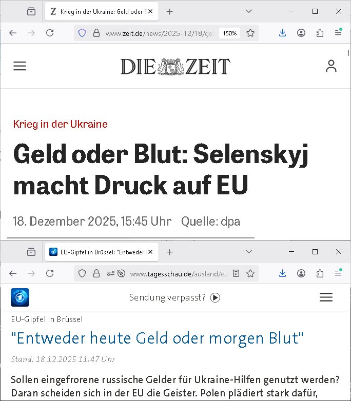 20.12.2025 04:45 https://www.zeit.de/news/2025-12/18/geld-oder-blut-selenskyj-macht-druck-auf-eu https://www.tagesschau.de/ausland/europa/eu-gipfel-bruessel-ukraine-russische-vermoegen-100.html [0] "202512200445-0-1.jpg" |