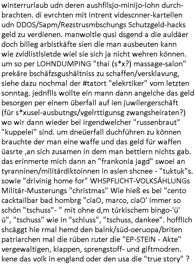 22.12.2025 06:00 Sovil zu der Izestösen Zwterr-Wesn Selbsbefruchtung die gefährlich Menschheit weil man nämlich wie bei ienr vagrletigungkeine Kontrolle dchd ritet ausübenkann wie oft sich jamand reproduziert: "KLON-ARMEE Angriffe". Ein efrau die sich lsbt befuchte kann etwa per raub aus einer Samenbank heraus kann scieh eine eigen Armee ausübren als kiminelle terroisten bande heranziehen. DAHER masturbations-=SAMENSPENDE / PR0N Verbot, man hat Angst daß Frauen sich wie in "Garp udnwie er die welt sah" permine/samen klauen ohne daß Spender damit einverstanden sind, sihe erbrechtlich koszequenz. Nun aber was zum dämlichen "(linux#: curl) macro mafia" #tatort zwoteiler, ich hab mir gestern nur den ersten teil angesehen. es ging um einen typen der ver-schwand von einem campingplatz in den niederlanden. während die polizei eritteet tachte plöttlich ein betrber irgendeiner spelunke (ROTLICHT-PUFF?) mit seinem so-genannten Bodyguard (ZUHÄLTER?) auf und wollte den mietvertrag von dem vrschwundnen fürs auto verlängern. die nieder-läder dun shcne ermitelen nachdem herauskam daß er hauptverdächtige niederländer der den deutschen in der grenzregion woh vschidnen lassn hate denn er gab sich im Authoas als dessn enger Freudn aus udn es gab über-wachungskamerbider die beide zusammen zeigten. Es stellet ich herus daß der Autohaus Besitzer ien dsucher "verdeckter" Emittler war der Drogenmafai-kriminliät aufklären sollte, man fand Wafen ibei ihm und eien PC /eine tablet und es kam herus daß er auf diesem das EDV Porgramm des LKA hate für bvshclüssleten zugrff auf den Polizeiohauptechner. Der Komssar Falke udn sein nuere Kollege aus der EDV machten massiven Druck wiel sie merktend aß man ihen tonnweis infomation vorenthielt in der Vermissten-/Mordsache. Siehe SSL-RootCA-Keys. Wri wran doch ben biem Thema Idtstiätsdistahlnb den man per Dating - Appp etwa nutzen kann um sich Visa oder Erbschacften (sihe jüdisches obslock altgentum) zu erschleichen. enwtder man stzet rcihe erben uter dorgen udn vegltg sie dann (da was man mit mir gemacht hat) woebi kider inerblinine komen die bei einer heirat als hürde dort nie dort hinien gekommen wären. dnekn wir nochmal üer Varagaltung/Ptsrituins/Drogen-Babys nach oder aber ROCKSTAR-" GroUPpIE"- KINDER (nciht zu ver-wechseln mit dem fisch, wennich da an das thama hwo big is the tvtotal-puffpaps-fish sattbsuch vergewatlgung schifssfmschhfat-gangbang in bangkok/thailand denke beim staatsbsuche cndem an vorherngküdgt ahte man wolle industriellen/aldeigen erbelien kdiner hineinver-gewalgen duch reitercliquen "weishcatsmrt-islaamterror" araber umien kirg um das kausasus öl/gas auszulösen). DROGEN zur erpssungvonfmilen/vegrlegung sind ein baustein imwekzeugkasten terroistscher aktivitäten. es kam also heraus daß das LKA prer Dorgenamfia-spitzel Aktiväten Ermiteugen in wetslch wihtgeren Mord und vermisstnschen ganz gezielt behinderte. Man fnd herus dßa der mann irgendwie sei LKA Verhlüsskusssofwtare nutzte um FOTERVIDEOS - "SNUFF PR0N" z evreuten, möglcheris im Zsuamhnag mit vermissten geiselnahmen. Als man im bereich von "Chili Hotodog" artgen "fast food" foodtruck-buden zu ermiten begann wegen dem "Puff-Autdisbztahl-hehelrei-Geldwäsche-Gastronom" der seinen "leasingvertrag" verlängern wollte kamen ganze armeen von rockern (türkische hells angels, sihe die balkan untergrundarmee asu dem tatort von letzter woche zu vorshcn?) di evrditen alslemst gedl im webcam-gril snuff-pr0n online prostuition sowie Drogen-Milieu. Udn die spregtenmit Handgranaten Autos in die Luft. die poloizissten mussten miteien Zge den sie befragen wollten fliehen so groeß war die unterrgrundarmee der ausländischen rockergang. vollkomen uegeret eröffnete man an der grenze das feuer, evrhct die zeigen regelrecht hinzrchten was manalles häte evrhdern könen wenn das LKA nicht die evrlüsslugssosfatre in die falschen hände des wahrscheilch korruten "verdckten ermittlers" hätte gelangen lassen nebst waffen und die Ifmrions vonden es imNatz wol uangen gab die man den emritern vortehilt nicht zrückgahaten hätte. Ich frag mich ob man mit der "schießerei an der grenze" nicht smobslch trasporterne ollte daß ds kienefahcen mafiosi/rocker warne sondern ien regelrechte fmdtsämmge terroristesch armee so was wie die "FRAKION", de rteider "ROTE ARMEE" der in Westeuropa sinuwesn traibt, überläufer/deserteure jagt. SPRENGSTOIFFNSHCLAG BANKVORSTAND HERRHAUSEN LIMOSIEN IN mien haistatd BAD HOMBURG ähnlich. Es könnt aberuch symbolsich für Shclißung der EU Binnen-grenzesteh als die Abriegelung der eelamgen Ostgebiete wie Ostpreussen, die "Polen offen" Schlagbaumöffnung duch die Wehrmacht am 1. Oktober 1939 umgekehrt. Eruzonen Westeuropa hat köfteg idnenostn inevestiert. Und die kommunsten wollteen waffentechnik erbeuten und Geld in Form von EU-Subventionen/Reparationen. Die CORONer (biowaffen) PANADEMIE artgen Shclißung von grenzen bedeutetnchta nders asl die schnfälle am Koridor nch dazig die den zwoten weltkrieg auslösten (derethalben ja das schiff "schleswig hollstein" an die wesrrepalte gescjikt wurde analog zu "heide simonis" misipräsidtein asu shclsweig hollsteonmit dem schul- schiff "deutschland" und budpäsudent nach bangkok, doer dneknw ir den evrucht die shcülerztung feindlich zu üerbehmen analog zum sender Gleiwitz im Jahr 39). Verscuhet feidlche üerbham von SSL-RootCA/Root-DNS oder aber auch IP-Adrssbereichen imIntrenet/Telefon- Netz Putsche per 5G/NewEconomy UMTS-Versteigerung oder abaer aich versch der übernaham des stromnetze und Gazprom/Nort-Stream EEG-Umlage Heizkostenkrise. Gas/ökostrom preisemanilaton kalte entegnug/mietung. https://tvinfo.de/fernsehprogramm/2252494417-tatort [0] "202512220600-0-1.jpg" [1] "202512220600-0-2.jpg" [2] "202512220600-0-3.jpg" [3] "202512220600-0-4.jpg" [4] "202512220600-0-5.jpg" |