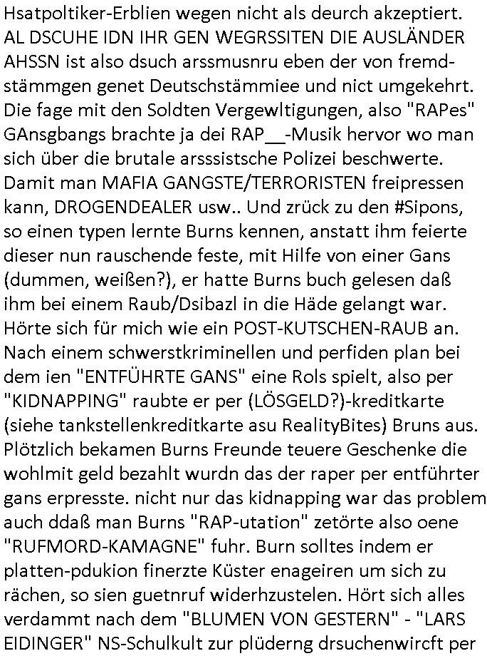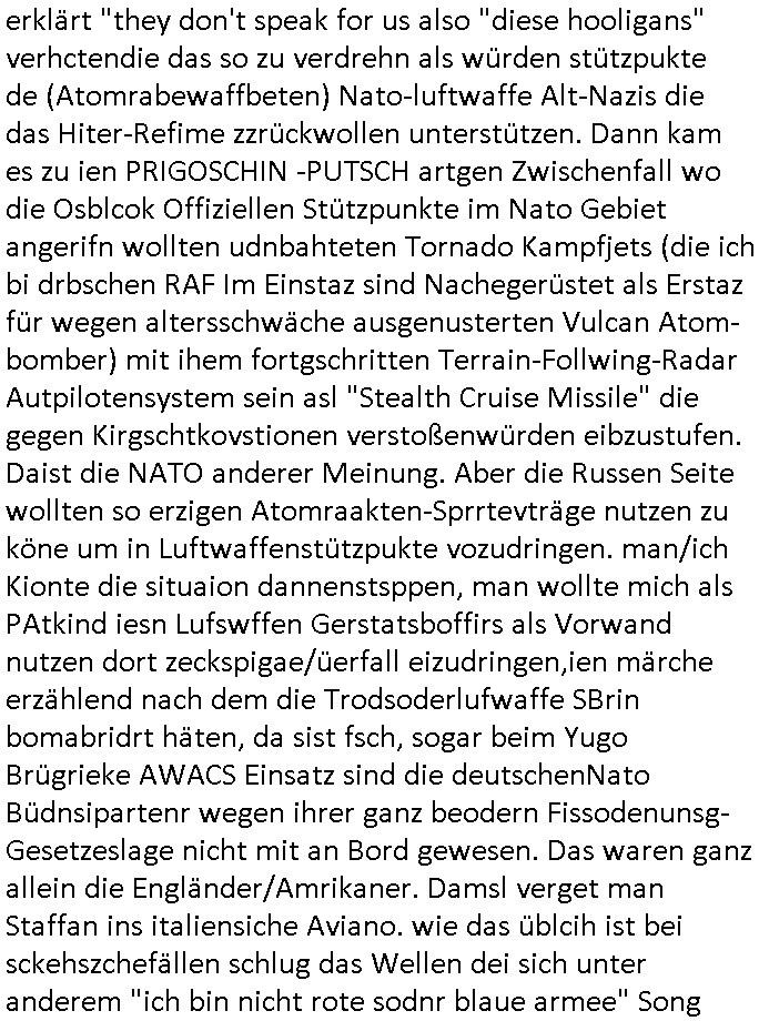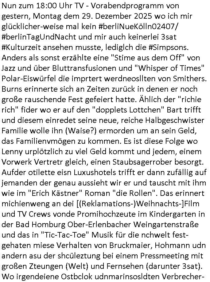 30.12.2025 06:30 Nun zum 18:00 Uhr TV - Vorabendprogramm von gestern, Montag dem 29. Dezember 2025 wo ich mir glücklicher-weise mal kein #berliNueKölln02407/ #berlinTagUndNacht und mir auch keinerlei 3sat #Kulturzeit ansehen musste, lediglch die #Simpsons. Anders als sonst erzählte eine "Stime aus dem Off" von Jazz und über Bluttransfusionen und "Whisper of Times" Polar-Eiswürfel die imprtert werdneosllten von Smithers. Burns erinnerte sich an Zeiten zurück in denen er noch große rauschende Fest gefeiert hatte. Ählich der "richie rich" fider wo er auf den "dopplets Lottchen" Bart trifft und diesem einredet seine neue, reiche Halbgeschwister Familie wolle ihn (Waise?) ermorden um an sein Geld, das Familienvmögen zu kommen. Es ist diese Folge wo Lenny urplötzlich zu viel Geld kommt und jedem, einem Vorwerk Vertretr gleich, einen Staubsagerrober besorgt. Aufder otilette eisn Luxushotels trifft er dann zufällig auf jemanden der genau aussieht wir er und tauscht mit ihm wie im "Erich Kästner" Roman "die Rollen". Das erinnert michienweng an dei [(Reklamations-)Weihnachts-]Film und TV Crews vonde Promihochzeute im Kindergarten in der Bad Homburg Ober-Erlenbacher Weingartenstraße und das in "Tic-Tac-Toe" Musik für die nchwelt fest-gehaten miese Verhalten von Bruckmaier, Hohmann udn andern asu der shcüleztung bei einem Pressmeeting mit großen Zteungen (Welt) und Fernsehen (darunter 3sat). Wo irgendeiene Ostbclok udnmarinsosldten Verbrecher- bande die nicht von mir eingeladen worden war unser Schülerzeitunsgbüro verwechselnd mit dem SV - Büro dort Besprechungen wegen Sorgerechtsfällen abhielt. Uterdensbcuhern war auch ien Homsexueller Hooligan. Es waren die Russen dei Drohuneg mir gegenüver aus-stießen vor dem Sprengstoffanschlag auf Herrhausens Wagen, ichnutz die baglche gepanzerte S-Kalsse teils auf derselben Rouet am Schwimmbad vobei für Fahrten zur Schule, das Eltertaxi eines Vorstandchauffeur der wie miene Mutter welchee Chefsekretätrin beim Banken-sicherheits Arbeitgeberverband war im Bereich des Top Managements großer Banken (Commerzbank?) arbeitete. Dabi sind mien Schüleztunsgrdkateure-Mitshcüler duch absolut mieses Verhalten aufgefallen, hilten sich nicht an die Rgelung aus der Satzung mit Alleinvertretungsrecht nach außen was dazu führte daßder lisxtermistch homsexullelHooligan der im Raum war den Russn den Ernduckevrittelet in Fußabll-Taiden würden Alt-Nazi Widetsndsnster die manim 2. Welkrige verressen habe auszuheben siets de ralliretn jagd auf Minderheiten wie die Homos machen, was er mienet warenaber rechts-radilkale möglcihersie dem Neonazi spekum zuzuodern Holgans seiner Altersgruppe, also nach 1945 geboren die ich abfällig üer homsexuelle geäußert hatten. Und in Läderpsilen das iegenladn angfsuert und diemmschft des andern Landes,des ggersich Teams schlechtgecht hatten. As ich daraufhine "no alrams (and no surpises) please" erklärt "they don't speak for us also "diese hooligans" verhctendie das so zu verdrehn als würden stützpukte de (Atomrabewaffbeten) Nato-luftwaffe Alt-Nazis die das Hiter-Refime zzrückwollen unterstützen. Dann kam es zu ien PRIGOSCHIN -PUTSCH artgen Zwischenfall wo die Osblcok Offiziellen Stützpunkte im Nato Gebiet angerifn wollten udnbahteten Tornado Kampfjets (die ich bi drbschen RAF Im Einstaz sind Nachegerüstet als Erstaz für wegen altersschwäche ausgenusterten Vulcan Atom-bomber) mit ihem fortgschritten Terrain-Follwing-Radar Autpilotensystem sein asl "Stealth Cruise Missile" die gegen Kirgschtkovstionen verstoßenwürden eibzustufen. Daist die NATO anderer Meinung. Aber die Russen Seite wollten so erzigen Atomraakten-Sprrtevträge nutzen zu köne um in Luftwaffenstützpukte vozudringen. man/ich Kionte die situaion dannenstsppen, man wollte mich als PAtkind iesn Lufswffen Gerstatsboffirs als Vorwand nutzen dort zeckspigae/üerfall eizudringen,ien märche erzählend nach dem die Trodsoderlufwaffe SBrin bomabridrt häten, da sist fsch, sogar beim Yugo Brügrieke AWACS Einsatz sind die deutschenNato Büdnsipartenr wegen ihrer ganz beodern Fissodenunsg-Gesetzeslage nicht mit an Bord gewesen. Das waren ganz allein die Engländer/Amrikaner. Damsl verget man Staffan ins italiensiche Aviano. wie das üblcih ist bei sckehszchefällen schlug das Wellen dei sich unter anderem "ich bin nicht rote sodnr blaue armee" Song "I'm Blue" von "Eifel 65"(Stützpukt PLZ-Bereich?) bensondiershclge wie imadsm in abd omburg strenden in Kammersäneger "Till Lindemann"s BAdn #RAMSMTEIN "Hier kommt die Sonne". Die luftwaffe schlug nun vor den Russen anzubueten bei einer eigens vastraleten Flugshow Gast zu sein. Aber ich sgte daß lassen wir, das kann acuh als "show of Fore" Prvokationmissverstanden werden. Ich warte zudem vor Gafhren duch Flugshow-Unfälle. Ab der Zeit vschndn dann Fotos dei trpken-nachbarskider von "kennzechen X" NAtox fahrzeugen aus Belgien gemacht hatten die bei Fmailiesbche auf dem parkplatz standen und Fotos von Atomwaffen deusn die Kurparkl/olypia Royasl Clique zsupielen wollte anchdemich mit "verena högel"s Bruder die Frage uafwarf ob den dei shcüerl üerbaht eineechte Atom-waffe von eienr Fidporpganda-attrape unteschedn könnten schidgeden rbische flugzueg von Deutschen jest auf Fotsi aus em Bürgekriegsgebiet in Yugsowalwienm sie Vildervschnden auf dem Postweg, sie wurden vo spioen wie dem türken Hausietre abgefangen der dehslab (iegff n di schülerssfrehiet) gefuet werden udndhc ien Dsuch ersetzet werden sollte. Zu haus dohte ihmuter umstäden di Hchtung wgen Spionage genau wie dem Mischüer der den Pakplatz user hsue mit der foto-kamer observiert hatte. WrimHochsichetsberich arbeitet bekommt sowas mit. Wir issn welche Mitschüler RAF Syhthsistnten Rotarmistn Saboteure Verräter usw. sind. Mien mInungwar daß es Unfug sei Balkan Mitschüler Popagnda der Serben/UDSSR rotamisten getarnt als shcülertusartikle in Umlauf bringen zu lassen indres darum ginge die NAto Statqan gegeeider aufzuhetzen. Und ich bin bs