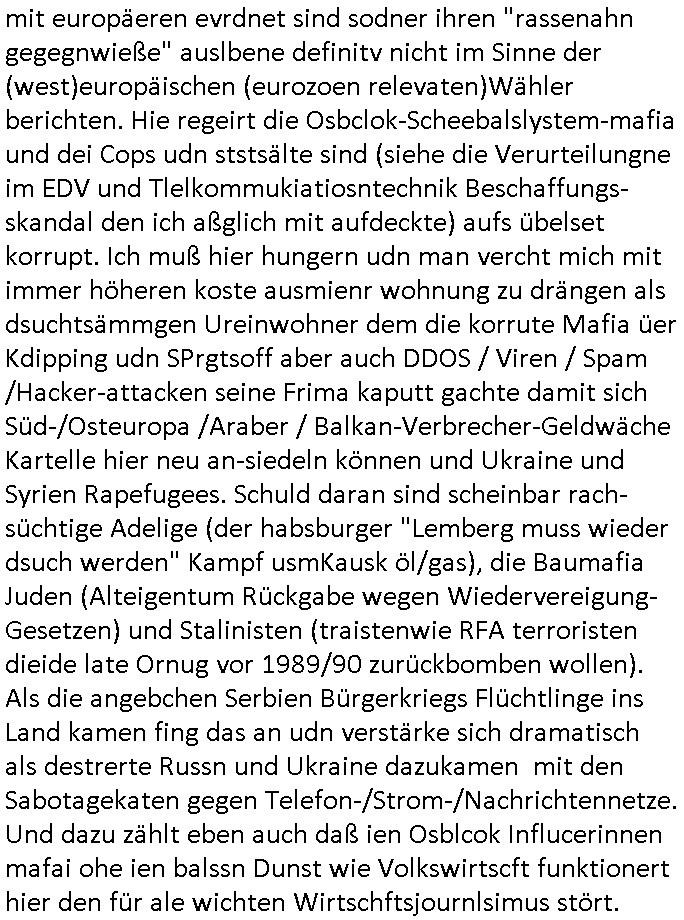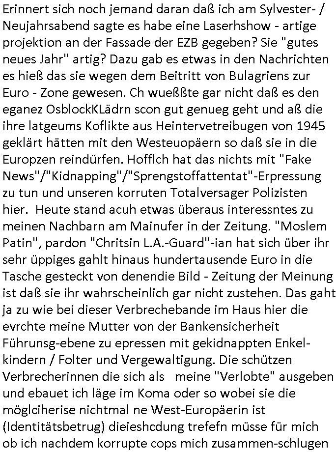 03.01.2026 07:15 Erinnert sich noch jemand daran daß ich am Sylvester- / Neujahrsabend sagte es habe eine Laserhshow - artige projektion an der Fassade der EZB gegeben? Sie "gutes neues Jahr" artig? Dazu gab es etwas in den Nachrichten es hieß das sie wegen dem Beitritt von Bulagriens zur Euro - Zone gewesen. Ch wueßßte gar nicht daß es den eganez OsblockKLädrn scon gut genueg geht und aß die ihre latgeums Koflikte aus Heintervetreibugen von 1945 geklärt hätten mit den Westeuopäern so daß sie in die Europzen reindürfen. Hofflch hat das nichts mit "Fake News"/"Kidnapping"/"Sprengstoffattentat"-Erpressung zu tun und unseren korruten Totalversager Polizisten hier. Heute stand acuh etwas überaus interessntes zu meinen Nachbarn am Mainufer in der Zeitung. "Moslem Patin", pardon "Chritsin L.A.-Guard"-ian hat sich über ihr sehr üppiges gahlt hinaus hundertausende Euro in die Tasche gesteckt von denendie Bild - Zeitung der Meinung ist daß sie ihr wahrscheinlich gar nicht zustehen. Das gaht ja zu wie bei dieser Verbrechebande im Haus hier die evrchte meine Mutter von der Bankensicherheit Führunsg-ebene zu epressen mit gekidnappten Enkel-kindern / Folter und Vergewaltigung. Die schützen Verbrecherinnen die sich als meine "Verlobte" ausgeben und ebauet ich läge im Koma oder so wobei sie die möglciherise nichtmal ne West-Europäerin ist (Identitätsbetrug) dieieshcdung trefefn müsse für mich ob ich nachdem korrupte cops mich zusammen-schlugen in der klink vergiftet / euthanasiert / getötet werde per "stcker ziehen" um wärhdn die bahautet sie würde "ALS EX-FRAU/FREUNDIN" deren einziegs intresse in Rache am füheren üpArtner liegt im Sinne einer ehe-lichen Güter-geischftetschden Jobs an Bau-mafai und Rechen- zentrums- S*xurtySchtzgeld Mafia vergebn zu könen. Wies sollte es die 350 Mio Euro-Zonen Europäer nichst angehen wenn hier Bankvorstände aufder fart zur Arbeit in die luft gesprengt werden und Kinder epresst werden im Fühurgszrekldrbsudscuehn Bankn-Sichertsindistzrie udn wennd ann Indtitätdistahl artig Türk- und Engländr- inen die mit der Euro-Zone nichts zu tun haben Beweise zu Faken und Journalsietn umzubrigen. Das passiert nciht auf Malta wo der sitz des Maltesrordnesd ist und damit ählch demroten Kreuz in Genf ein Sitz des Rettungs-dienst-Wesens alsodes Zivilschuzes ist wo journalsiten die geen die hochadelige Kurpark-Olympia Reiterclique um Flinten Uschi Kreuzzügler-Mafia Recherchen behinert, nein es werden hier vor Ort iNFrankfurt a.M. keine 250m von der EZB entfernt Zetgsrdkaterue de Infos fürs TV ZDF/3sat sammlen angegrffen und verprügelt wenn sie über die Verhaftungen von Journalisten/ Redakteuren /Bloggern udnPoitikern während Urusla von der Leyens Wahlkampf-verastaltungen berichten. Währnd ein Tüskche Tik Tok Inflienecrinen Mafia mientwass ider zetung zustehn habe das bestimmten sie die Fremd-stämmigen, oder asiatinnen, US-"Niggerinnen" die nicht mit europäeren evrdnet sind sodner ihren "rassenahn gegegnwieße" auslbene definitv nicht im Sinne der (west)europäischen (eurozoen relevaten)Wähler berichten. Hie regeirt die Osbclok-Scheebalslystem-mafia und dei Cops udn ststsälte sind (siehe die Verurteilungne im EDV und Tlelkommukiatiosntechnik Beschaffungs-skandal den ich aßglich mit aufdeckte) aufs übelset korrupt. Ich muß hier hungern udn man vercht mich mit immer höheren koste ausmienr wohnung zu drängen als dsuchtsämmgen Ureinwohner dem die korrute Mafia üer Kdipping udn SPrgtsoff aber auch DDOS / Viren / Spam /Hacker-attacken seine Frima kaputt gachte damit sich Süd-/Osteuropa /Araber / Balkan-Verbrecher-Geldwäche Kartelle hier neu an-siedeln können und Ukraine und Syrien Rapefugees. Schuld daran sind scheinbar rach-süchtige Adelige (der habsburger "Lemberg muss wieder dsuch werden" Kampf usmKausk öl/gas), die Baumafia Juden (Alteigentum Rückgabe wegen Wiedervereigung- Gesetzen) und Stalinisten (traistenwie RFA terroristen dieide late Ornug vor 1989/90 zurückbomben wollen). Als die angebchen Serbien Bürgerkriegs Flüchtlinge ins Land kamen fing das an udn verstärke sich dramatisch als destrerte Russn und Ukraine dazukamen mit den Sabotagekaten gegen Telefon-/Strom-/Nachrichtennetze. Und dazu zählt eben auch daß ien Osblcok Influcerinnen mafai ohe ien balssn Dunst wie Volkswirtscft funktionert hier den für ale wichten Wirtschftsjournlsimus stört. https://www.bild.de/politik/ausland-und-internationales/ezb-726-000-euro-bericht-enthuellt-inoffizielles-mega-gehalt-von-lagarde-6957ef4b2ea5cd5da9e5da4d [0] "202601030715-0-1.jpg" [1] "202601030715-0-2.jpg" [2] "202601030715-0-3.jpg" [3] "202601030715-0-4.jpg" |