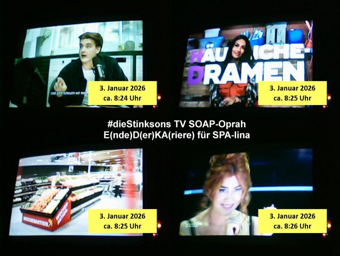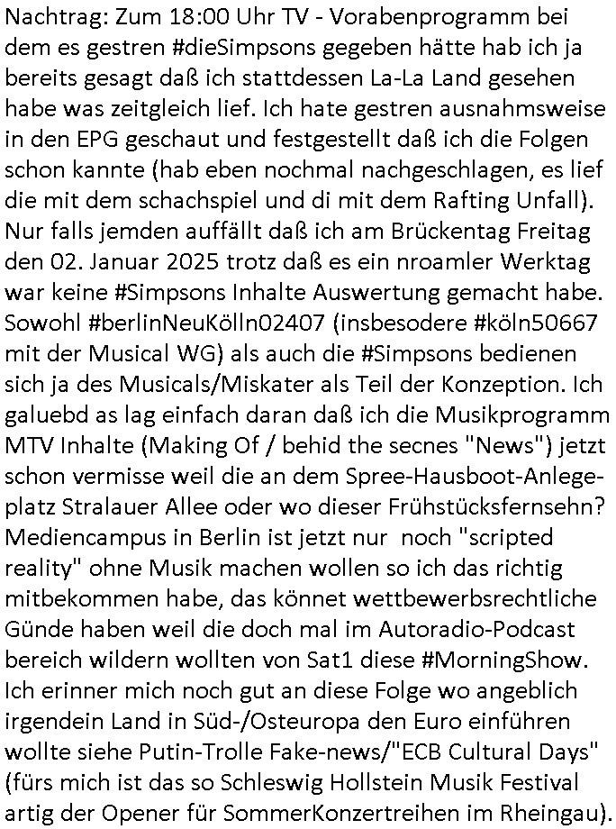 03.01.2026 16:00 Nachtrag: Zum 18:00 Uhr TV - Vorabenprogramm bei dem es gestren #dieSimpsons gegeben hätte hab ich ja bereits gesagt daß ich stattdessen La-La Land gesehen habe was zeitgleich lief. Ich hate gestren ausnahmsweise in den EPG geschaut und festgestellt daß ich die Folgen schon kannte (hab eben nochmal nachgeschlagen, es lief die mit dem schachspiel und di mit dem Rafting Unfall).Nur falls jemden auffällt daß ich am Brückentag Freitag den 02. Januar 2025 trotz daß es ein nroamler Werktag war keine #Simpsons Inhalte Auswertung gemacht habe. Sowohl #berlinNeuKölln02407 (insbesodere #köln50667 mit der Musical WG) als auch die #Simpsons bedienen sich ja des Musicals/Miskater als Teil der Konzeption. Ich aluebd as lag einfach daran daß ich die Musikprogramm MTV Inhalte (Making Of / behid the secnes "News") jetzt schon vermisse weil die an dem Spree-Hausboot-Anlege-platz Stralauer Allee oder wo dieser Frühstücksfernsehn? Mediencampus in Berlin ist jetzt nur noch "scripted reality" ohne Musik machen wollen so ich das richtig mitbekommen habe, das könnet wettbewerbsrechtliche Günde haben weil die doch mal im Autoradio-Podcast bereich wildern wollten von Sat1 diese #MorningShow. Ich erinner mich noch gut an diese Folge wo angeblich irgendein Land in Süd-/Osteuropa den Euro einführen wollte siehe Putin-Trolle Fake-news/"ECB Cultural Days" (fürs mich ist das so Schleswig Hollstein Musik Festival artig der Opener für SommerKonzertreihen im Rheingau). https://tvinfo.de/fernsehprogramm/2273913084-die-simpsons https://tvinfo.de/fernsehprogramm/2273913090-die-simpsons https://tvinfo.de/fernsehprogramm/2273912960-la-la-land [0] "202601031600-0-1.jpg" |