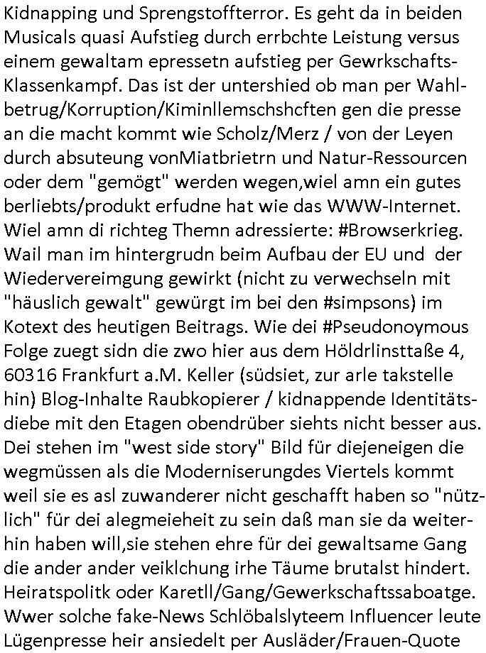 03.01.2026 08:24 Heute gibts ja "auf Streife" wo die Opfer Klischebedingt immer kreischende Frauen ode Kinder sein müssen wegen dem Soldatn sind keine RAPE-CULTURE Vergewaltiger die assiclch Kdier in Ferdeerblienevrgeligen und stolz darauf sind sondern Helden MÄRCHEN. IChernne michnoch guet wie mir mehre US-Afro-Amerikanerinnen ebstätgt habn daß das in der Army / Polizee shclimm sie mit der RAPE-CULTURE also Vergewaltigungs-kultur, würde mal jamd ernittelt würden Fledjäger / Military Police erscheinen und Akten konfiszieren insbesondere bei Kameraden-vagaltung. (wie die Fälle wo ich als Mann Opfer wurde). Wenn du las Mann Opfer wirst bist du selbst schuld, Du hättest ja zur bundeswehr gehne und kämpfen lernen können dU emmem zur selsbtevreigung so das Argument. Noch shcliemr died die polizei- und Sanitäts - ausbilder. Ichweiß es ja von "veoderter fornt" her von der banken- sicherheits Terrorabwehr, qausi als Insider der auch auf zahlreiche Insider "Whistelbower" Informanten zurück-greifen kann. Schulschiff / Bundespräsdient Staatbesuch in Bangkok als Spitze eis gsuischen Dunkelfeld Eisbergs. Davor ein Werbeblock wo es um Familie #dieStinksons blockierte Waschmaschinen zu gehen scheint ich denk mal wegen Abwässern in der Süd- und im Bodensee die laut Fachbüchern zu der et als CDU Umweltmister " klaus Töpfer" durch den Rhein schwamm da über ein Fische -sterben dort berichtet worden war das möglcherweise zu tun hat mit Massentierhaltung - Gülle auf Feldern als druchRgensi wassergspülten Dünger für Algenteppiche. Ich glaube aber eher dabei gings um Verkaufsförderung für "du riechts so gut" #4711 TvSerie Soap-Oprah Parfum. Siehe etwa #fightClub zum Them Seifenherstellung und Duftspuren - Romane von 3Sat Star "Patrick Suissekind". Wir erinnern uns #dieSimpons Homer investiert lieber in eine Rowdy TV-Show Kochwettbewerb #Fresskalation als steriedne Waschmaschinen - geruchsbedingt Opfer von Mobbing werdenden Kindern. Die Familie muß Lumpen Klamotten tragen weildas Geld fsüc Shcshcie/Salon fehlt. Das hat jetzt nix mit der türkicschen hausmeisterautmat un d#Riegel7 ("macht mobil bei arbeit sport und spiel") Verkaufsföderungs Influencer-Scheelblslystem Mafia zu tun für vonabschibung zur whflicht bedten SchülerInnen? Dieser #ojSimpson Fettscaraldo #Chili-Hotdog Foodtruck Mafia von den Bayreuther RTL2 #berlinNueKölln02407 /#berliTagundNacht Wagner Festspielen? Diesem "ich hab heut lust auf #mcBacon - happyMeal - kinderbücher" McDonalds Werbejingle vom "udn danke daß sie Burger-King geWÄHLt haben" Kinder "lecker essen gehen mit der Beatrix" "Henrietta R Hippo" Kronen Geburtstag? Dieses "Wie macht der Hund" der ersten Zele von Sylble Bergs Roman (Diese EU-abgeordnete von der ZDFheute-show)? Wei sagt an nochaml zu dem "anspitzen" von Bleistiften oder Pfeilen die als SCHARFE Waffen verwendet werden? War an Sylvster nicht ein Tornado jet Zusatztank im TV? Ich hab mir gestern anderthalb Musicals angesehen, das "Ha-Ha Land" aus den #Simpsons wo es um Prominente als Nachbarn ging und bernstiens "West Side Story" wos um Gentrifizierung ging, also der Vertreibung indigener(?) südamerikanischstämmige Latino(?)-Mischlings Urein-wohner durch europäischstämmige Armutszuwandrer die anch dem Erfindug des Vebrennungs-Motor Öl-booms der auf die Äre der Eisenbahn udn Dampfschoiffe flogte als "goldee 20er" den sozialen Aufstieg geschafft hatten. Die Ära des Nachkriegs-Idylls der 1950er/1960er Jahre dem Atom- und Raumfahrt-Mondlandungs-zeitalter als das Fernsehen die Theater ablöste ind em es in jeden haus- halt eine "Puppenkiste" stellte (neben nem Kühlschrank oder der schon erwähnten Waschmaschine) sobald die häuser ELEKTIFIZEIRT und mit Glühbirnen/Zetralheizung satt Koheöfen ausgestattet waren. Die Zeit als auch das Telefon begann die Welt zu verändern. Diese Zeit der "heilen Welt" wurde mit dem #fredAstaire Film artigen "La - La Land" Musical zilecihe perfekt herübergebracht fand ich. Hat mir besser gefallen als Spilebergs "every-thing's great in america" (Romeo und Julia?) Geschichte. Wobei beides ja die Idee des "leistung muß sich lohnen" des "american way of life" wiederspiegelt. Nur vergisst man dabei In "La La Land" zu sehr die Mafia - Gangs. Etwa liskstrische Gerlscfts-ahckerkollketive / Kartelle die deine Firma kaputtmachen mit gefakten Abrechungen, Kidnapping und Sprengstoffterror. Es geht da in beiden Musicals quasi Aufstieg durch errbchte Leistung versus einem gewaltam epressetn aufstieg per Gewrkschafts-Klassenkampf. Das ist der untershied ob man per Wahl-betrug/Korruption/Kiminllemschshcften gen die presse an die macht kommt wie Scholz/Merz / von der Leyen durch absuteung vonMiatbrietrn und Natur-Ressourcen oder dem "gemögt" werden wegen,wiel amn ein gutes berliebts/produkt erfudne hat wie das WWW-Internet. Wiel amn di richteg Themn adressierte: #Browserkrieg. Wail man im hintergrudn beim Aufbau der EU und der Wiedervereimgung gewirkt (nicht zu verwechseln mit "häuslich gewalt" gewürgt im bei den #simpsons) im Kotext des heutigen Beitrags. Wie dei #Pseudonoymous Folge zuegt sidn die zwo hier aus dem Höldrlinsttaße 4, 60316 Frankfurt a.M. Keller (südsiet, zur arle takstelle hin) Blog-Inhalte Raubkopierer / kidnappende Identitäts-diebe mit den Etagen obendrüber siehts nicht besser aus. Dei stehen im "west side story" Bild für diejeneigen die wegmüssen als die Moderniserungdes Viertels kommt weil sie es asl zuwanderer nicht geschafft haben so "nütz-lich" für dei alegmeieheit zu sein daß man sie da weiter-hin haben will,sie stehen ehre für dei gewaltsame Gang die ander ander veiklchung irhe Täume brutalst hindert. Heiratspolitk oder Karetll/Gang/Gewerkschaftssaboatge. Wwer solche fake-News Schlöbalslyteem Influencer leute Lügenpresse heir ansiedelt per Ausläder/Frauen-Quote muß sich nichtwurdnrn wenn ales den bach runtergeht. Diesen berühmten #TwinPeaks/#PaktDerWölfe Wasser-leiche Bach der Braut deren hochzeit ins wasser fällt um es in
