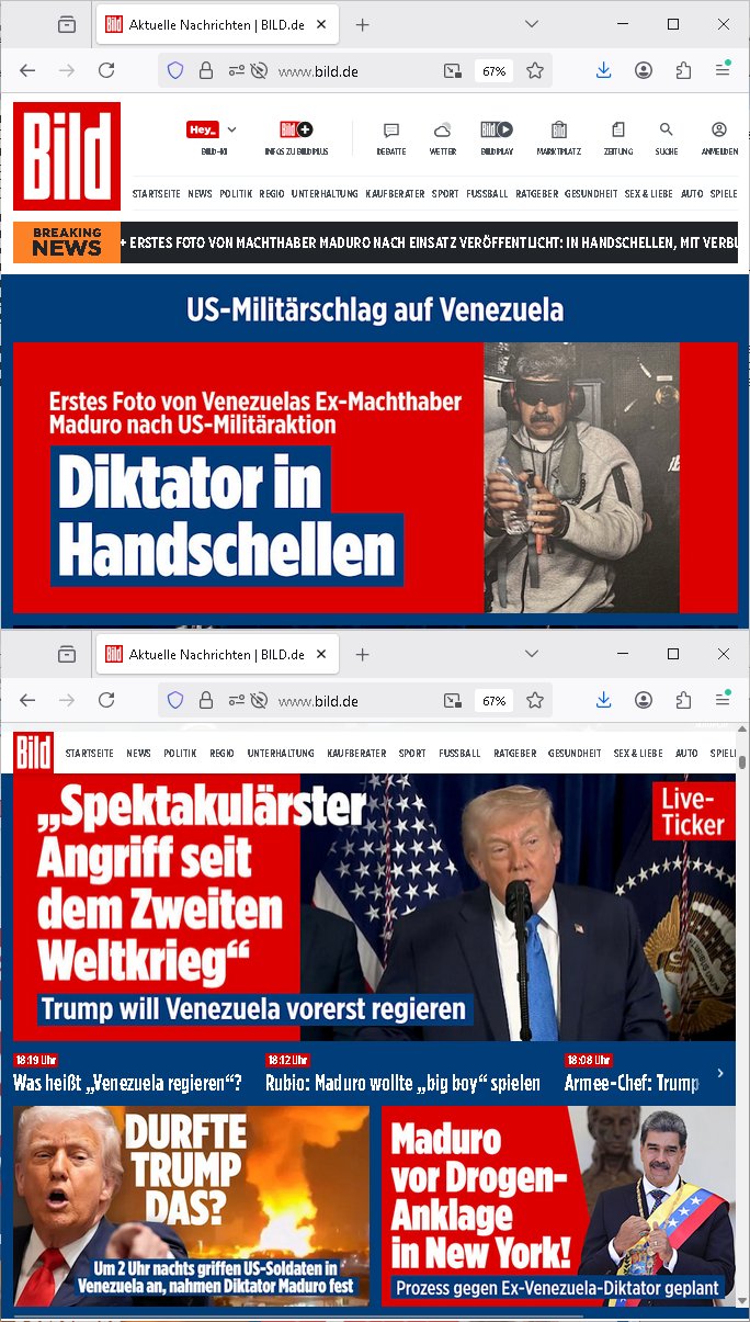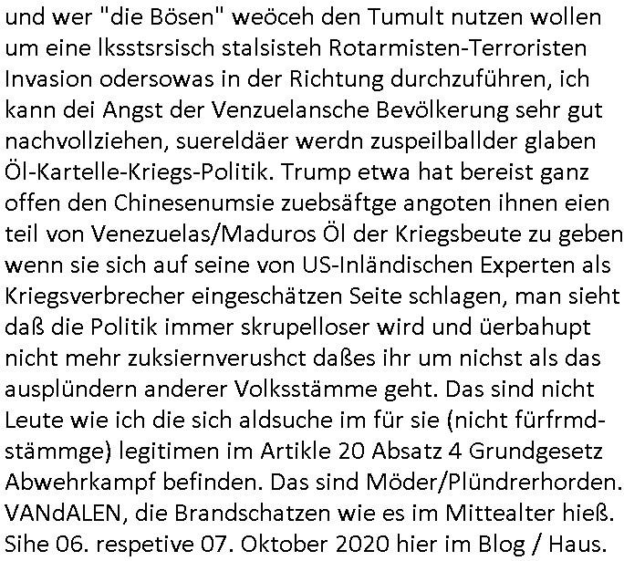 03.01.2026 17:30 Kaum will man ein wenig abschalten sieht man beim Blick auf den News im Smartphone daß Donald Trump Venzuela angegriffen hat, wirklich überrascht hat mich das nicht, in den letzten wochen gab es ja schon über-fälle auf Tanker nachdem Pressient Mad-Uro ankündigte daß er sein Öl am Kartell vorbei auf dem Weltmark an-bieten wolle, insebondereden Europäeren. Jetzt sind wohl Eliteeinheiten des US-militärs in den Regierungs- seitz vorgerdungen und habn amdure udn seine Familie außer Landes gebracht, er soll in den USA vor ein Gericht gestellt werden angeblche wegen Handelns mit harten Drogens wobe der Drogenhandel und die mit ihm ein- hergehende organisierte Kriminalität Zivilisten in den USA umgebracht habe. Dann gelch der nächste Schock. In berlin hat es einen Angriff auf das Stromnetz gegeben. Es ist definitiv ein gut geplanter und vorbereiteter Terror-akt,mutmalich verübet von Sbaourter aus dem Umfeld der akterue des Ukraine-kriegs. Zigtausende Haushalte sind ohne Strom. Die Experten sin sich einig daß das ne Terror/Miliz-Operation war. Aber Wähler/Bundsbürger werden vn eerrgeirung Merz weiter angelogen obwohl auch Polzeikräfte davoserche daß es als Kriegshandlung ezstefen ist was da an Sylvetsr passiert ist. Das ist sehr scher einzschätzen wie immer in einme Bürgergkrieg, wer "die Guten" sind die etwa deises kriegstreibende wahlbetrürgregime Merz(vormalshcolz) absetzen wollen und wer "die Bösen" weöceh den Tumult nutzen wollen um eine lksstsrsisch stalsisteh Rotarmisten-Terroristen Invasion odersowas in der Richtung durchzuführen, ich kann dei Angst der Venzuelansche Bevölkerung sehr gut nachvollziehen, suereldäer werdn zuspeilballder glaben Öl-Kartelle-Kriegs-Politik. Trump etwa hat bereist ganz offen den Chinesenumsie zuebsäftge angoten ihnen eien teil von Venezuelas/Maduros Öl der Kriegsbeute zu geben wenn sie sich auf seine von US-Inländischen Experten als Kriegsverbrecher eingeschätzen Seite schlagen, man sieht daß die Politik immer skrupelloser wird und üerbahupt nicht mehr zuksiernverushct daßes ihr um nichst als das ausplündern anderer Volksstämme geht. Das sind nicht Leute wie ich die sich aldsuche im für sie (nicht fürfrmd-stämmge) legitimen im Artikle 20 Absatz 4 Grundgesetz Abwehrkampf befinden. Das sind Möder/Plündrerhorden. VANdALEN, die Brandschatzen wie es im Mittealter hieß. Sihe 06. respetive 07. Oktober 2020 hier im Blog / Haus. https://www.bild.de/politik/ausland-und-internationales/trump-veroeffentlicht-aufnahme-das-erste-foto-der-geheim-mission-maduro-6959432ff6fc544dba9bb542 https://www.bild.de/politik/ausland-und-internationales/us-coup-in-venezuela-diktator-endlich-weg-aber-durfte-trump-das-6958f9e8441b06c4906d1d78 https://www.bild.de/politik/ausland-und-internationales/liveticker-zu-venezuela-militaerschlag-auf-caracas-6958d314f6fc544dba9baf2f https://www.bild.de/politik/ausland-und-internationales/prozess-gegen-maduro-geplant-drogen-anklage-in-new-york-69591c94cf4737ac6059ae15 https://www.bild.de/regional/berlin/stromausfall-in-berlin-stoerung-dauert-noch-bis-donnerstag-69592131666ac1993e7cc3f3 https://www.bild.de/news/stromanschlag-in-berlin-bekennerschreiben-bei-polizei-eingegangen-6959406bcf4737ac6059afec https://www.bild.de/news/inland/stromausfall-berlin-polizei-warnt-bevoelkerung-695930c6666ac1993e7cc501 [0] "202601031730-0-1.jpg" [1] "202601031730-0-2.jpg" [2] "202601031730-0-3.jpg" [3] "202601031730-0-4.jpg" |