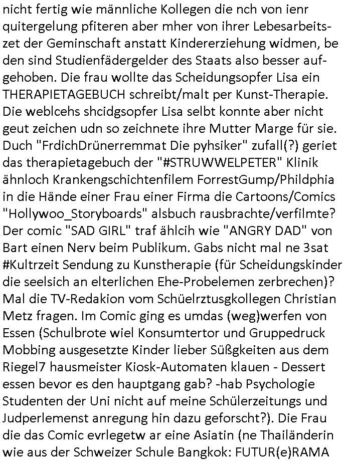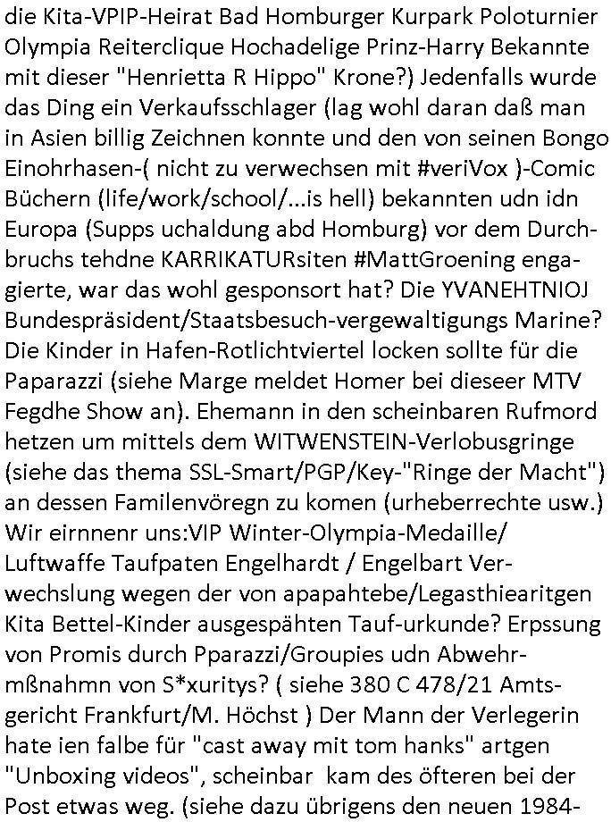 07.01.2026 00:45 Nun zum 18:00 Uhr TV Vorbandprogramm vom gestrigen Dienstag den 06. Januar 2026. Bei den #Simpsons lief ne Folge aus der Zeit der Hexerei und des Feudalismus. Lisa lernte zaubern, um geld für eine medizinsche behandlug von Marges Mutter zu bekommen lernte sie aus Erz/Blei [ versteckte Anspielung auf den METALLGESELLSCHAFT Öloptionen-Skandal? ] Gold/Geld zu machen. So wie ich hatte die Großmuter Erfrierungen an den Händen nach- dem sie sich mit der süd-Osteuropa (smboliserte druch einen Graf Dracula) Drückerolonnen? Mafia eingelassen hatte (war da nicht irgendwas mit Koste für ein Musical?) Es gab "König der Löwen" Musical-Charaktere die mich daran erinerten wie "Michael Jackson" in Berlin Babys von Balkone werfen wollte bevor er wegen Straftaten die sich gegen Kinder richten verurteilt wurde (könnte es da um Kidnapping gehen?). Zudem einen "Dragonheart" (Waren Dragoner nicht eine Balkan oder Süd-/Osteruopa Militär-reiter?-Einheit?) [dieser Film über die Schutzgeld-erpressung] Rachedrachen den man nur durch Menschen- opfer besänftigen konnte. Lisa konner aber nur Geld/Gold machen und Hislstein-Amulette verkaufen solang dieser Drache Feuer speite (ein Anspielung auf die Rüstungs- und Pflegemafia/Prothesen für Kriegskrüppel-Industrie?). Es ging um "Fields of Gold?" Ähren-/Ehren(-grab)-felder. In Teil zwo ging wurde Lisa zu ner Therapeutin geschickt an einer Uni Klinik asl Versuchskarnickel. Die Frau hatte sich schwägnern lassen udn bekam daher ihr Studium nicht fertig wie männliche Kollegen die nch von ienr quitergelung pfiteren aber mher von ihrer Lebesarbeits- zet der Geminschaft anstatt Kindererziehung widmen, be den sind Studienfädergelder des Staats also besser auf-gehoben. Die frau wollte das Scheidungsopfer Lisa ein THERAPIETAGEBUCH schreibt/malt per Kunst-Therapie. Die weblcehs shcidgsopfer Lisa selbt konnte aber nicht geut zeichen udn so zeichnete ihre Mutter Marge für sie. Duch "FrdichDrünerremmat Die pyhsiker" zufall(?) geriet das therapietagebuch der "#STRUWWELPETER" Klinik ähnloch Krankengschichtenfilem ForrestGump/Phildphia in die Hände einer Frau einer Firma die Cartoons/Comics "Hollywoo_Storyboards" alsbuch rausbrachte/verfilmte?Der comic "SAD GIRL" traf ählcih wie "ANGRY DAD" von Bart einen Nerv beim Publikum. Gabs nicht mal ne 3sat #Kultrzeit Sendung zu Kunstherapie (für Scheidungskinder die seelsich an elterlichen Ehe-Probelemen zerbrechen)? Mal die TV-Redakion vom Schüelrztusgkollegen Christian Metz fragen. Im Comic ging es umdas (weg)werfen von Essen (Schulbrote wiel Konsumtertor und Gruppedruck Mobbing ausgesetzte Kinder lieber Süßgkeiten aus dem Riegel7 hausmeister Kiosk-Automaten klauen - Dessert essen bevor es den hauptgang gab? -hab Psychologie Studenten der Uni nicht auf meine Schülerzeitungs und Judperlemenst anregung hin dazu geforscht?). Die Frau die das Comic evrlegetw ar eine Asiatin (ne Thailänderin wie aus der Schweizer Schule Bangkok: FUTUR(e)RAMA die Kita-VPIP-Heirat Bad Homburger Kurpark Poloturnier Olympia Reiterclique Hochadelige Prinz-Harry Bekannte mit dieser "Henrietta R Hippo" Krone?) Jedenfalls wurde das Ding ein Verkaufsschlager (lag wohl daran daß man in Asien billig Zeichnen konnte und den von seinen Bongo Einohrhasen-( nicht zu verwechsen mit #veriVox )-Comic Büchern (life/work/school/...is hell) bekannten udn idn Europa (Supps uchaldung abd Homburg) vor dem Durch-bruchs tehdne KARRIKATURsiten #MattGroening enga-gierte, war das wohl gesponsort hat? Die YVANEHTNIOJ Bundespräsident/Staatsbesuch-vergewaltigungs Marine? Die Kinder in Hafen-Rotlichtviertel locken sollte für die Paparazzi (siehe Marge meldet Homer bei dieseer MTV Fegdhe Show an). Ehemann in den scheinbaren Rufmord hetzen um mittels dem WITWENSTEIN-Verlobusgringe (siehe das thema SSL-Smart/PGP/Key-"Ringe der Macht") an dessen Familenvöregn zu komen (urheberrechte usw.) Wir eirnnenr uns:VIP Winter-Olympia-Medaille/ Luftwaffe Taufpaten Engelhardt / Engelbart Ver-wechslung wegen der von apapahtebe/Legasthiearitgen Kita Bettel-Kinder ausgespähten Tauf-urkunde? Erpssung von Promis durch Pparazzi/Groupies udn Abwehr-mßnahmn von S*xuritys? ( siehe 380 C 478/21 Amts-gericht Frankfurt/M. Höchst ) Der Mann der Verlegerin hate ien falbe für "cast away mit tom hanks" artgen "Unboxing videos", scheinbar kam des öfteren bei der Post etwas weg. (siehe dazu übrigens den neuen 1984- Cam lieferkitte LIDL TV-Spot). Wir iernnernusn miene Kiat hritae stalkeriu hate mir die Bundeswehr auf den hals gehetzt wiel es irh mit der erb-schaftnahcdeme manmcih umgebracht hätte per angeb-lichmManöverufall nicht schnell genug gehen konnte. Es gab auch eine Comic-Buch-Messe wie die aus diesem LEIPZIG #tatort Krimi mit dieseer entführten Kellergeisel. Möglicherweise hat das mit den Einohr-#verivox-hasen von der bausparaksse ("Scha_f sagt das kind und zeigt auf den hund" wieß ZDF Autorn / EU abgordte Sybille Berg) Etwa mit Sicherheits-fragen zu tun die Identitätsdiebe / Kidnapper di es auf große evröge abgesehen haben nicht kennen (wir ierniern us:so frag an die eltern ählich wie heißt diese oder jenes Puppenspeilzeug) THE BRITEN WILL NOT TSOP US... THEY'LL FIND "IAEO -El BARADAI" was amchte Homer nochmal beruflich, Atominspektion? Doch nicht etwa in der Tshernobyl-Sarkophag Ukraine? Da würd je ekrlären warum das WWW-schülerzeitungs-netz "Ärte gegen atomkrieg" ptzieteakte enthalten sollte auch aus Japan (wer investiert nochmal am DeCIX hier in der hanauer-land- Frankfurt - NTT Docomo aus Japan)? Gab es zum Tham YANEHTNIOJ / jCloud - DRM Musik nicht mal mindestens eine Folge wo RZ - S*xuritys der Firma von Homers Chef etwas verkaufen wollten mit Südsee- Urlaubsreisen und Fahrad(alden)-Sponsoring? Warum muß ich immer nur an dei #weddingplanermafia rings um den "SNOW AND BIKE ACTION Bad Homburg" denken oder die bei dortigen Jugenparlament beantragte Skaterebordebahn hier an der neuen EZB Frankfurt/M.? Wie sich Lisa bshcert idner folge mit dem Pafn