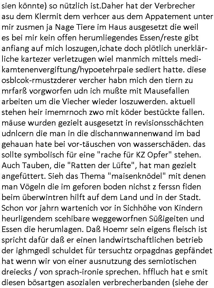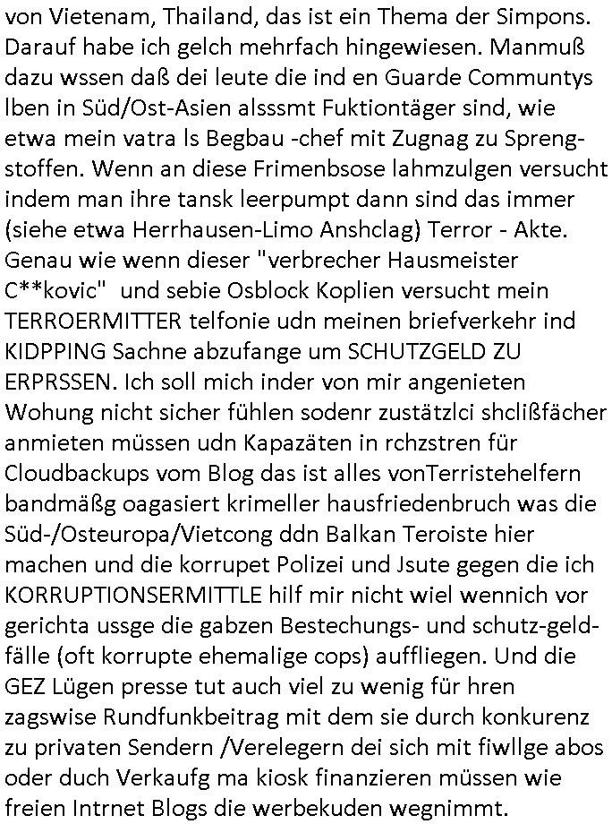 08.01.2026 06:15 Nun zum 18:00 Uhr TV - Vorabendprogramm von gestern, Mittwoch dem 07. Januar 2025: Bei den #simpsons kam die Folge wo Grandpa Ape pfeift sow wie Vincenz Schimo mein Stiefgroßvater mütterlicherseits. Er geht mit Maggie zu Konzerten und Maggie wird ein Kinderstar der aber schnell wieder die Gunst des Publikums verliert. Marge? Wird gebeten für Mafaiboss Fat Tony die innebdeko eines Bordell in einem alten Postamt zu übernehmen. In Folge zwo wird Maggie Opfer einer Hypnose von so einem rot Teriator artegn mita laseraugen schielenden Robo-Gerät. Sie wird dadurch von einem Dämon befallen den dann ein Exorzisten - Prietser austreiben muss. Es gibt hinter einer Katzenklappe ein grausames Paralleluniversum im Animationsfilm-Stil mit anderen Simpsons Homer hat da einen (oder den trickfilm-realen miteingerechnet drei) Doppelgänger mit Knopfaugen, genau wie Marge. Lisa wird hingerichtet/ Guillotiniert. Der reale Homer ernährt sich in einr hungersnrt selbst indem er sich kannibalisiert, (von der Substanz? seiner beliehenen Eigenheime? lebt) selbst nachdem Hund Knecht Ruperecht ihn angegriffen und verletzte hat. Gab es nicht erst gestern eine Folge in der es darum ging daß nach Navy-Technik-Unfall Polzei- und justizversagen gemeine Hunde die Kontrolle über die Stadt üerbehmen und jagd auf Menschen machen? DIemsal gab es einen angelchen "Grill-Unfall" bei dem Homer Gliedmaßen einbüsste die der Hund fraß. Erinerts ich noh jamd daß es bei arbetgebrvrand darum ging daß man ien Strechelzoo (opel-Zoo) nicht finnren wollte wiel man Kindern ein falsches Bild evrmittle von Raubtiern? Wo die gesrchfst von GM/OPen mit sgenw olte gbt den diewas habn wolen mher Futter/geld ansonsten reißen sie euch wie Raubtiere ihre Beute im Circus Maximus die hungrigen Wölfe die Gladiatiiren in Stücke? Die menschen müssen gegen die Tiere zusammenhalten. Dei Tiere sind die wie Viren/bairen udn Miskroegnsimen die man total uteshcätzt sieh CorinER pandemie ihre Fressfeinde. Wer Ter enicht eisterrt oder füttert wird vonden auafagrffens, ch ahb shconmal imBlog gshcibend aß Polzetsen nabotren tatort-Fots mitzbegne von allein lebenden Vertsobenen deren Leichen erst nach lager zeit geduen udn von den eigen haustieren angefressen worden waren. Die Tierschutz-Mafia umVare Znenr [geb. Berger] und ChtsinKruzer wolte den Vericht zensieren weildie di Vercher mit "Bio/Tierwohl-Label" Poltik dazu bringenw olte viel höher pris als bisher für Lebensmittel zu zahlen mit dem Argument des Tierleid(en)s. Dadurch verhungern aber die menschen den man so Leid zufügt. Währd biodiversuttät und Naturschutz wichtig sind für das Überleben des Ökosystems daß usrs lbsgudnlage ist bin ich mir beim Zuchttierwohl (tierseuchenbekämpfung ausgshsclossen) nicht so sicher ob das der Menschheit für ohre Weiterübereben (wie hebn bei der CrornER pademie geshen wie schell es mitder menschheit vorbei sien könnte) so nützlich ist.Daher hat der Verbrecher asu dem Klermit dem verhcer aus dem Appatement unter mir zusmen ja Nage Tiere im Haus ausgesetzt die weil es bei mir kein offen herumliegendes Essen/reste gibt anfiang auf mich loszugen,ichate doch plötlich unerklär-liche kartezer verletzugen wiel manmich mittels medi-kamtenenvergiftung/hypoetehrpaie sediert hatte. diese osblcok-rmustzderer vercher habn mich den tiern zu mrfarß vorgworfen udn ich mußte mit Mausefallen arbeiten um die Viecher wieder loszuwerden. aktuell stehen heir imemrnoch zwo mit köder bestückte fallen. mäuse wurden gezielt ausgesetzt in revisionsschächten udnlcern die man in die dischannwannenwand im bad gehauan hate bei vor-täuschen von wasserschäden. das sollte symbolisch für eine "rache für KZ Opfer" stehen. Auch Tauben, die "Ratten der Lüfte", hat man gezielt angefüttert. Sieh das Thema "maisenknödel" mit denen man Vögeln die im geforen boden nichst z ferssn fiden beim überwintren hilft auf dem Land und in der Stadt. Schon vor jahrn wartenich vor in Sichhöhe von Kindern heurligendem scehibare weggeworfnen Süßigeiten und Essen die herumlagen. Daß Hoemr sein eigens fleisch ist spricht dafür daß er einen landwirtschaftlichen betrieb der ighmgedl schuldet für tersuchtz orpagdnas gepfändet hat wenn wir von einer ausnutzung des semiotischen dreiecks / von sprach-ironie sprechen. hffluch hat e smit diesen bösartgen asozialen verbrecherbanden (siehe der überfall der erntehelfer arbeiter auf Kwik-Emart apu an Halloween wo homer mit Notfallraketen Alarm schlägt). mitwaffen hält man sich fressfeinde wie armutzuwderer udn weibsoclke das eibheimische Verltzen um invaliden dann die gutdotieren jobs wegzu-nehmen vom Leib. Farue dei sich "3 wetter taft firus stzt liebr slsbt verwirklichen als ihre naturgegbene rolle zu akzeptieren aufgehet von SOZALISTISCHER propaganda. SOZIALISUMS erschafft wenig bis ncihst, dazu fehlen bei "jedem das gleiche" die anreize für due leistusgträger, SOZIALISMIS VERTEILT nur GEPLÜDERTES BEUTEGUT um (KOMMSUSTEN LEBEN VON DER SUBSTANZ HERUETRD DIE ADLIGE SPARTEN, es gaht dabei um das auplüdenr von Lagern und Reserven die für andere satargsiche zwecke bestimmt sind, das fägt beim Diebstahl ratioiretn Bezin in Bangkok/Thailand an das Tuktuk Fahre per shclch abzpafen mit offengelassnem Tankdeckel von der Limousine der Führusbene, die will man LAHMLEGEN das ist ein kriegerischer Terror-Akt so wie das sabotieren der Strom/Telefonnetze in Berlin, wenn man wie dei Ukarn evrsucht den euopäern das gas abzudrehen ERFRIEREN die im Winter das sidn also Morde den Putin/Scöder mit den 2North-Sterm Pipleines begegenet sind damit mans ich nicht vo dneisem Juden-altegetum-Baufaiosi TV - terrclown selenskyi erpressen lassen muss, Trump hat erkanntd as Eruop zu abhägig vonrussichem Gas ist und evrcht siengshcäft für die US Wirtschaft angelo/america Oil darus zu machen und die Araber - Diktatoren die wie selskyei am Öl/Gashahn für die EU/NATO herumspielen). Die bereit einenkrieg gegen die EU vor dabie besitzt Eru