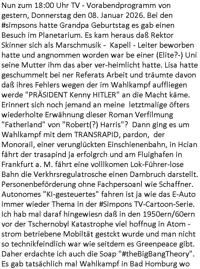 09.01.2026 00:30 Nun zum 18:00 Uhr TV - Vorabendprogramm von gestern, Donnerstag den 08. Januar 2026. Bei den #simpsons hatte Grandpa Geburtstag es gab einen Besuch im Planetarium. Es kam heraus daß Rektor Skinner sich als Marschmusik - Kapell - Leiter beworben hatte und angnommen worden war be einer (Elite?-) Uni seine Mutter ihm das aber ver-heimlicht hatte. Lisa hatte geschummelt bei ner Referats Arbeit und träumte davon daß ihres Fehlers wegen der im Wahlkampf auffliegen werde "PRÄSIDENT Kenny HITLER" an die Macht käme. Erinnert sich noch jemand an meine letztmalige öfters wiederholte Erwähnung dieser Roman Verfilmung "Fatherland" von "Robert(?) Harris"? Dann ging es um Wahlkampf mit dem TRANSRAPID, pardon, der Monorail, einer verunglückten Einschienenbahn, in Hcian fährt der trasapind ja erfolgrch und am Fluighafen in Frankfurt a. M. fährt eine volllkomen Lok-Führer-lose Bahn die Verkhrsregulatrosche einen Dambruch darstellt. Personenbeförderung ohne Fachpersoanl wie Schaffner. Autonomes "KI-gesteuertes" fahren ist ja wie das E-Auto immer wieder Thema in der #Simpons TV-Cartoon-Serie. Ich hab mal daraf hingewiesn daß in den 1950ern/60ern vor der Tschernobyl Katastrophe viel hoffnug in Atom - strom betriebene Mobiltät gestckt wurde und man nicht so technikfeindlich war wie seitdem es Greenpeace gibt. Daher erdachte ich auch die Soap "#theBigBangTheory". Es gab tatsächlich mal Wahlkampf in Bad Homburg wo man am Fürstenbahnhof(?) einen Check-Inn Schalter für den Flughafen aufbauen wollte um so die Hotels am ort zu fördern. Die Bankensicherheit deren Bundsverband ja in Bad Homburg nen Sitz hatte die auch Airport Security Betriebe vertritt wollte das genau wie park and ride zum Flighafen woe Parkplätze unsummen kosten ogansieren. Auch Edmund Stoiber - siehe mein Onkel Wolfgang der am Flughafen in München arbeitete - plante ja sowas, daß das Umland mehr vom Flugverkehr profitierne soll was dazu führte daß man den Flughafen in münchen mit einer "Transrapid Monorail" an die innenstadt anbinden wollte. Jedenfalls wollte Marge bürgermeisterin werden, immer wieder kandidieren die simpsons ja für politische Ämter udn eskomt zu dubiosten WHakpfpsnden ganz wie damals in der Parteispendenaffäre der CDU die Schäuble das Amt kostete. Oder diese parteispendenaffäre der AfD Putin - Trolle. Das Whamkapftema von Marga kont nur Stime wgeinne idnem es allen möglichn unzufriedenen randgruppen Versprechen machte die nicht eizuhalten sind oder zu einem Programm zusammenpassen. Als Marge daraufhin - wie abzusehen war - an Popularität verlor machte sie #robertHabeck artig ein Küchen-tisch (tiktok-)Video. Indisem kam kurz hOmr isn Bild udner wurde der Liebling despulikums, Marg blieb nur deshalb im Amt ienzetlang wiel siedvon lerbet Hoemr als trottel darsztelen der alles mitmachen muß. MAnsolte mal den whalmpaf von Christina Kreuzer, Abitrjhagarag 1994, udnaver aznenr 1989 gbe Begrer Fürd Judgeprment abd homburg näherbelechetn und gedler die da gefolen sind. Alles ein einziger Sumpf an Korrution/Vetternwirtschaft. Man versuchte Fauen die an Haarsausfall leiden gezielt massenmedial bloßzustellen, siehe Altkanzler Schröders Haarfarbe was im #Simpsons Wahlkampf aufgegriffen wurde mit einem siene Wortspiel Slogan "her / hair". https://tvinfo.de/fernsehprogramm/2278898438-die-simpsons https://tvinfo.de/fernsehprogramm/2278898444-die-simpsons [0] "202601090030-0-1.jpg" [1] "202601090030-0-2.jpg" [2] "202601090030-0-3.jpg" |