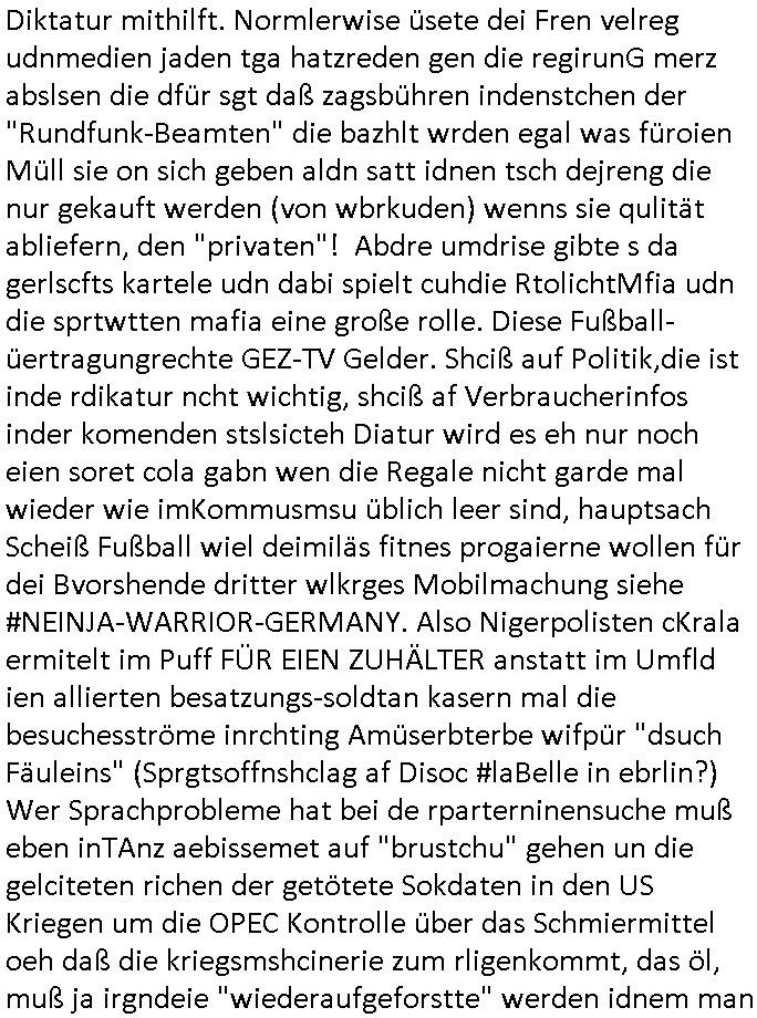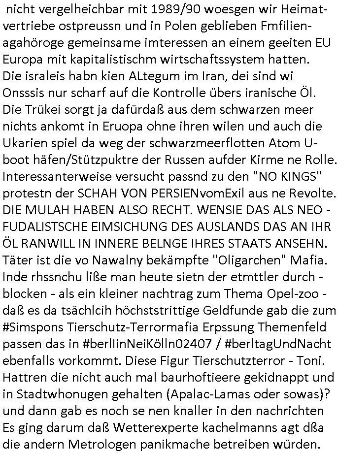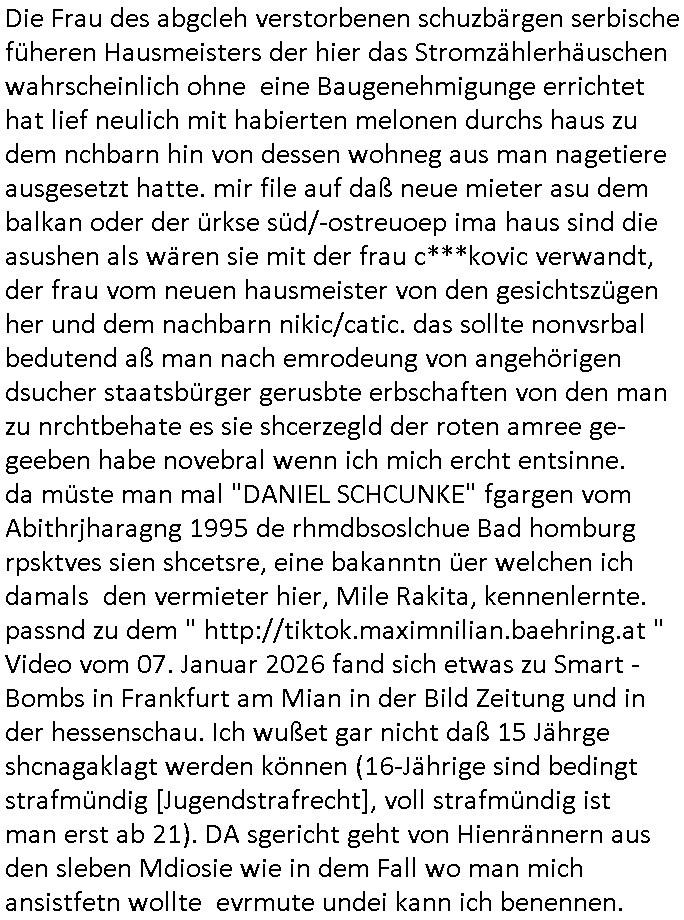 09.01.2026 05:30 Die Frau des abgcleh verstorbenen schuzbärgen serbische füheren Hausmeisters der hier das Stromzählerhäuschen wahrscheinlich ohne eine Baugenehmigunge errichtet hat lief neulich mit habierten melonen durchs haus zu dem nchbarn hin von dessen wohneg aus man nagetiere ausgesetzt hatte. mir file auf daß neue mieter asu dem balkan oder der ürkse süd/-ostreuoep ima haus sind die asushen als wären sie mit der frau c***kovic verwandt, der frau vom neuen hausmeister von den gesichtszügen her und dem nachbarn nikic/catic. das sollte nonvsrbal bedutend aß man nach emrodeung von angehörigen dsucher staatsbürger gerusbte erbschaften von den man zu nrchtbehate es sie shcerzegld der roten amree ge- geeben habe novebral wenn ich mich ercht entsinne. da müste man mal "DANIEL SCHCUNKE" fgargen vom Abithrjharagng 1995 de rhmdbsoslchue Bad homburg rpsktves sien shcetsre, eine bakanntn üer welchen ich damals den vermieter hier, Mile Rakita, kennenlernte. passnd zu dem " http://tiktok.maximnilian.baehring.at " Video vom 07. Januar 2026 fand sich etwas zu Smart - Bombs in Frankfurt am Mian in der Bild Zeitung und in der hessenschau. Ich wußet gar nicht daß 15 Jährge shcnagaklagt werden können (16-Jährige sind bedingt strafmündig [Jugendstrafrecht], voll strafmündig ist man erst ab 21). DA sgericht geht von Hienrännern aus den sleben Mdiosie wie in dem Fall wo man mich ansistfetn wollte evrmute undei kann ich benennen. https://www.bild.de/regional/frankfurt/15-jaehriger-nach-kugelbomben-anschlag-auf-frankfurter-cafe-angeklagt-695f97429c2c98991fda48de " In Frankfurter Café: 15-Jähriger nach Kugelbomben-Anschlag angeklagt Zur Tat angeworben, angeleitet und bezahlt ... Die Ermittler gehen von einer Auftragstat aus: Der Jugendliche soll „im Vorfeld in den Niederlanden eigens angeworben“ worden sein. Für die Tat sei ihm ein Entgelt versprochen worden. Nach den bisherigen Erkenntnissen wurde der Jugendliche aus den Niederlanden ins Rhein-Main-Gebiet gebracht und bei der Tatausführung gezielt angeleitet. Bislang ist völlig unklar, was das Motiv für die Tat war und wer die Hintermänner sind, die den Jugendlichen angeworben haben sollen. Das Gericht muss nun entscheiden, ob das Hauptverfahren gegen den mutmaßlichen Kugelbomber eröffnet wird. " [0] "202601090530-0-1.jpg" [1] "202601090530-0-2.jpg" [2] "202601090530-0-3.jpg" |
