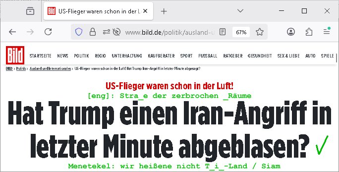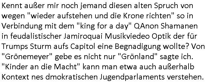 16.01.2026 05:46 Kennt außer mir noch jemand diesen alten Spruch von wegen "wieder aufstehen und die Krone richten" so in Verbindung mit dem "king for a day" QAnon Shamanen in feudalistischer Jamiroquai Musikviedeo Optik der für Trumps Sturm aufs Capitol eine Begnadigung wollte? Von "Grönemeyer" gebe es nicht nur "Grönland" sagte ich. "Kinder an die Macht" kann man etwa auch außerhalb Kontext nes dmokratischen Jugendparlaments verstehen. https://en.wikipedia.org/wiki/King_for_a_Day_(Jamiroquai_song) https://www.bild.de/politik/ausland-und-internationales/us-flieger-waren-schon-in-der-luft-hat-trump-iran-angriff-in-letzter-minute-abgesagt-69688ec4e954401861ee11b0 da ist ein (grüner) Haken drann [eng]: Stra_e der zerbrochen _Räume Menetekel: wir heißene nicht T_i_-Land / Siam [0] "202601160546-0-1.jpg" [1] "202601160546-0-2.jpg" [2] "202601160546-0-3.jpg" |