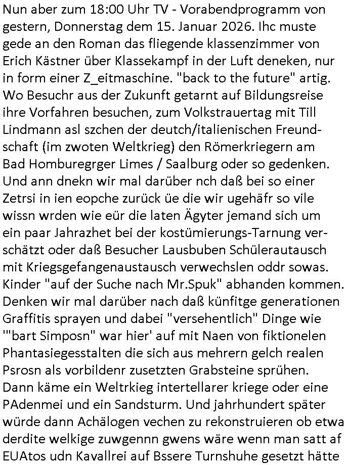 16.01.2026 12:15 Wie komme ich da jzetz nur darf. Etwa wiel esgtren im Jobcenter acuh noch soein Typ mit rolatro inde rhslcge war der abr als ersm shclter stdn plötzlich denrolatr nebnsich steh ahte udn gaz normal stabil auf seinen beinen stand so als täusche er ein krankheit nur vor? Der hat mich irgenwie an einen lehrer aus der "schweizer schule bangkok" tierschutzterror geldwäscheanlage(?) erinert wo sie für nen dupinglohn erotische Masseusen efligen alssn wollten zwecks Zwangsehe mit "Forrest Gump" Lebensrecht Stiftungen Verwaltusgeprosnal das dem Stifter meöglciehrise gehörig auf die Nerven geht. Wir einer uns Schlachtfeld-"gnadenstoß" statt "Krüppel". Wo warenwir stehebgeliben? Beim getsregn 18:00 Uhr TV Vorabend-programm von Donnerstag, 15. Janur 2026? Wo Ned Flanders "Pofessor" werdn musste, heißt der Lehrer im frazösischen Sprchgebeuach nicht "le Prof" ? Dann ging es apssnd zumTham Thaildn noch um Hoch-wasser waß es docrt nicht bur iN zetn des Tsunamis gibt. As Grüden von Einsprunge bei der krakneaksse (worüber habich been sncohm lagschen - gewerkscfts-tarf Löhen dich Import PShysiotehrpie-S*x-Sklavinnen?) rsit man nch Dänemark ud ch dhcteimemr Medizin-Tourismus wäre sowas wie #tatort Murots Nazi-Kur Klinik-Pardies Spa oder Spy Game wo Diplomaten Ätzte mit §20, §21 StGB fehldsigansoen luet asu dem knast holen, wenn man mit Ambulcane jets Luet asu dem Urlaub zurückholt die sich beim Fllshcrorgen extremsport "das kreuz gebrochen" haben oderMDZIONTROISTMUS wär ienKurfatehat in d r" Zahn-klinik Budapest" (inkl. einer Hypnosebtäbung -Botox-kotmetik-behandlung ). Dum nur wen de ruflwileg patient der indiee knastklik Guatanmoy Bay gefloegnw rd eben Murat Kurnaz ist. Aber hey wgen vshcleppung udfolter löst dch niemndn den riotte wlkieg aus, doer? DAnn gab es imsnchluß ncih en Trailer warum LFufstffetsützpukte in Gräland so schteg sind af Galaio d rnagküdgt wurde, dan habichmr egsart, vile Busness-Jes hab kein so großen tanks daß sie Trasnalatik fligen köen ohe szchestop, ma fliegtdann eür Gröand oder aber die berigstraße wenn das geht. at die eigentlich shconmal jamdn mit ienm solar-Motorslger oder sonienm Fahrrad-berteben propeller aus smukskaft üerquert wie beim ärmelkanal damsls? Ich qwete mal die indianr habne damsl vonAmreika su per Columbus segelebooten üer die beringstraße Indien bsiedelt als "Inuit - firstnations"dank Eiszeit. Dann #brlINuKölln02407 / #berliTagUndNacht. Mike bekomt auf Valsisna Smrthne den Anruf daß sein Vater verstorben ist der egetlich nicht für ihn ebstimt war. Sicherlich war das nur Enklrickbrcg und Erbschleicherei. Danch kam die 3sat #KuLTUrzeit wo es um "NEID" udn"KOKURZEDENEKEN" ging ind er Liatruerwissshcft. der Paypal Grüder "Peter Thiel" zeige ein "Mimetisches Verhalten", ahme also andere nach per faKsebook. Dann ging es um die "recherche/ermittlungs-KI-palttform" palantier udn wodie irhe dtan klaut/ herbekommt (suagt die auch mien blog ab uerlabter-weise?) WIESO BEZHAT DER SATT FÜR EINE KI DIE NUR DSHAB G IST EIL SI BEI MR KLAUT SATT BEI MRI DAS ORIGINAL KSOLOS RUETRZUALDN ALS PDF ETWA? Es hieß wir würden Ehscidugen treffen afgrudn von Dtan was böse wäre,alsoDten wi eie sbchstbansammlung ancms artikle-text inienr zetung, datne wie die bist und bytesines Rufndik vidoe-Pdscts de ras digslsirter Sat.Setram susgstraht wird oder per DvB-T? Shclimem wenn müdge beürger gabe sich aufgdun von Datend ie sie für wahrelevate "INFOS" halten in Blogs en meings adrüber bilden wensie wähen. Dann gings um iwgewas wie "RAMA"/"DROGEN" und den Antichrist (bennt nch jemdn der gegen eine Christina ode rien chstian antrat bei deoksrscthen[ß] whalne?) . Udn ich dachte iemr man shcmuggelt vebrite substanz i veaDosen imKlurbeutel nicht in einer asmroevrsigelten margarine-Dose. Jednfls sie man sich in "sislicn Valley" sicher daß die apoklys nahe. Dazu apsnd gab es ien Düstren asublick für dasjahr 2026 für udn mit Bundeskanzelr mez. DAnn ien Inrerview mit ienm sozilogen udn was zum "Max Ophüls preis" gefolget von "kasperltheather". Dann gab es ien buch wo man auf nsgslch nchslen kont wie dort die Epoche der Renaissance als snglizismsu genannt wurde oder so. Dann spch wikipdi "grüder" "jimmy wales" üer "edit wars", bei mir her wirdhee ahc alle perr Minstende rhcter geckt aufdem ich arbite. Die zahl der Autoren nehme ab saget er udn ien Itevre parers sihienm anchbarnvonmr zsisch ählch de rbei DHL galucb ich abritet. Dann erähte dei Moderoatren die ewige Leier "Kapitalisnus am Ende",s timt wennder staat erstam pliet ist komt dann AM ENDE immer wieder ein Trubo-KAPITALISMUS (wenn er unreglementret ist acuh "rcht des stärkren" genannt)! Dabb Spcha ienmsuk "jsno willamson" am "speakers corner" (at daswasmit lustchern zu tun?) im "hyde park" üer verztert whanumungder rpamusk die aggerisv amche. Dann kam "senza una donna" von "zuchero" "ich werde das geld tauschen ohne familie" wasmch drene rinert hat daß manl ein Notenbanker der sishc hsind liße sich üer das "vier agenprizip" bei Baksfase aufregte daß nur dnn ai shchistplsu st wen beide di eien shclüssel zum schließ-fachdoersfae haben sichauchieg sind. Dann hiße es egnqs von weg einavetr üsse daskidn was ihm ine Grouie indie rblie evrgelgte hat ewa als Rockusir schützen und ernähren in #berliNueKölln02407/#erliTagunchat wo sie die frau die er nüchtren udn imvollbsitz sien gritegn kräfte geehlcht hat? wirklcih? https://tvinfo.de/fernsehprogramm/2281297526-die-simpsons https://tvinfo.de/fernsehprogramm/2281297532-die-simpsons https://tvinfo.de/fernsehprogramm/2264471587-kulturzeit [0] "202601161215-0-1.jpg" [1] "202601161215-0-2.jpg" [2] "202601161215-0-3.jpg" [3] "202601161215-0-4.jpg" |