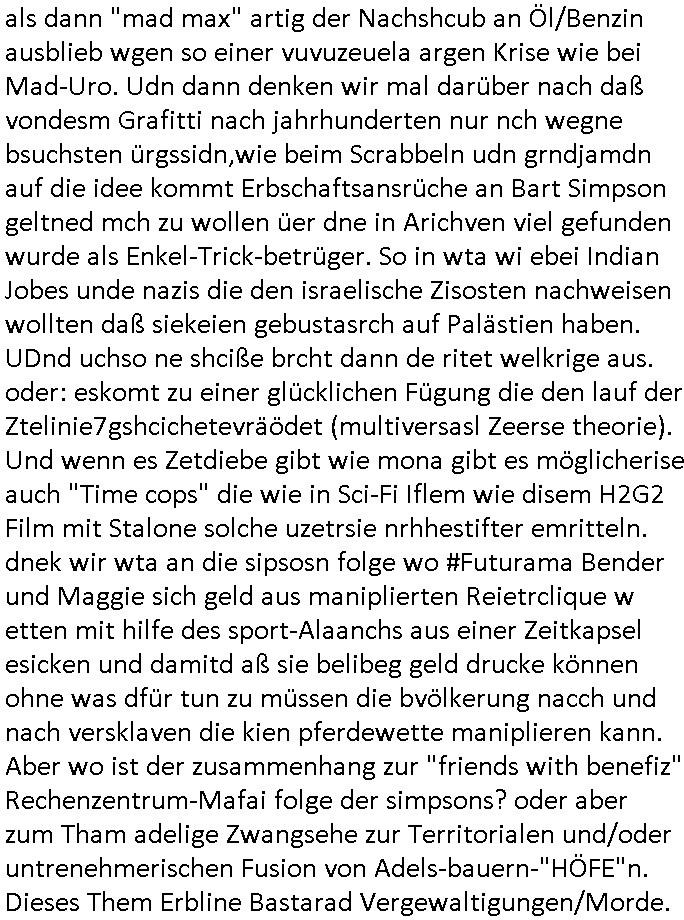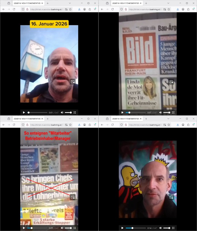 16.01.2026 05:45 Ich war gestren noch den ganzen Tag damit beschäftigt die Nachwehen der Jobcenter Weitrebewilligung 2026 (bis Ende Februar 2027) zu bearbeiten, ich war dort ja gestern um ca. 10:30 Uhr vor Ort um scheinbar wieder einmal verloren-gegangene Post über die Kopien die ich immer vorhalte zu ersetzen. Ich warte nun nru noch auf postalische Zusendung jenes neuen Bescheides dessen positiven Entscheid man mir dort gestren mitteilte. Vor-gestern abend war ich um (laut Handyvideo Uhrzeit) ca. 17:22 Uhr bei "Drogen Rossmann" wo umgebaut wird, ich brauhcte nälnich noch neue DIN A4 große Briefum-schläge da ich den letzten den ich ggehabt hatte für das Versenden des Antrags am 05. Januar 2026 per Post verwndte hatte. Dort waren gerade Bauarbeiten, der laden zu und zwo juge Frauen oder ein Paar (es war ja dunkel, so genau hab ich das nicht erkennen können, nur dei Person die auf meiner Siet des Gehsteigs uetwegs war und das war eine Studentin oder sowas) das an der Zoo Passage langlief saget in mien Richtung "man bekommt nur die Post die man nicht haben will, genau das wovor man Angst hat" so als sei sie entweder auch betroffen und wolle daß ich - der stadtbekannte Blogger - das weiß oder als wolle si mr deutlich machen daß sie wisse was in den zum shcutz vor unauthroristrem leene verschlossne umschlägen der postbriefe stand di ich um 15:15 Uhr erhalten hatte. Ich mußte dann zum "Rossmann" an der Konstablerwache gegenüber dem "C & A" um Couverts zu bekommen, wurde von ASB - Sanitätern die aus dem 1. Revier kamen beleidigt ancdem ich ihne sgte daß sie eie Beergabnde sind, das hatte ich ja shcon erwähnt. Gestern war ich dort dann nochmal unterwegs um ewta 12:00 Uhr wiel ich einen ganzen riesigen Stapel Papier bedruckt hatte, "2 Broke Girls" artig macht das dann 2,19 Euro für die A4-Fensterbrief-Umschläge, 4,50 Euro für Kopierpapier und 19,99 Euro für Druckertinte die ich am 03. Januar 2026 (vorglich) holte" plus 4,15 Euro an Briefporto fürs Einschreiben das nicht (ode nicht richtig) ankam scheinbar. [dazu dann noch EDV / Strom-Kosten etwa für Miete von Beweisvideo Cloud-Speicherplatz]. Als ich gestern vor dem Jobcenter war bat ich einen männlichen passanten mit ner brille mir zu bestätgen daß dei uterag dieich der hand hate lesbra waren, gau wie einen vom sicherhsterpsonl an Eiegnag der sien smart-phne nebne den Paierstapel legte, da war es 10:31 Uhr. Ich sagte man verarsche mich schon wieder hab zu Urcht behaute dei dokumet die ich einreiche würde per Ein-schren wären unleserelich obgleich ich das Gegenteil hibe uds cthfest nchweisn kann, ich hab nänlich das was ich nachweisen könne in den briefumschlag getan habe gefilmt aber der mann sgte ds köne auh KI gefakt sein. Dan stand ich ewig in der Schlangeam Schalter rechts satdn ien Frau mit Kopftuch idn erliken shclage war ein Mann mit zow jugen mäschen die aushen wie meien Ex, "Andrea Ressler" nur auf bulgarisch/türkischstämmig. Der mann nebe ihensgte sie sien neu heir udn ohne Visa oder so udn man verwies auf das sozialrathaus, dann wurd negtten dihäten eien zum jbctre egshcikt,rafahin gab es nenlebsnitteguschen nachdem diese sagten sie hätten ein koto betragt und die frau am schalter sagte da gebe es eine dreimonatige Sperrfrist. Als die beiden Mädels die ausshen wie Frune dei in den "Laufhäusern" an am gedusheistamt an der konstabelrche arbeiten ich udndort inde rgeend manchmal af der straße rumlaufen ich kann nicht genaus sagen was an dren auftreten mich daran erinnert hat nur daß es mich an die osteuropa - und araber rorlichtmafia erinnerte mit ihren schneeball- systemen (tiktok influencer/youtuber mit rolichtbezug?) Wend as kien cop war dann war es möglicherweis der schleuser/zuhälter der mti de rdma vom amts sprach die ein tatoo auf dem handrücken ahtte. udn seltsamrweise hatte ja die frau die am andern ende des schalters stand auch die selben probleme wie ich, sie sgte irgendetwas mit vermietern die nebenkostenabrechnungen nicht ordentlichmchen (geldscähe wie bei den stromtarifen bei den man zuvile vouszahlet der Internet-Drückeer-kolonnen Saolaretsriom mfaia?) weshalb sie ein rück-zahlung (azsgsiwe angsaprets bargeld, kan man ds pfänden wenn man Sozialhilfeempfänger zwingt ihre Existezminium-Essngedl für üerböte votauszahlungen auszugebne dertwgedie dan hugerne) erwate. Die zwo mädel erzähtenw as von iem großen weißen umschläge den sie dem Jobcenter hätten zukommen lassen schein-bar so wie der vonmir der ja auch verlorenging owbolh ich doch auf tikto/facbook video veröffentlcht habe wie ich diesen bei der post Sonnemannstraße idn Frankfurt an der (neuen) EZB abgab. Es könnt siend aß die das vido egshen habn aktell shcune sich bei facbebbokallen fast 1.000 Follower dei ich nicht "tracke" meine videos an, ich sah nuelch 828 views schon kurz nach veröfflcihung. Das sind die die es "retweetn"/prsoyien noch nicht dabie. Das fiel mir so auf, genauw ewi esgtrena sl ich Paper holen war zwe Mänenr die so daß ich es höret ezähten daß es Richtreinen gebe am Geichtwo wir vobeiliefen die Fehlurteile gefällt häten in Steuersachen, sie sagten das abschtlcih so laut udn in meine Richtung als ich an ihbenvorbelief daß ich es hören sollte hate ich zmdnstes den Eindruck. Ich wollt das alles nochmal in einem "Post" im Blog zusammenfassen, vielleicht wird das ja noch relevant. Noch ein "fun fact" zum Schluß der mich an den film "truman show" erinnert wiel ich mich dabei erwischte versucht zu sien im Supermarkt die instant-kaffee-dosen zu filem "Truman trinkt macacoca vom mount nicargue" schleichwerbung artig: ich hab doch gesagt daß ich wiel diese sorte "caramell/heiss & eiß" nicht vorrätge warmal vom "Sandweg" Supermarke zu dem in der "berger straße" in Frankfurt wechselte. Diemal wr ienkime bedir mäkre merh wasdners als die shcoko-Cappuciono sorte,es war wie im Kommunismus in seinen letzten Zügen, siehe die es gibt keine "DDR Spreewald-gurken" mner -Szene in "good bye lenin