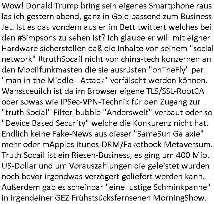 18.01.2026 05:25 Wow! Donald Trump bring sein eigenes Smartphone raus las ich gestern abend, ganz in Gold passend zum Business Jet. Ist es das vondem aus er im Bett twittert welches bei den #Simpsons zu sehen ist? Ich glaube er will mit eigner Hardware sicherstellen daß die Inhalte von seinem "social network" #truthSocail nicht von china-tech konzernen an den Mobilfunkmasten die sie ausrüsten "onTheFly" per "man in the Middle - Attack" verfälscht werden können. Wahssceuilch ist da im Browser eigene TLS/SSL-RootCA oder sowas wie IPSec-VPN-Technik für den Zugang zur "truth Social" Filter-bubble "Anderswelt" verbaut oder so "Device Based Security" welche die Konkurenz nicht hat. Endlich keine Fake-News aus dieser "SameSun Galaxie" mehr oder mApples itunes-DRM/Faketbook Metaversum. Truth Socail ist ein Riesen-Business, es ging um 400 Mio. US-Dollar und um Vorauszahlungen die geleistet wurden noch bevor irgendwas verzögert geliefert werden kann. Außerdem gab es scheinbar "eine lustige Schminkpanne" in irgendeiner GEZ Frühstsücksfernsehen MorningShow. https://www.bild.de/unterhaltung/stars-und-leute/tagesschau-lustige-schmink-panne-von-ard-star-susanne-daubner-6969ddd804401bff3baa4a8a https://www.bild.de/leben-wissen/digital/trump-t1-phone-millionen-angezahlt-doch-keine-lieferung-696a12b28cfd1c6892ef7217 [0] "202601180525-0-1.jpg" [1] "202601180525-0-2.jpg" [2] "202601180525-0-3.jpg" |
