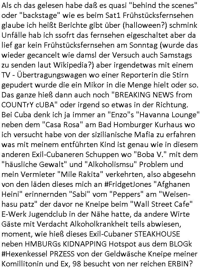 18.01.2026 05:28 Als ch das gelesen habe daß es quasi "behind the scenes" oder "backstage" wie es beim Sat1 Frühstücksfernsehen glaube ich heißt Berichte gibt über (halloween?) schmink Unfälle hab ich ssofrt das fernsehen eigeschaltet aber da lief gar kein Frühstücksfernsehen am Sonntag (wurde das wieder gecancelt wie damsl der Versuch auch Samstags zu senden laut Wikipedia?) aber irgendetwas mit einem TV - Übertragungswagen wo einer Reporterin die Stirn gepudert wurde die ein Mikor in die Menge hielt oder so. Das ganze hieß dann auch noch "BREAKING NEWS from COUNTrY cUBA" oder irgend so etwas in der Richtung. Bei Cuba denk ich ja immer an "Enzo"s "Havanna Lounge" neben dem "Casa Rosa" am Bad Homburger Kurhaus wo ich versucht habe von der sizilianische Mafia zu erfahren was mit meinem entführten Kind ist genau wie in diesem anderen Exil-Cubaneren Schuppen wo "Boba V." mit dem "häusliche Gewalt" und "Alkoholismsu" Problem und mein Vermieter "Mile Rakita" verkehrten, also abgesehn von den läden dieses mich an #FridgetJones "Afghanen Heini" erinnernden "Sabi" vom "Peppers" am "Weisen- hasu patz" der davor ne Kneipe beim "Wall Street Cafe" E-Werk Jugendclub in der Nähe hatte, da andere Wirte Gäste mit Verdacht Alkoholkrankheit teils abwiesen, moment, wie hieß dieses Exil-Cubaner STEAKHOUSE neben HMBURGs KIDNAPPING Hotspot aus dem BLOGk #Hexenkessel PRZESS von der Geldwäsche Kneipe meiner Komillitonin und Ex, 98 besucht von ner reichen ERBIN? "CUBA SI" oder sowas. https://www.tvinfo.de/fernsehprogramm/2285649944-breaking-news-in-yuba-county [0] "202601180528-0-1.jpg" [1] "202601180528-0-2.jpg" [2] "202601180528-0-3.jpg" |