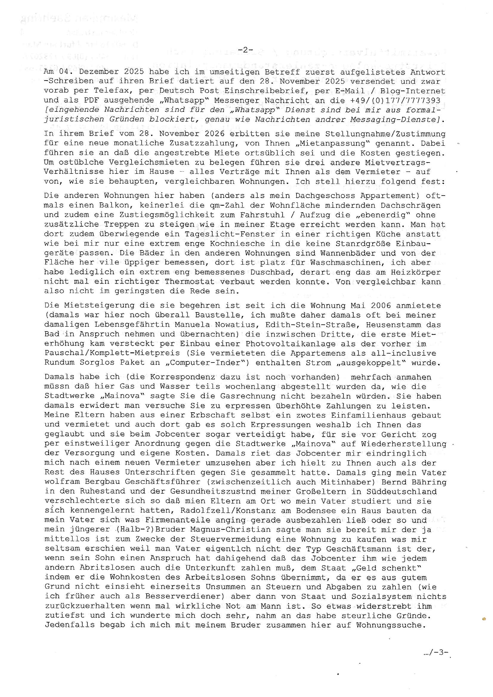 18.01.2026 18:30 Beweismittelvernichtung / Sicherung nach Solarstromanlagen-zählerstandsmanipulation, Erpressungen/lebensgefährliche Brände nach unsachgemäßer Wartung von Heizung / Aufzug tätlicher Angriffe deines Hausmeisters Coskovic auf mich siehe Video vom 06. November 2025 auf http://tiktok.maximilian.baehring.at Bin inzwischen nach Blutverlusten / Medikamentenvergiftung nach Polizei-brutalistätsexzessen (es gab Razzien gegen 17 Beamte) Rechrschteibinvalide trotz früheren Germanistik-Studiums. Maximilian Baehring Hoelderlinstrasse 4 D-60316 Frankfurt/M vorab per Fax: +49/(0)6172/2532220 Mile Rakita Kälberstücksweg 34 D-61350 Bad Homburg v.d. Höhe Frankfurt/M., den 18. Januar 2026 Mein Schreiben vom 04. Dezember 2025 (Einschreiben RT 0792 0777 2DE) vorab per Fax an die +49/(0)6172/2532220 am 04. Dezember 2025 um etwa 17:34 Uhr Ihr Schreiben hier soeben 04. Dezember 2025 ca. 14:15 Uhr eingegangen per Einschreiben Einwurf mit Post-Aufkleber Absendedatum des 28. November 2025 tragend mit Brief, insgesamt 3 Blatt je nur vorderseitig bedruckt, davon 2 Seiten Schreiben datiert auf den 27. November 2025 und 1 Rückantwort-Bogen Mein Schreiben vom 07. November 2025( Einschrieben RT 1019 3610 0DE vorab per Fax an die +49/(0)6172/2532220 am 07. November 2024, ca. 05:59 Uhr) Einschreiben RT 1019 3609 5DE vom 07. November 2025 an das LKA in Wiesbaden vorab per Fax an die +49/(0)611/327669122 am 06. November 2025 um 13:49 Uhr Onlinewache Strafanzeige Az.:2025-1106-1336-8161 Polizei Frankfurt 1257611/2025 „Whatsapp“ Nachrichten mit +49/(0)177/7777393, 13. Oktober 2025, 13:07–13:16 Uhr Mein Schreiben vom 05. Februar 2024( Einschrieben RR 9333 4210 4DE vorab per Fax an die +49/(0)6172/2532220 am 05. Februar 2024, ca 16:31 Uhr) An die Scheibe des im Hof parkendem schrzem Mercedes Gelädnewagen HG XX 9500 am 25. Mai 2022 nagebrchtes Schreiben sowei Mile Kovac persönlich mitgeteilt Mein Schreiben vom 23. März 2022( Einschrieben RR 9714 1735 5DE vorab per Fax an die +49/(0)6172/2532220 am 23. März 2022, ca 10:05 Uhr) Mein Schreiben vom 27. Februar 2022( Einschrieben RR 7963 6591 4DE vorab per Fax an die +49/(0)6172/2532220 am 27. Februar 2022, ca 11:23 Uhr) Mein Schreiben vom 20. Februar 2022( Einschrieben RR 7963 6517 1DE vorab per Fax an die +49/(0)6172/2532220 am 20. Februar 2022, ca 10:33 Uhr) Vermisstenanzeige vom 15. Februar 2022( Einschrieben RR 9215 9557 9DE vorab per Fax an die +49/(0)6172/120-189 am 15. Februar 2022, ca 12:09 Uhr und in Kopie per Fax an die +49/(0)6172/2532220 am 15. Februar, ca 12:13 Uhr) Schreiben an Nicola Rakita vom 31. Januar 2022( Einschrieben RR 7963 6224 6DE vorab per Fax an die +49/(0)6172/2532220 am 31. Januar 2022, ca 08:40 Uhr) Mein Schreiben vom 22. Januar 2022( Einschrieben RR 7963 6117 0DE vorab per Fax an die +49/(0)6172/2532220 am 12. Januar 2022, ca 17:58 Uhr) Telefonat von der +49/(0)174/3639226 auf die +49/(0)177/7777393 am 19. Januar 2022 von ca. 13:20 Uhr bis ca. 13:25 Uhr (Dauer 04:50 min) Mein Schreiben vom 14. Januar 2022( Einschrieben RR 9215 8587 7DE vorab per Fax an die +49/(0)6172/2532220 am 14. Jnauar 2022, ca 16:11 Uhr) Mein Schreiben vom 30. Dezember 2021( Einschrieben RR 9215 8099 9DE vorab per Fax an die +49/(0)6172/2532220 am 30. Dezember 2021, ca 11:58 Uhr) Mein Schreiben vom 10. Dezember 2021( Einschrieben RR 7963 5489 9DE vorab per Fax an die +49/(0)6172/2532220 am 10. Dezember 2021, ca 17:12 Uhr) Ihr Schreiben vom 08. hier eingegangen am 10. Dezemebr 2021 wegen eienr Mieterhöhung für meine Wohnung Hölderlinstraße 4, 60136 Frankfurt am Main Mile (Rakita), Herr Nicola Rakita, Mile Kovac, Familie Rakita! b.(itte) w.(enden) Am 04. Dezember 2025 habe ich im umseitigen Betreff zuerst aufgelistetes Antwort -Schreiben auf ihren Brief datiert auf den 28. November 2025 versendet und zwar vorab per Telefax, per Deutsch Post Einschreibebrief, per E-Mail / Blog-Internet und als PDF ausgehende „Whatsapp“ Messenger Nachricht an die +49/(0)177/7777393 [eingehende Nachrichten sind für den „Whatsapp“ Dienst sind bei mir aus formal- juristischen Gründen blockiert, genau wie Nachrichten andrer Messaging-Dienste]. In ihrem Brief vom 28. November 2026 erbitten sie meine Stellungnahme/Zustimmung für eine neue monatliche Zusatzzahlung, von Ihnen „Mietanpassung“ genannt. Dabei führen sie an daß die angestrebte Miete ortsüblich sei und die Kosten gestiegen. Um ostüblche Vergleichsmieten zu belegen führen sie drei andere Mietvertrags-Verhältnisse hier im Hause – alles Verträge mit Ihnen als dem Vermieter – auf von, wie sie behaupten, vergleichbaren Wohnungen. Ich stell hierzu folgend fest: Die anderen Wohnungen hier haben (anders als mein Dachgeschoss Appartement) oft-mals einen Balkon, keinerlei die qm-Zahl der Wohnfläche mindernden Dachschrägen und zudem eine Zustiegsmöglichkeit zum Fahrstuhl / Aufzug die „ebenerdig“ ohne zusätzliche Treppen zu steigen wie in meiner Etage erreicht werden kann. Man hat dort zudem überwiegende ein Tageslicht-Fenster in einer richtigen Küche anstatt wie bei mir nur eine extrem enge Kochniesche in die keine Stanrdgröße Einbau-geräte passen. Die Bäder in den anderen Wohnungen sind Wannenbäder und von der Fläche her vile üppiger bemessen, dort ist platz für Waschmaschinen, ich aber habe lediglich ein extrem eng bemessenes Duschbad, derart eng das am Heizkörper nicht mal ein richtiger Thermostat verbaut werden konnte. Von vergleichbar kann also nicht im geringsten die Rede sein. Die Mietsteigerung die sie begehren ist seit ich die Wohnung Mai 2006 anmietete (damals war hier noch überall Baustelle, ich mußte daher damals oft bei meiner damaligen Lebensgefährtin Manuela Nowatius, Edith-Stein-Straße, Heusenstamm das Bad in Anspruch nehmen und übernachten) die inzwischen Dritte, die erste Miet-erhöhung kam versteckt per Einbau einer Photovoltaikanlage als der vorher im Pauschal/Komplett-Mietpreis (Sie vermieteten die Appartemens als all-inclusive Rundum Sorglos Paket