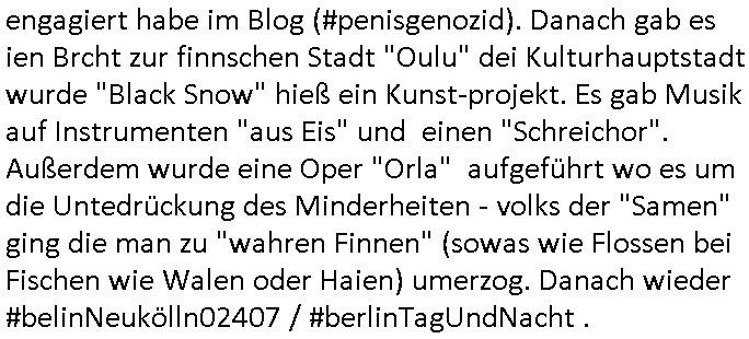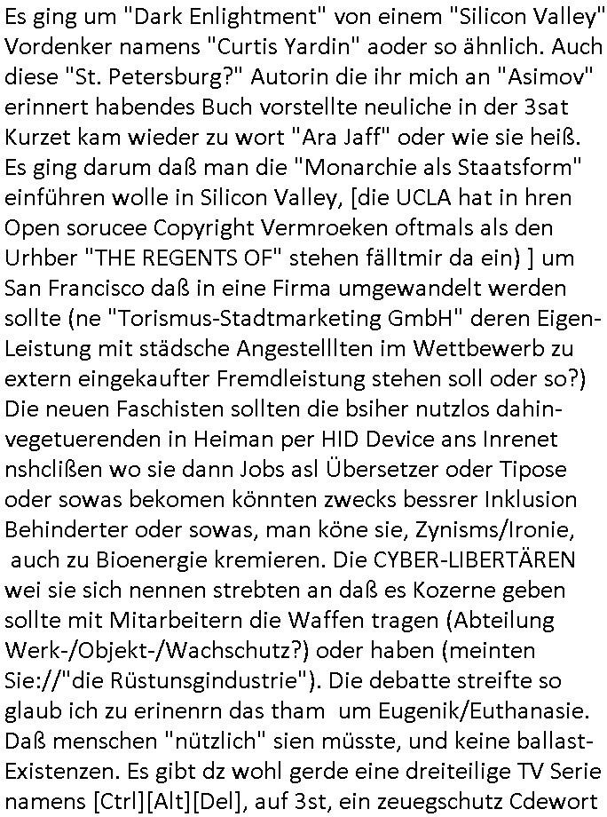 20.01.2026 06:00 Nun zum 18:00 Uhr TV - Vorbandprogramm von gestern, Montag dem 19. Januar 2026 udm 18:00 Uhr beginnden mit den #Simpsons wo die Folge kam in der Barkeeper Moe eine Russen-Katalogbraut ehelchensollte. Die Folge zwo war angelehnt an "die fabelhafte Welt der Amelie" nur ben mit Lisa, Marge wurde Tupperware Party-Sar, (homosexuelle Männer dachten sie sei ne Drag Queen). Das erinert mich daran daß mienKiat Ehefrau Christina Kreuzer doch immer lieber ein Mann sein wollte und den 3 Wetter Taft Feminismus und den ganzen Gender Gaga. Dann #berlinNueKölln02407 also #berlinTagUndNacht . Mila will Olivia unebdingt wieder aus der WG werfen aber die andren Mitbewohnberinnen Karla und Yanni sind dagegen. Malte übernachtet mit Chiara im selben Bett. Peggy kam zu Besuch und Blumen (von Joe, während er sie in Empfang nahm), lustigerweise liefe eben zwischen ca. 05:45 Uhr und 05:55 Uhr am führen Dienstag morgen, den 20. Janur 2026 asl ich meinen allmorgentlichen Sat1 Frühstücksfsrehensecrrenhot machte ein Bericht aus nem Supermarkt wo ausgerechnet "PAPA JOE'S" Produkte im Regal ins Bild rückten. Er ezähtl Paggy daß Valinsa in Kolumbien ist (da sie den Anruf mit der Todesnachricht von Mikes Vater für echt hielt, statt einem Enkeltrick, wahrscheiblich will aber nur wieder die Organhandels-mafia welche sie damsl mit einem Flugezeug kidnappen wollte was von ihr). Danach begann dann wie fast immer hier die 3sat #Kulturzeit. Es ging um "Dark Enlightment" von einem "Silicon Valley" Vordenker namens "Curtis Yardin" aoder so ähnlich. Auch diese "St. Petersburg?" Autorin die ihr mich an "Asimov" erinnert habendes Buch vorstellte neuliche in der 3sat Kurzet kam wieder zu wort "Ara Jaff" oder wie sie heiß. Es ging darum daß man die "Monarchie als Staatsform" einführen wolle in Silicon Valley, [die UCLA hat in hren Open sorucee Copyright Vermroeken oftmals als den Urhber "THE REGENTS OF" stehen fälltmir da ein) ] um San Francisco daß in eine Firma umgewandelt werden sollte (ne "Torismus-Stadtmarketing GmbH" deren Eigen-Leistung mit städsche Angestelllten im Wettbewerb zu extern eingekaufter Fremdleistung stehen soll oder so?) Die neuen Faschisten sollten die bsiher nutzlos dahin-vegetuerenden in Heiman per HID Device ans Inrenet nshclißen wo sie dann Jobs asl Übersetzer oder Tipose oder sowas bekomen könnten zwecks bessrer Inklusion Behinderter oder sowas, man köne sie, Zynisms/Ironie, auch zu Bioenergie kremieren. Die CYBER-LIBERTÄREN wei sie sich nennen strebten an daß es Kozerne geben sollte mit Mitarbeitern die Waffen tragen (Abteilung Werk-/Objekt-/Wachschutz?) oder haben (meinten Sie://"die Rüstunsgindustrie"). Die debatte streifte so glaub ich zu erinenrn das tham um Eugenik/Euthanasie. Daß menschen "nützlich" sien müsste, und keine ballast-Existenzen. Es gibt dz wohl gerde eine dreiteilige TV Serie namens [Ctrl][Alt][Del], auf 3st, ein zeuegschutz Cdewort es wird echt zeit daß sie chistin Metz in den knast stecken, gstern gab es auch den passenden wanhinweis "max will sterben" in Bild-Online wo es darum ghet caß Metz mien Zivildiebst Utergaen verncihten udn mcih in die uarien an die front schicken wollte damit amnmichals Zug der ggen Soldaten/Kemrden Vergewaltiger aussgte umbringt. Dan gab es Nuegkietn aus demIra, manghet davonasu daß ischen 16.00 bsi 18.000 Msnch ums Leben gekomen sind bei den protesten die der Schah-Sohn angezettelt hat. Dei Hlfe die trump verpch hab sie agsbliben, man veruet daß die Erdölpdusizrend laäder inder basrchenwlt Duckauf ihn ausgeübt hätten.. Dan ging es um ein Buch eins an Blut-koreb leukämie erkrankten Autors" Hlya Byran" oder so das hieß Abschiede(e). Er sagte daß quas alle Erinerung Fiktionsei wil wir Dinge beschönigen und weglassen die usn Unaganhemnsind. Danach folgte eine vatsraltung "kultur gegen vergessen" wo es um "Sinti und Roma" die verfolgt worden waren ging und "das Rad des Glücks". Dann wurde ein Buchs besprochen mitd emTitel "steckt den sand nicht in den Kopf". Es folgte ein Südamerika Auswandererbuch "wir die Wolf"s wo es um (lucy luk würdees "stchdraht inde rärei" nennen) landvermessung ging und vermischung (genetisch, oder nicht) mit der indigenen Ureinwohner Bevölkrung . Ich kenn nur ien Sadisten namens "Wolf" dermcih gstalkt/belästgt hat von einer forensik aus weil ich mich für "gustl Molath" engagiert habe im Blog (#penisgenozid). Danach gab es ien Brcht zur finnschen Stadt "Oulu" dei Kulturhauptstadt wurde "Black Snow" hieß ein Kunst-projekt. Es gab Musik auf Instrumenten "aus Eis" und einen "Schreichor". Außerdem wurde eine Oper "Orla" aufgeführt wo es um die Untedrückung des Minderheiten - volks der "Samen" ging die man zu "wahren Finnen" (sowas wie Flossen bei Fischen wie Walen oder Haien) umerzog. Danach wieder #belinNeukölln02407 / #berlinTagUndNacht . https://tvinfo.de/fernsehprogramm/2285647215-die-simpsons https://tvinfo.de/fernsehprogramm/2285647227-die-simpsons https://tvinfo.de/fernsehprogramm/2265224869-kulturzeit [0] "202601200600-0-1.jpg" [1] "202601200600-0-2.jpg" [2] "202601200600-0-3.jpg" [3] "202601200600-0-4.jpg" |