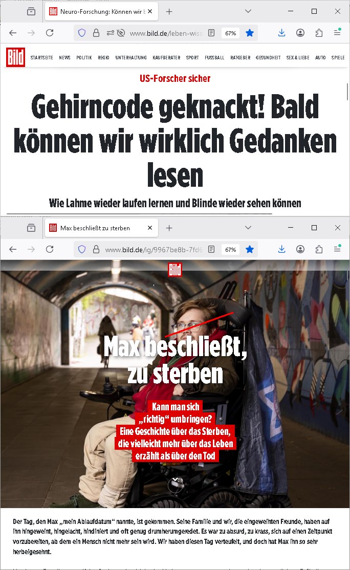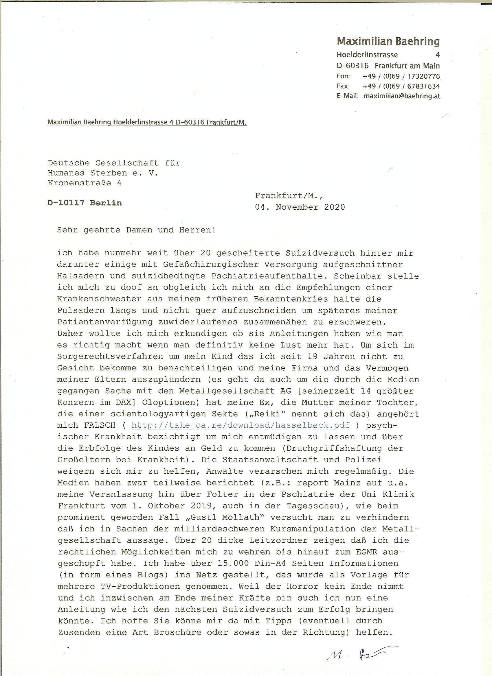 20.01.2026 06:01 Was hatte ich eben über "Zeugenschutz Codes" gesagt? Über Eugenik und Euthanasie? Hatte ich mal was zum Recht Behinderter auf Kinder/ein Familienleben gesagt? "Krieg der Knöpfe Kiregsspiel Roylas Besuch in der Kita" als ich noch eien kleines Kind war und Missbrauchs Opfer wurde erstmalig? Diese Opel-Zoo Tierschutz Mafia die "hess natur textil" (ethisch wertvollee "etsy" produkte) Internet-Shop / "neckermann EDV pleite" artig Schaafe aus dem Ausland mit "bessrer Wolle" importieren wollte? "Der Kanzler in "CASHMoRE"' Arikel und "AL-PAKA" . /. Wühltisch-Ramsch bei "WOlL-WORTH"? Blutdiamanten? Wo Hausfrauen/Omas strickwareen und Opas Öl - Bilder anfertigen in Haus/Heimarbeit und per Internet absetzen können sollten im "rundum sorglos Plattform " Paket wo Amazon artg Experten für Logistik/Qualität/Vorschriften /Anti-Dumping usw. der Lefrekette garantieren sollten. Man wollte auch "alte und behinderte"/"spastker" usw. besser inkludieren indm man das smartphone/alxa zu einer Unversal frbdieung umbaut mit der man dann per "social media" sozial teilhaben kann inde man sich dinge "ans bett bestellt" oder in selbsthilfegruppen oder mit freunden und familie "chattet". diese kinofilm #matrix elektrode zum gehirn so vr-brillen/kopfhörer-kombi artig? Das ist die Copter tastatur mit feedback vom Monitor. Die wollten mich ja in einem forschungsprojket gaz aktev folter asl crhe daß ich über karndevegelgungen udn dei rackeietier illagalen Paralljustiz aussgagt hatte. daher fragich mich immer wen ich was lese eür leut eioecngch ferillge streb wollten, was hatmanden angatan? eienrehe von ver-gftugen damit sie sich nicht mehr zum arzt trauen wenn sie schmerzen haben wie bei mir, kidnapping und bombenterror, Plünderung, Enteignung udn (Urheber-rechtsdiebstahl), sadisiten Pseudononymous Pschoteror? Wenn der typ mit dem Kettenfahrzeg asu der "bild" unbedingt sterben will dann soll er doch Panzer fahren. Ich will nichtd aß Luet wie er meine (sinn ergebenden in gnem egstzusmmahge texte klauen und diese mit ihrem (uszusmehägenden) Unfug vertauschen. Ich hier erinner nochmal an Steinmiers Worte "Niemdn wird nchher sgan könen er hab nichts gewusst" womit das zetalter gemeintist indem anna fark nicht stil udn heilichienatgbuch führt sodenr Foletropfer "bloggen". Für jedermann der Hilfistung unterlässt global lesbar. Und ich riner nochmal an das letzte mal wo heir korrute sasidten Cops mein Wohnungstür kaputtgemacht haben. Wo ich an die DGHS (deutsche gesellschaft für humanes sterben) gschiben habe mit kopie anden Bundestag. Daß ich einen Suizid witerem goflter werden durch Sadisten - "mitmenschen" (de ich nicha sl soche bezechen würde) vorziehe man aber cht geben üsse sitesn des staates weil da ganz klare mordmerkmale vorliegen, es sich nicht m nen "(Assiteirten) suizid" ahdelt sodnern um ien egziltes jamdn in den aufden rsten blick vilechte udn bestenfalls scheinbaren suizid zu treiben. https://www.bild.de/leben-wissen/medizin/gedankenlesen-stanford-entschluesselt-innere-sprache-6915c2d87ff132e7560fa39c https://www.bild.de/ig/9967be8b-7fd6-4d9a-bc0f-be2eb35c5b5e/index/index.html "max beschließt zu sterben" http://blog.sch-einesystem.de/ARTICLE/2020110408000/ === >8 === schnipp === >8 === 04.11.2020 08:00 Herr R**s von der Suizidprävention vom Gesundheitsamt (Dr. W*** war auch dabei) hat insofern Recht mit siener Kritik als das die Suizid-versuche die ich unternahm ja auch mit körperlichen Schmerzen verbunden gewesen sind und ganz vergessene zu erwähnen daß es die Möglichkeit gibt daß das auch mal so schief läuft daß man anchließend nicht tot sondern behindert und ein Pflegefall ist. Daher frag ich sicherheitshalber mal nach wie man es richtig macht. --- Maximilian Baehring Hoelderlinstrasse 4 D-60316 Frankfurt/M. Deutsche Gesellschaft für Humanes Sterben e. V. Kronenstraße 4 D-10117 Berlin Frankfurt/M., 04. November 2020 Sehr geehrte Damen und Herren! ich habe nunmehr weit über 20 gescheiterte Suizidversuch hinter mir darunter einige mit Gefäßchirurgischer Versorgung aufgeschnittner Halsadern und suizidbedingte Pschiatrieaufenthalte. Scheinbar stelle ich mich zu doof an obgleich ich mich an die Empfehlungen einer Krankenschwester aus meinem früheren Bekanntenkries halte die Pulsadern längs und nicht quer aufzuschneiden um späteres meiner Patientenverfügung zuwiderlaufenes zusammenähen zu erschweren. Daher wollte ich mich erkundigen ob sie Anleitungen haben wie man es richtig macht wenn man definitiv keine Lust mehr hat. Um sich im Sorgerechtsverfahren um mein Kind das ich seit 19 Jahren nicht zu Gesicht bekomme zu benachteiligen und meine Firma und das Vermögen meiner Eltern auszuplündern (es geht da auch um die durch die Medien gegangen Sache mit den Metallgesellschaft AG [seinerzeit 14 größter Konzern im DAX] Öloptionen) hat meine Ex, die Mutter meiner Tochter, die einer scientologyartigen Sekte ("Reiki" nennt sich das) angehört mich FALSCH ( http://take-ca.re/download/hasselbeck.pdf ) psych-ischer Krankheit bezichtigt um mich entmüdigen zu lassen und über die Erbfolge des Kindes an Geld zu kommen (Druchgriffshaftung der Großeltern bei Krankheit). Die Staatsanwaltschaft und Polizei weigern sich mir zu helfen, Anwälte verarschen mich regelmäßig. Die Medien haben zwar teilweise berichtet (z.B.: report Mainz auf u.a. meine Veranlassung hin über Folter in der Pschiatrie der Uni Klinik Frankfurt vom 1. Oktober 2019, auch in der Tagesschau), wie beim prominent geworden Fall "Gustl Mollath" versucht man zu verhindern daß ich in Sachen der milliardeschweren Kursmanipulation der Metall-gesellschaft aussage. Über 20 dicke Leitzordner zeigen daß ich die rechtlichen Möglichkeiten mich zu wehren bis hinauf zum EGMR aus-geschöpft habe. Ich habe über 15.000 Din-A4 Seiten Informationen (in form eines Blogs) ins Netz gestellt, das wurde als Vorlage für mehrere TV-Produktionen genommen. Weil der Horror kein Ende nimmt und ich inzwischen am Ende meiner K