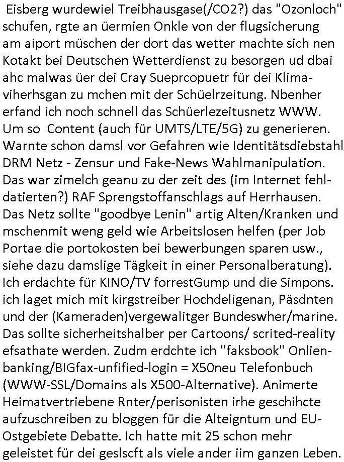 20.01.2026 08:00 Gestern abend um 20:15 Uhr zur TV Primetime war ich hunde-müde seit Tagen stresst man mich total unnötigen Verwaltungsakten, alles muß ich doppelt und dreifach machen und zwar weil andre mich nachweislich ganz gezielt sabotieren so wie die belegschaft damsl bei hp (hewlett packard) in Bad Homburg Ober-Eschbach nicht arbeiten konnt weil die Standleitung zum Großrechner i en USA ausfiel was dzu führte daß ich mir eine Lösung dafür ausdachte, quasi sowas wie BGP Routing wo man nicht nur per drahtgebundener/glasfaser/Erdleitung die Fima ans (wietverkehrs-)Netz anbinden sollte sondern auch "last cost routing" artig per Mobiltefon-Daten-Funk. Die spswrten fandendas gut, ezusätlichüertrgausweg würde ihenn bei VPNs ermöglichen den Key-Exchange und den Payload-Kanal zu trennen, "2 Factor Auth" artig. CIhw olte daß Anrfe is Moilfunnetz nictmer per Festnetz ausgeleitet werdne an die DTAG und von dort asu erst ins Mobilfunknetz sondern direkt genau wie die Festnetz Gespräche nich über das Mobilfunk-Netz laufe sollten so ein Anshcluß an dhtgebudene Natz verfügbar wäre. Nur bei Aufall denMobfukmansten oder der Telfonleitung sollte dann das jeweils andere Medium den Verkehr mitübernehmen und so garantieren daß die belegschaft wegesn iens lteusgausfalls nich mehr däumchen drehen und anschließend überstunden machen muß. dan regte ich noch an nachzuprüfen ob die "titanic" atstcähclch deshab opfer eiener kolsison mit nem sie versenkenden Eisberg wurdewiel Treibhausgase(/CO2?) das "Ozonloch" schufen, rgte an üermien Onkle von der flugsicherung am aiport müschen der dort das wetter machte sich nen Kotakt bei Deutschen Wetterdienst zu besorgen ud dbai ahc malwas üer dei Cray Sueprcopuetr für dei Klima-viherhsgan zu mchen mit der Schüelrzeitung. Nbenher erfand ich noch schnell das Schüerlezeitusnetz WWW. Um so Content (auch für UMTS/LTE/5G) zu generieren. Warnte schon damsl vor Gefahren wie Identitätsdiebstahl DRM Netz - Zensur und Fake-News Wahlmanipulation. Das war zimelch geanu zu der zeit des (im Internet fehl-datierten?) RAF Sprengstoffanschlags auf Herrhausen. Das Netz sollte "goodbye Lenin" artig Alten/Kranken und mschenmit weng geld wie Arbeitslosen helfen (per Job Portae die portokosten bei bewerbungen sparen usw., siehe dazu damslige Tägkeit in einer Personalberatung). Ich erdachte für KINO/TV forrestGump und die Simpons. ich laget mich mit kirgstreiber Hochdeligenan, Päsdnten und der (Kameraden)vergewalitger Bundeswher/marine. Das sollte sicherheitshalber per Cartoons/ scrited-reality efsathate werden. Zudm erdchte ich "faksbook" Onlien-banking/BIGfax-unfified-login = X50neu Telefonbuch (WWW-SSL/Domains als X500-Alternative). Animerte Heimatvertriebene Rnter/perisonisten irhe geschihcte aufzuschreiben zu bloggen für die Alteigntum und EU-Ostgebiete Debatte. Ich hatte mit 25 schon mehr geleistet für dei geslscft als viele ander iim ganzen Leben. Und dann musste ich mir gestren ansehen wie Fühlfilme liefen zu Tham jemand versucht sich umzubringen aber er shciret. Das war bei mir anders. ich hate ne patienten-vfügung die KIRMINLELRISEE ignoriert wurde und man hat mir die aufgetrenetn halsadern im hsoptal zum helge negsitw iede rzusgenäht gene meienr erklrärten willen. ICh woltemich nälcihnichtwerde folter udn terosiern lasn vo dne lute die mch vergelgt udmeinkd enführt haben. das sind so luet die (wgeter mann) "sTILL SCHWEI-GER" Filme produzieren udn für dei Drehkosten Immobilen ebilehn die ihn nicht gehören um so Künstler mit großer mssnmdaler richwiet dazu zu bringen sie im Wahlkampf zu "hypen". Leute die behaupten dein Kid habe (wi denn?) die Erbschacft vaporisiert mit denr drogen/ Alkohol-bahaögige Ex-Fra zsumen während du ANGEBLICH im Koma lagst. "LEBENDIG BEGRABEN"/asl "echter VATER" verschwigen. Dau vshcslensie bshcich die Fälle von Sorge/Umgangs-rchten für täter und Opfer von Vergewaltigungen im "hebammen-kiosk.de". Verdunh mit gekidppten Kidern Psotione zu eprsne wenn nicht gleich Geld (für Drogen). Das gab es getrn indem film ach, der typ der das Auto verkauft hatte weit unter wert um an Geld zu kommen für die finanzierung einer Sucht. Dann gab esgetrn noch ien film wo es drum ging daß Whrdiensst-Drückberger vechten irhe Idtitätn sl erchsen mit den vonKdenr zuvschen um zu bahten di eisen es die anstatt von ihen aufgudndeisn EDV Feher zumwhrdit hergazoegn werden sollten um so selbst keinen leisten zu müssen. wir erinern us, die juden di enchisralmussten zm wehrdienst udn die Serben wo es irgendwas gab mit der Kita-opia-kurprk-Reitercliquen-Promi Hochzeit und der Entführung von Kindern mit falscher Haarfarbe (siehe dazu das thema "Calvell Noble hose" blondes schamhaar, am 3 wette fat learet sichergehen da es kein gefärbtes haupthaar ist wie beim Abgeordneten "Gelbhaar", "die Madam" und ihr Gespür für "Cokes", Pepsi /DrPeppers ) da wo ein rgeirungslearjet genut wurde um wehrdienst-verweigerer außer landes zu verschleppen wärhend die kder die eglch an bord siensollten die prügel abbekamen die noch viel zu jung waren für den wehrdienst. "IN ... HURRY TO SEE YOU GO TO GROUND" : "JAMIROQUAI"! oder der ukrainer/ddr-vernrecher "STURM AUFS KAPT_L". Es istkei Zfall daß es filemwie "Air Force One" gibt und daß "JFK Tatort Dallas" von "FlightPlan" rezitiert wird. Es gibt da von "Fatboy Slim" dies "bird of prey" video in dem JFK Nachfolger "Johnson" om TV kommt und dann der Einsatzbefehl für die Kampfjets, der Epoche nach zu urteilen im Nachbarland Thailands, in Vietnam. Es gibt einen Zusammenhang ziwschen "HENRIETTA R HIPPO" und der "nicht die könign" FUTURE-RAMA vomKita riterlciquen Truneir udn ihrer Schuschf sttasbche Krone. Thai/Schweizer/Yugo/Trüen Desteruer die evrche meine Identität zu klauen asl Unetrnehr udn Zvildist fertig abgelistet habender um sich zu bereichern udn drücken. https://tvinfo.de/fernsehprogramm/2285650421-die-rettung-der-uns-bekannten-welt https://tvinfo.de/fernsehprogramm/2285645480-air-fo