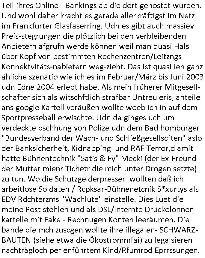 22.01.2026 07:45 Hurra, es wird noch langsamer wir sind mit meiner aDSL Leitung aktuell bei 2304/1543 kbit/s Das entspricht etwa Bandbreiten mit den Frimen-Kunden meiner Firma ange-bunden waren vor 25 Jahren per sDSL mit 2320 kbit/s (sowohl up/wir down) von Telefonica oder den aller-ersten T-Inteonnect aDSL mt 1536/384 kbit/s (up/down). ich hate backbone seitig n x E1 liegen >= 4 Mbit/s, zudem Richtfunk mit >= 10 Mbit/s, mehrfach sDSL >= 2 Mbit/s. DTAG/Telefonica/TGC, UUnet/MCIWorldcom/ Verizon und CERFnet/GlobalAccessTelecom/Cogent, 38Ghz Richtfunk TGC war damals per KPNQWest/ Lambdanet und Kleyrex (da lag eigentlich nur Hurrycan-Electric) im Netz. Es ist echt widerlich den ich brauch hohe Bandbreiten selten, etwa wenn ich die quartals-weisen großen Backup - Downloads mache oder eben egstren. Ich hab ja erzählt daß ich am Smartphone die alte MicroSD/SDXC Speicher-karte gegen einenneue tauschen muß wile die voll ist mit ca. 55 GB an MP4 Videos und nochmal über 5 GB an PDF-Dateien. Eben brach die Verbindung komplett zusammen in etwa jedes zwote oder dritte paket ging dann ab dem Beginn dieser Störung anschließend bei PING-Tests verloren. Ich mußte den Router neu starten. Stabil sieht anders aus. Jedenfalls wollte ich die Ersatz SDXC-karte mit dem backup der Videos "aus der cloud" befüllen aber das downloaden dauerte Stunden. Datenraten von 75 kB/sec bis 150 kB/sec von Franfurt nach Frankfurt auf dem Kabel und im IP-Addressbereoch des DSL-Providers. Das USB-kabel mit dem anders als der Elektronikfachmark im myZeil behautet hat der wie ich erfuhre gerade von starurn auf medimakr umfimiert behatete USB-C fürs Telefon ist ja kaputt, ich musste mir also eine Lösung zusammen-basteln mit WIFI wiel ich nur einen SDXC - Leser hatte (in diesem steckte dann die neue Karte) und die shartes ich per SSH/SFTP/SSH und das Mobil-Telefon uploadete dan stunden-lang per RFC1918 WIFI/WALN Link und die Daten auf deirKarte udn die Zeitstempel mussten dann später per script manuell wieder hergestellt werden (das Original mit den richtigenzetsplen ist noch vorhanden). Von etwa 08:30 Uhr bis etwa 20:30 Uhr dauerte das. Erinnert mich irgendwie an "Stasi & Fy" Mecki der mal was manipleren wollt im Bad Homburger Telefonnetz mit seinen Kollegen mit diese, DATG Kabel TV / Colt Telecom Kartell, damlas als TGC sich an CERFNet "Global Access" anscchen wollte und unerlaunnterweis mein Endpumkte Netz als Transit über drahtgebunden DeCIX Konnektivität zum Interxion (Hanauer-Land 30X) und "Verizon [war das chon zu UUNet MAE Zeiten so]?" Kleyerstraße DeCIX hin nutzen wollte. Hiter dem Kleyrex steckt eine bis auf die Knochen korrupter Odnungsamtsführugszirkeltype (die sitzen dort nämlich, in Nähe der afaik GPS/RAIL ARCOR Fasern) der im Rahemn des Polizei beschaffungsskandals hfftlich mit gebauchte wurde zusammen mit den anderen Millonenbetrügern. Die Sparkasse schafft (Alarmsignal) Teil ihres Online - Bankings ab die dort gehostet wurden. Und wohl daher kracht es gerade allerkräftigst im Netz im Frankfurter Glasfaserring. Udn es gibt auch massiev Preis-stegrungen die plötzlich bei den verbleibenden Anbietern afgrufn werde können weil man quasi Hals über Kopf von bestimmten Rechenzentren/Leitzngs- Konnektvitäts-nabietern weg-zieht. Das ist quasi ien ganz ähliche szenatio wie ich es im Februar/März bis Juni 2003 udn Edne 2004 erlebt habe. Als mein früherer Mitgesell-schafter sich als witschftlich strafbar Untreu eris, anteile ans google Kartell veräußen wollte woeb ich in auf dem Sportpresseball erwischte. Udn da ginges uch um verdeckte bschhung von Polize udn dem Bad homburger "Bundesverband der Wach- und Schließgesellscften" aslo der Banksicherheit, Kidnapping und RAF Terror,d amit hatte Bühnentechnik "Satis & Fy" Mecki (der Ex-Freund der Mutter mienr Tichetr die mich unter Drogen setzte) zu tun. Wo die Schutzgelderpresser wollten daß ich arbeitlose Soldaten / Rcpksar-Bühnenetcnik S*xurtys als EDV Rdchterzms "Wachlute" einstelle. Dies Luet die meine Post stehlen und als DSL/Internte Drückolonnen kartelle mit Fake - Rechnugen Konten leeräumen. Die bande die mch zuscgen wollte ihre illegalen- SCHWARZ-BAUTEN (siehe etwa die Ökostrommfai) zu legalsieren nachträgloch per enführtem Kind/Rfumrod Eprrssungen. https://www.chip.de/news/software/sparkasse-spricht-kuendigung-aus-und-loescht-daten-kunden-muessen-schnell-aktiv-werden_b8e504cd-b07d-419d-96c9-1219e3abf511.html = Kidnapping Eprssung RZ-Shcutgeld/Lizenzenmafia https://www.hessenschau.de/panorama/frankfurter-justizskandal-um-korruption-bewaehrungsstrafe-fuer-it-unternehmer-v2,prozess-korruption-102.html [0] "202601220745-0-1.jpg" [1] "202601220745-0-2.jpg" [2] "202601220745-0-3.jpg" [3] "202601220745-0-4.jpg" |