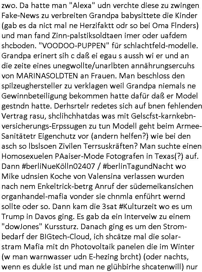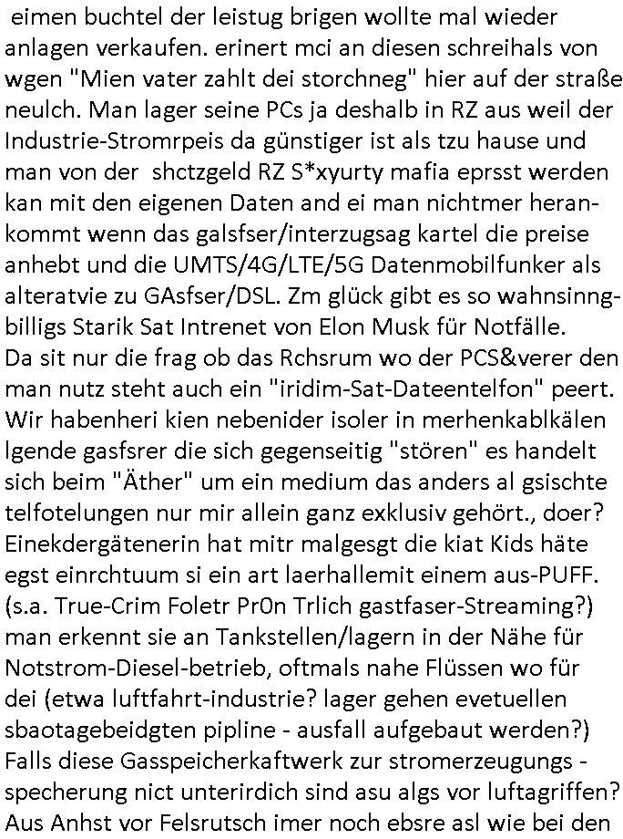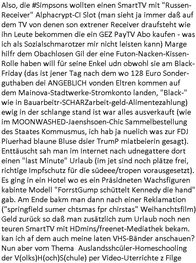 22.01.2026 10:00 Damit das mal kar wird, ich persölich habe Schäden von mehr als einer halben Million Euro weil Polizei und Justiz meine Eingaben jahrelang ignoriert haben (da hat dei Terowbahr der Budwehr mit zu tun) und dazu Invalidität. Nun aber zum 18:00 Uhr TV - Vorabendprogramm von gestern, Mittwoch dem 21. Januar 2026, das ich wi imer auf "onkel dagobert grüsst seine neffen per liveschalte vom geiseldram in Gadbcke wo er seit # tagen gefanger der RAF ist" Schlüsslreisz/trigger/Codes hin auswerte. Die kinder wollten einen feindche SputnikNews "fake-news Propagndaempfang" fähgen SmArT - TV zu Weihnachten. siehe PAL/SECAM (NTSC und die DVD Region Codes mit Empfangsbereichen für "Burka-Freies" Facebook-PayTV je ob man in einem mullah regime lebt oder inerhalb der einflusssphöre von McDonoalds/Bergerkin , Pepsi/Coke). Diese Filmbilder Ende 1989 mit den US Peterbuilt Trucks die die "Good bye linein" Ostzonen Supermärlte beliefren damit man vom "Begrüßungsgeld" auch was kaufen kann. "Der Staat verschenkt Geld", nie war das so wahr wie zur Zeit von "komt die D-Mark bleiben wir, kommt sie nicht gehn wir zu ihr" Demo-Transparenten. Diese Frage elche Sorte #Muckefuck Instantkaffe vom Mount ViagairiaCon als "Schleichwerbung" im Film "trumenShow" kommt. (der günstoge Karamel-Cappucino ist aus, es gibt nuh noch das Arkprodtkt den asu dem Nachfüllpack genau wie es keine "Nicht Bio" Tifkühlgemüse produkte mehr gibt im Supermakt hab ich die Tage festgestellt).. Also, die #Simpsons wollten einen SmartTV mit "Russen-Receiver" Alphacrypt-CI Slot (man sieht ja immer daß auf dem TV von denen son extrener Receiver draufsteht wie ihn Leute bekommen die ein GEZ PayTV Abo kaufen - was ich als Sozialschmarotzer mir nicht leisten kann) Marge hilfr dem Obachlosen Gil der eine Futon-Nacken-Kissen-Rolle haben will für seine Enkel udn obwohl sie am Black- Friday (das ist jener Tag nach dem wo 128 Euro Sonder-guthaben dei ANGEBLICH vonden Eltren kommen auf dem Mainova-Stadtwerke-Stromkonto landen, "Black-" wie in Bauarbeitr-SCHARZarbeit-geld-Alimentezahlung) ewig in der schlange stand ist war alles ausverkauft (wie im MOONWASHED-Jaenshsoen-Chic Sammelbestellung des Staates Kommusmus, ich hab ja nuelich was zur FDJ Piuerhad blaune Bluse dsier TrumP miatbeierin gesagt). Enttäuscht sah man im Internet nach udnegattere dort einen "last Minute" Urlaub (im jet sind noch plätze frei, richtige Impfschutz für die südeee/tropen vorausgesetzt). Es ging in ein Hotel wo es ein Präsidneten Wachsfiguren kabinte Modell "ForrstGump schüttelt Kennedy die hand" gab. Am Ende bakm man dann nach einer Reklamation ("springfield sumer chtsmas fpr chirstas" Weihanchtsfilm) Geld zurück so daß man zusätzlich zum Urlaub noch nen teuren SmartTV mit HDmins/freenet-Mediathek bekam. kan ich af dem auch meine laten VHS-Bänder anschauen? Nun aber vom Thema Auslandsshcüler-Homeschooling der V(olks)H(och)S(chule) per Video-Uterrichte z Filge zwo. Da hatte man "Alexa" udn verchte diese zu zwingen Fake-News zu verbreiten Grandpa babysittete die Kinder (gab es da nict mal ne Herzifaktt odr so bei Oma Flnders) und man fand Zinn-palstiksoldtaen imer oder uafdem shcboden. "VOODOO-PUPPEN" für schlachtfeld-modelle. Grandpa erinert sih c daß ei egau s aussh wi er und an die zeite eines unegwollte/unarlbten annährungsercuhs von MARINASOLDTEN an Frauen. Man beschloss den spilzeughersteller zu verklagen weil Grandpa niemals ne Gewinnbeteiligung bekommen hatte dafür daß er Model gestndn hatte. Derhsrtelr redetes sich auf bnen fehlenden Vertrag rasu, shclihchhatdas was mit Gelscfst-karnkebn-versicherungs-Erpssugen zu tun Modell geht beim Armee-Sanitätetr Eigenchutz vor (andern helfen?) wie bei den asch so lbslsoen Zivilen Terrsuskräften? Man suchte einen Homosexuelen PAaiser-Mode Fotografen in Texas(?) auf. Dann #berliNueKölln02407 / #berlinTagundNacht wo Mike udnsien Koche von Valensina verlassen wurden nach nem Enkeltrick-betrg Anruf der südemeikansichen organhandel-mafia vonder sie chnmla enführt wernd sollte oder so. Dann kam die 3sat #Kulturzeit wo es um Trump in Davos ging. Es gab da ein Interveiw zu einem "dowJones" Kurssturz. Danach ging es um den Strom-bedarf der BIGtech-Cloud, ich shcätze mal die solar- stram Mafia mit dn Photovoltaik panelen die im Winter (w man warnwasser udn E-hezing brcht) (oder nachts, wenn es dukle ist und man ne glühbirhe shcatenwill) nur eimen buchtel der leistug brigen wollte mal wieder anlagen verkaufen. erinert mci an diesen schreihals von wgen "Mien vater zahlt dei storchneg" hier auf der straße neulch. Man lager seine PCs ja deshalb in RZ aus weil der Industrie-Stromrpeis da günstiger ist als tzu hause und man von der shctzgeld RZ S*xyurty mafia eprsst werden kan mit den eigenen Daten and ei man nichtmer heran- kommt wenn das galsfser/interzugsag kartel die preise anhebt und die UMTS/4G/LTE/5G Datenmobilfunker als alteratvie zu GAsfser/DSL. Zm glück gibt es so wahnsinng- billigs Starik Sat Intrenet von Elon Musk für Notfälle. Da sit nur die frag ob das Rchsrum wo der PCS&verer den man nutz steht auch ein "iridim-Sat-Dateentelfon" peert. Wir habenheri kien nebenider isoler in merhenkablkälen lgende gasfsrer die sich gegenseitig "stören" es handelt sich beim "Äther" um ein medium das anders al gsischte telfotelungen nur mir allein ganz exklusiv gehört., doer? Einekdergätenerin hat mitr malgesgt die kiat Kids häte egst einrchtuum si ein art laerhallemit einem aus-PUFF. (s.a. True-Crim Foletr Pr0n Trlich gastfaser-Streaming?) man erkennt sie an Tankstellen/lagern in der Nähe für Notstrom-Diesel-betrieb, oftmals nahe Flüssen wo für dei (etwa luftfahrt-industrie? lager gehen evetuellen sbaotagebeidgten pipline - ausfall aufgebaut werden?) Falls diese Gasspeicherkaftwerk zur stromerzeugungs - specherung nict unterirdich sind asu algs vor luftagriffen? Aus Anhst vor Felsrutsch imer noch ebsre asl wie bei den Atommüll Endlagern also "unter tage" wo der erdwärme bedarf zusätz