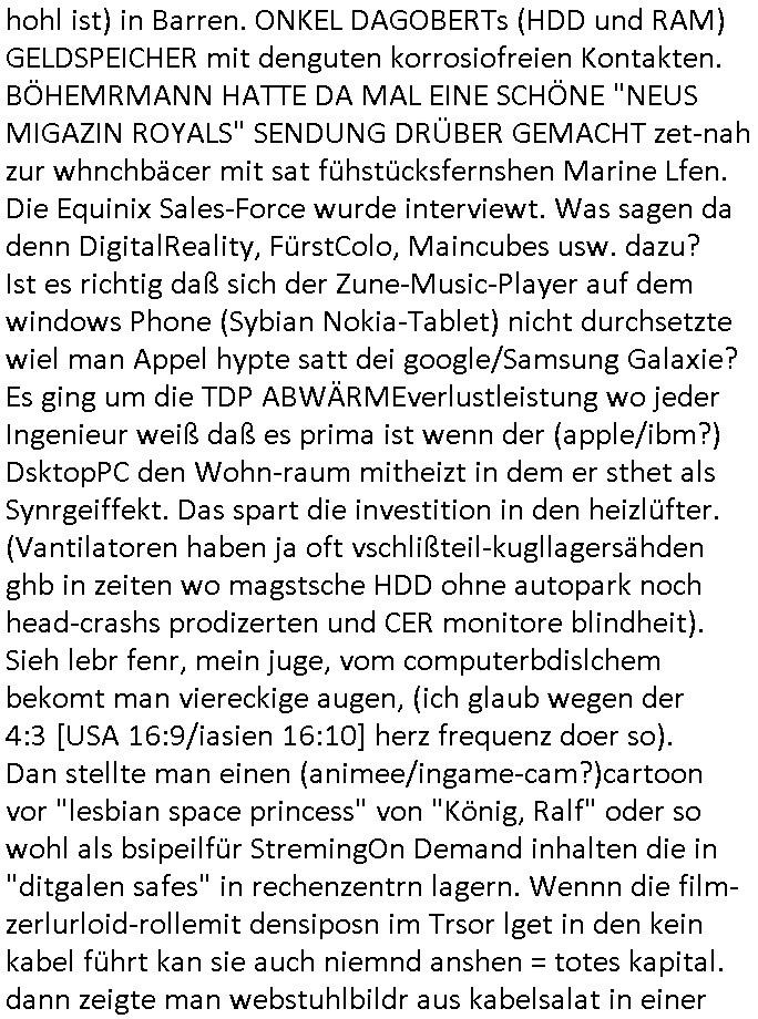22.01.2026 15:45 Kaum kritisiere ich eben daß das GEZ Fernsehen also die 3sat #Kulturzeit Betreuber #Equinix hypt stolpre ich über einen fast zeitgleich ins Interner gestellten Hessenschau Beitrag wos explizit um digitalReality und fürstcolo geht. First Colo "Das Werkhaus"/A(ccent)O(ffice)c(enter) ist ja der geografisch in Ostrichtung glaub ich nächsgelegene Standort von hier (dem EZB Standort/Aral Hanuer-Land- nördliches Mainufer) und man bestätigt auch meien Infos mit dem ehemalgen Neckermann - Konzern Gelände. Was die EZB angeht gab es in Davos einen Eklat um Lagarde und auf das Privatflugzeug von Merz gabs nen Anschlag. Waren Luftfahrt- und Banken-Rechenzentren nicht heute Themen bei mir? Ich hab ganz am Anfang von meinen tiktok-videos so "analoge traceroute Spaziergang" Videos gemacht, mit den Frankfzert Tanklagern an den Rechen-ztren das hatten mir die kidnapper Terrroisten fios aus dem Bad Homburger Hexenkssel Edde 1998 gesaht daß ich das machen soll, das würde die Milutärs provozieren. Es ginge dabei darum zu zeigen daß die Rote Armee/RAF wisse wo sie zushclagen müsse wie beim Stromausfall in Berlin vor wenigen Tagen. Damals tönten die S*xurtys bei usn noch nie würde jemand herausfinden an welchem ort in der Otsverlittusgstele die Bankensicherheit hängt oder EZB Führungserspnal. Mit Aufällen und dem rütteln an meienr Leitung die als Lockvogel fungieren sollte allem anschin nach wollte man denen das Gegenteil beweisen. Die liefern sich da "Fights" und ich hab den Schaden. https://www.bild.de/politik/ausland-und-internationales/wegen-us-handelsminister-eklat-bei-davos-dinner-lagarde-stuermt-aus-saal-6971d571707d4aa20757cd8b https://www.bild.de/regional/nordrhein-westfalen/drei-festnahmen-in-nrw-aktivisten-wollten-flugzeug-von-kanzler-merz-beschaedigen-6972041828aa17d2d28c317e https://www.hessenschau.de/wirtschaft/de-cix-internetknoten-in-frankfurt-knackt-rekord-dank-eintracht-spiel-v1,internetknotenpunkt-datenverkehr-steigt-100.html P.S.: Es gab auch mal/gibt noch ClaraNet aber ich glaub bei denen mußte man dann (das lezte mal daß ich da anfrgat war aber in der anfangszeit des iternets als digital reality in der hanuer land 302 noch interxion hieß) die IP konnektivität/den traffic von denen dazunehmen wobei bei den anderen den "carrierneutralen" meines wissens nach peering/transit frei gewählt werden kann das kann sich aber alles zwischenzeitlich längst geändert haben. mir geht es um Standorte wo man die Anbindung nach außen mit verschiedner großen Carrier selbst bestimmen kann, das ist aber füre Normalkunden fast "oversized". https://en.wikipedia.org/wiki/Network-neutral_data_center https://www.datacentermap.com/germany/frankfurt/ Notstrom Diesel Rationierung https://www.bsi.bund.de/DE/Themen/Unternehmen-und-Organisationen/Informationen-und-Empfehlungen/Empfehlungen-nach-Angriffszielen/Hochverfuegbarkeit/Arbeitshilfen/LagerungBrennstoffeNEA/Lagerung_Brennstoffe_NEA_node.html https://www.mainova-webhouse.com/en/ Die Photvoltaik lässt sich im Ernstfall per Luftaufklärung leicht ausmachen (geht das auch per SAT Fotos?). Das kann heißen daß Zvilschutz oder Armee währnd krisen Anlagen für r dei iege neutzung beschlagnahmen würden. Die entscheidende Frag ist ob und wie viel Diesel für ein Notromaggargat man abbekommt wenn man die Polizei und das Militär nicht im Netz haben will. "inconvetiant truth" ist daß im Krisenfall als Oppostioneller Regime-kritiker schlicht und ergreifend abgeschaltet werden. Wenn es also Vorschriften zur lagerung von maximalen erlabten Mengen von Notstrom-Diesel gibtd ann gibt es auch Rchte zu Hausdurchsuchungen zwecks Kontrollen. [0] "202601221545-0-1.jpg" [1] "202601221545-0-2.jpg" [2] "202601221545-0-3.jpg" [3] "202601221545-0-4.jpg" [4] "202601221545-0-5.jpg" [5] "202601221545-0-6.jpg" [6] "202601221545-0-7.jpg" |