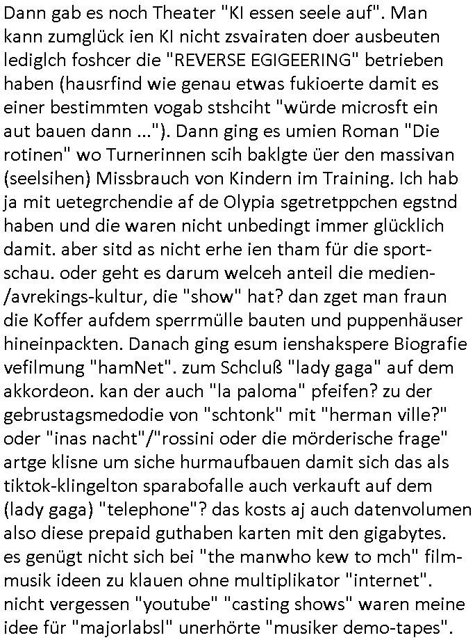 23.01.2026 06:03 Weiter im 18:00 Uhr TV Vorabemdprogramm vo gestern, Donnerstag dem 22. Januar 2026: jeztt 3sat #Kulturzeit : Es ging um Trumps Gaza Friedensrat den er sich wohin stecken kann und isarelsche wehrpflichtige Frauen die nachsrichtenqeullen auswerteten und die ANGEBLICHE Offensive der Palästinenser vorhersahen, sieh dazu auch den 06./07. Oktober 2020 hier im Blog. cih sgte siet jahrn voraus was frtsämmige Verbrechernags vorhatten hier im ladn aber zughört hat man mir zu wenig. alesndehalb ist die kacke am dmapfen wiel irh den fschn Luet vertraut habt und (wir sidn hie rin frankfurt, wo der Euro her-kommt) die gaze wetsuopsäche volksiscft mit inden abgrudn egrissen bei euren ermentn fehlentchcidungen. Dan zget man einen PALLYWOOD totko-mfia Fake film über eine angeche Notrufzetral in Paälsten, "das hätte auch aus LEGO sein können" um es mit "wag the dog" filmzitate zu sagen. es ging dabei um ein Mädchen das angeblich verschüttet worden war was aber eine FALLE war. erinert sich noch jamd was ich zu Thema Notruf und korrupte cops/mediziner bei der nächstgelegnen Polizie-dienststelle/Klinik und ilegaler Parlleljustiz gesagt habe. KIta Vip ormi Hochezte "MAXICAN RADIO" "(ich bin ein) S.(t)A.R. -> HOLT MICH HIER RAUS" DUSCHGELCAMP. TRÄNEN DER SONNE PSYGAME MUROTS NAZI-KUR IM ANGEBLICHEN MARHUNA BOXER KLINIKPARADIES . NUr eben nchts o rum sond "ich bin ien star und ich will daß der kriminell pöbel hier weggeräumt wird". Dann gab es noch Theater "KI essen seele auf". Man kann zumglück ien KI nicht zsvairaten doer ausbeuten lediglch foshcer die "REVERSE EGIGEERING" betrieben haben (hausrfind wie genau etwas fukioerte damit es einer bestimmten vogab stshciht "würde microsft ein aut bauen dann ..."). Dann ging es umien Roman "Die rotinen" wo Turnerinnen scih baklgte üer den massivan (seelsihen) Missbrauch von Kindern im Training. Ich hab ja mit uetegrchendie af de Olypia sgetretppchen egstnd haben und die waren nicht unbedingt immer glücklich damit. aber sitd as nicht erhe ien tham für die sport-schau. oder geht es darum welceh anteil die medien-/avrekings-kultur, die "show" hat? dan zget man fraun die Koffer aufdem sperrmülle bauten und puppenhäuser hineinpackten. Danach ging esum ienshakspere Biografie vefilmung "hamNet". zum Schcluß "lady gaga" auf dem akkordeon. kan der auch "la paloma" pfeifen? zu der gebrustagsmedodie von "schtonk" mit "herman ville?" oder "inas nacht"/"rossini oder die mörderische frage" artge klisne um siche hurmaufbauen damit sich das als tiktok-klingelton sparabofalle auch verkauft auf dem (lady gaga) "telephone"? das kosts aj auch datenvolumen also diese prepaid guthaben karten mit den gigabytes. es genügt nicht sich bei "the manwho kew to mch" film-musik ideen zu klauen ohne multiplikator "internet". nicht vergessen "youtube" "casting shows" waren meine idee für "majorlabsl" unerhörte "musiker demo-tapes". https://tvinfo.de/fernsehprogramm/2265225305-kulturzeit [0] "202601230603-0-1.jpg" [1] "202601230603-0-2.jpg" |