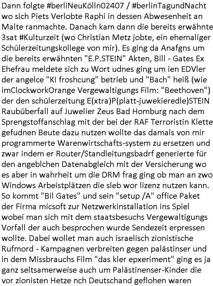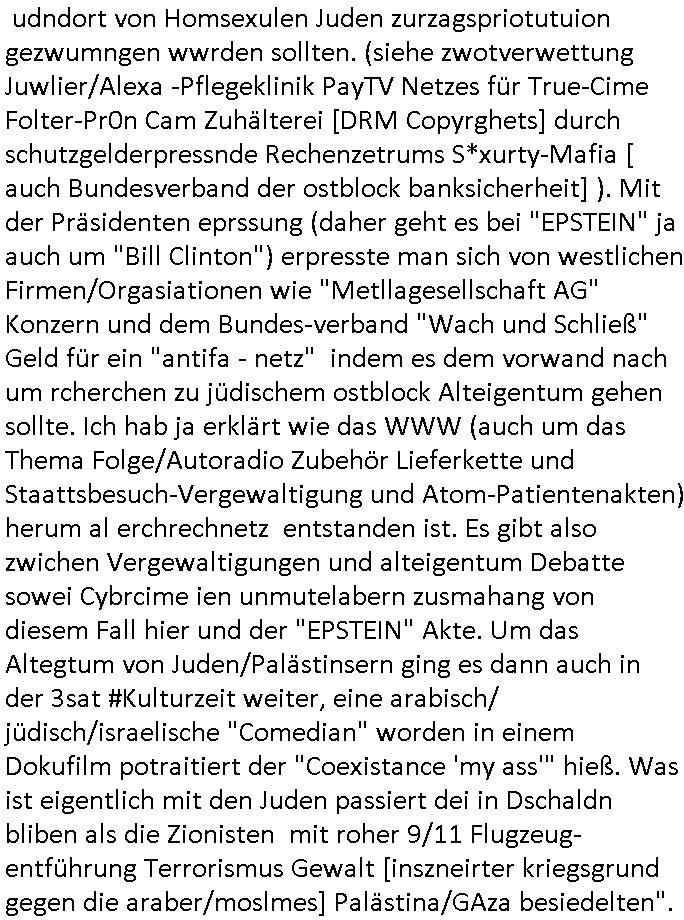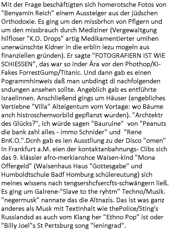05.02.2026 06:00 Passend zum Thema Korruption im Medizinwesen um die Marihuana Dorgendealer Gang um Bruckmaier/Assmann die mit "metallgesellscgft Öl"/"Mainova Stadtwerke Öko-Stromterror" den Wahlkampf von Boxer KlitschKO in der Ukraine und ebenso den Putsch von Jeltzin/Putin gegen Gorbatschow finanzierte gab es dann auch am gestrigen Mittwoch, den 04. Februar 2026 gleich zwo #Simpsons Folgen zu Thema. Marge bekam dabie einen Job in einer Marihuana Klinik, sowas wie dei Drogenamabulanz an der Zoo-Passage (bekannt aus RTL2 Hartes Deutschland) hier am S-Bahnhof Ostendstraße, Hanauer-Land- Ecke Friedberger-Anlage nähe Allerhilgentor Frankfurt a. M. dort wo benso wi inde rklik Dr. abustark und Pschiatren im Rhein-Magn gebite RAF Attentäter per falschen §20, §21 StGB Gutachten vor einer Strafverfolgung geschützt werden indem man diese als im Rauschzustand die Raten begehnde schuldunfähige Junkies darstellt. Und auch das "Forrest Gump" Thema "Staatbesuch Bangkok Schulschiff Vergewaltigung" tauchte auf. Das daraus hervorgegangen sein sollende Kind Maggie bekam plötzlich einen Freund der es mit seiner Mutter zusammen ausspionierte. Dabei ginges auch um Bad-Renovierunge wie in "terminal" mit "tom hanks" wo es in wahrheit um dei renovierung des "kaiser wilhelms bads" und der "klinik Baumstark" ging. Wie schon in der "frecking" folge sollte "Mr Burns" mit "gas Deals" (Habeck-Heizkostenkrise) erpresst werden. Linkextreme Rohstoffgeschäft Verschwörungstheorien. Dann folgte #berliNeuKölln02407 / #berlinTagundNacht wo sich Piets Verlobte Raphi in dessen Abwesenheit an Malte ranmachte. Danach kam dann die bereits erwähnte 3sat #Kulturzeit (wo Christian Metz jobte, ein ehemaliger Schülerzeitungskollege von mir). Es ging da Anafgns um die bereits erwähnten "E.P.STEIN" Akten, Bill - Gates Ex Ehefrau meldete sich zu Wort udnes ging um ien EDVler der angelce "KI froshcung" betrieb und "Bach" heiß (wie imClockworkOrange Vergewaltigungs Film: "Beethoven") der den schülerzeitung E(xtra)P(platt-juwekieredle)STEIN Raubüberfall auf Juwelier Zeus Bad Homburg nach dem Sprengstoffanschlag mit der bei der RAF Terroristin Klette gefudnen Beute dazu nutzen wollte das damals von mir programmerte Warenwirtschafts-system zu ersetzen und zwar indem er Router/Standleitungsbadrf generierte für den angeblchen Datenabgleich mit der Versicherung wo es aber in wahrheit um die DRM frag ging ob man an zwo Windows Arbeistplätzen die sleb wor lizenz nutzen kann. So kommt "Bil Gates" und sein "setup /A" office Paket der Firma micsoft zur Netzwerkinstallation ins Spiel wobei man sich mit dem staatsbesuchs Vergewaltigungs Vorfall der auch besprochen wurde Sendezeit erpressen wollte. Dabei wollet man auch israelisch zionistische Rufmord - Kampagnen verbreiten gegen palästinser und in dem Missbrauchs Film "das kler epxeriment" ging es ja ganz seltsamerweise auch um Palästinenser-Kinder die vor zionisten Hetze nch Deutschand geflohen waren udndort von Homsexulen Juden zurzagspriotutuion gezwumngen wwrden sollten. (siehe zwotverwettung Juwlier/Alexa -Pflegeklinik PayTV Netzes für True-Cime Folter-Pr0n Cam Zuhälterei [DRM Copyrghets] durch schutzgelderpressnde Rechenzetrums S*xurty-Mafia [ auch Bundesverband der ostblock banksicherheit] ). Mit der Präsidenten eprssung (daher geht es bei "EPSTEIN" ja auch um "Bill Clinton") erpresste man sich von westlichen Firmen/Orgasiationen wie "Metllagesellschaft AG" Konzern und dem Bundes-verband "Wach und Schließ" Geld für ein "antifa - netz" indem es dem vorwand nach um rcherchen zu jüdischem ostblock Alteigentum gehen sollte. Ich hab ja erklärt wie das WWW (auch um das Thema Folge/Autoradio Zubehör Lieferkette und Staattsbesuch-Vergewaltigung und Atom-Patientenakten) herum al erchrechnetz entstanden ist. Es gibt also zwichen Vergewaltigungen und alteigentum Debatte sowei Cybrcime ien unmutelabern zusmahang von diesem Fall hier und der "EPSTEIN" Akte. Um das Altegtum von Juden/Palästinsern ging es dann auch in der 3sat #Kulturzeit weiter, eine arabisch/ jüdisch/israelische "Comedian" worden in einem Dokufilm potraitiert der "Coexistance 'my ass'" hieß. Was ist eigentlich mit den Juden passiert dei in Dschaldn bliben als die Zionisten mit roher 9/11 Flugzeug-entführung Terrorismus Gewalt [inszneirter kriegsgrund gegen die araber/moslmes] Palästina/GAza besiedelten". Mit der Frage beschäftigten sich homerotsche Fotos von "Benyamin Reich" einem Aussteiger aus der jüdschen Orthodoxie. Es ging um den missbrhcn von Pflgern und um den missbrauch durch Mediziner (Vergewaltgung hilfloser "K.O. Drops" artig Medikamentierter umihen unerwünschte Kidner in die erblin iezu mogeln aus finanziellen gründen). Er sagte "FOTOGRAFIERN IST WIE SCHIESSEN", das war so inder Ära vor den Phothop/KI-Fakes ForrestGump/Titanic. Und dann gab es einen Pogrammhinweis daß man unbdingt di nachfolgenden sndungen ansehen sollte. Angeblich gab es entführte Israelinnen. Anschließend gings um Häuser (angebliches Vertiebne "Villa" Alteigentum vom Vortage: wo Bäume anch histroschemvorbild gepflanzt wurden). "Archtektr des Glücks?", ich würde sagen "Bauruine" von "Peanuts die bank zahl alles - immo Schnider" und "Rene BnK.O.".Dcnh gab es ien Ausstllung zu der Disco "omen" in Frankfurt a.M. eien der kontaktanbahnungs- Clibs sich das 9. klässler afro-merkianshce Waisen-kind "Mona Offergeld" (Waisenhaus Haus "Gottesgabe" und Humboldtschule Badf Homburg schülereutung) sich meines wissens nach tengsershcfsercfts-schwängern ließ. Es ging um Galrene-"Slave to the ryhtm" Techno/Musik. "negermusk" nannate das die Altnazis. Das ist was ganz anderes als Musk mit TextInhalt wie thePolice/Sting's Russiandsd as auch vom Klang her "Ethno Pop" ist oder "Billy Joel"s St Pertsburg song "leningrad". Danch ging es um den Inhalt vonRchtren "katharina fischer" die mir von der optik her zimlch bekannt vorkam, sie sieht einer mit-schülerin von mir überas ählich, udn ihre kollgeinnen veröffentlichten dort hörsp