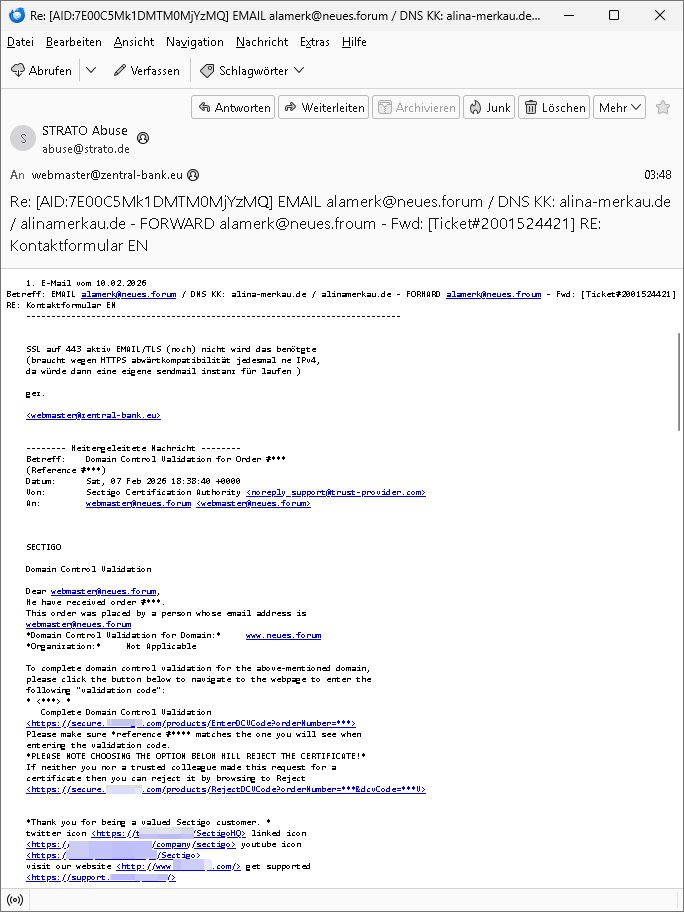 11.02.2026 06:49 -------- Nachricht -------- Betreff: Re: [AID:AB7303Mk1DMTM0MjkzMQ] Fwd: WICHTIG! EILT! EMAIL alamerk@neues.froum / DNS KK: alina-merkau.de / alinamerkau.de - FORWARD alamerk@neues.froum - Fwd: [Ticket#2001524421] RE: Kontaktformular EN Datum: Wed, 11 Feb 2026 06:49:51 +0100 Von: postmaster@neues.forum <postmaster@neues.forum> An: abuse@strato.de, alamerk@neues.forum, domain-support@internetx.com, abuse@strato.de, poststelle@bk.bund.de, internetpost@bundesregierung.de, internetpost@bpa.bund.de Kopie (CC): post@tinamerkau.de, post@tina-merkau.de, friedrich.merz@bundestag.de Guten Morgen (Berufs/Branchen)-Kollegen! Sie wissen welche ex-DDR-Bürgerrechtlerin unter "neues forum" firmiert? Also auch wessen privater Email Alias <alamerk@> unter neues forum ist? Ihnen ist auch bekannt wer mail@alina-merkau.de betreibt (Sie, Strato)? (Ihr DNS löst indem fall in "rzone.de" auf "InternetworkX, Regensburg"). ALinAMERKau ist Presse/TV und AngeLAMERKel die frühere Bundeskanzlerin. Sie haben schon Recht ein Email-Forward ist (siehe PräzendezfalL Hillary CLinton Wahlkampf-Email-Umleitung) keine Rechtsverletzung. Und selbst wenn dem so wäre handle ich in Absprache mit der Bankensicherheit und Führungsspitzen der Ermittlungsbehörden und Presse, das ist eine "Demo" die zu Schulungszwecken für Wach- und Schließgesellschaften Personal im Bundesgebiet lief (da arbeitete meine Mutter als Chefsekretärin im Arbeitgeberverband in Bad Homburg vor de rhöhe bei Frankfurt am Main) in der ursprüngelchen Konzeption. Dann kamn die bedrohung meiner schwangren Freundin und das Kidnapping meines Kindes. Ich werde also epresst. Daher informiere ich Sie "kollegialerweise" über etwaige Risiken. Tipp: Werfen sie mal einen Blick auf http://neues.forum . Das ist ein interner Alarmcode der Terror-Korruptions-ermittler. <postmaster@neues.forum> Am 11.02.2026 um 03:51 schrieb STRATO Abuse: > Guten Morgen, > > warum senden Sie uns diese Nachrichten? [...] === -------- Weitergeleitete Nachricht -------- Betreff: Re: [AID:7E00C5Mk1DMTM0MjYzMQ] EMAIL alamerk@neues.forum / DNS KK: alina-merkau.de / alinamerkau.de - FORWARD alamerk@neues.froum - Fwd: [Ticket#2001524421] RE: Kontaktformular EN Datum: Wed, 11 Feb 2026 03:48:21 +0100 Von: STRATO Abuse <abuse@strato.de> Antwort an: abuse@strato.de An: webmaster@zentral-bank.eu Guten Morgen, In Ihrer Nachricht ist kein ABUSE-Fall zu erkennen. Welche Rechtsverletzung wollen Sie melden? Mit freundlichen Grüßen STRATO GmbH | Abuse ------------------------------------------------------------------------------- Kontakt: abuse@strato.de Website: *** ------------------------------------------------------------------------------- STRATO GmbH *** *** Berlin, Germany ------------------------------------------------------------------------------- Die gesetzlichen Pflichtangaben gemäß § 80 AktG finden Sie unter https://***/impressum/ . In dieser Nachricht werden folgende 2 Anfragen von Ihnen beantwortet: === -------- Weitergeleitete Nachricht -------- Betreff: Re: [AID:7E00C5Mk1DMTM0MjYzMQ] EMAIL alamerk@neues.forum / DNS KK: alina-merkau.de / alinamerkau.de - FORWARD alamerk@neues.froum - Fwd: [Ticket#2001524421] RE: Kontaktformular EN Datum: Wed, 11 Feb 2026 03:48:21 +0100 Von: STRATO Abuse <abuse@strato.de> Antwort an: abuse@strato.de An: webmaster@zentral-bank.eu Guten Morgen, In Ihrer Nachricht ist kein ABUSE-Fall zu erkennen. Welche Rechtsverletzung wollen Sie melden? Mit freundlichen Grüßen STRATO GmbH | Abuse ------------------------------------------------------------------------------- Kontakt: abuse@strato.de Website: *** ------------------------------------------------------------------------------- STRATO GmbH *** *** Berlin, Germany ------------------------------------------------------------------------------- Die gesetzlichen Pflichtangaben gemäß § 80 AktG finden Sie unter https://***/impressum/ . In dieser Nachricht werden folgende 2 Anfragen von Ihnen beantwortet: 1. E-Mail vom 10.02.2026 Betreff: EMAIL alamerk@neues.forum / DNS KK: alina-merkau.de / alinamerkau.de - FORWARD alamerk@neues.froum - Fwd: [Ticket#2001524421] RE: Kontaktformular EN --------------------------------------------------------------------------- SSL auf 443 aktiv EMAIL/TLS (noch) nicht wird das benötgte (braucht wegen HTTPS abwärtkompatibilität jedesmal ne IPv4, da würde dann eine eigene sendmail instanz für laufen ) gez. <webmaster@zentral-bank.eu> -------- Weitergeleitete Nachricht -------- Betreff: Domain Control Validation for Order #*** (Reference #***) Datum: Sat, 07 Feb 2026 18:38:40 +0000 Von: Sectigo Certification Authority <noreply_support@trust-provider.com> An: webmaster@neues.forum <webmaster@neues.forum> SECTIGO Domain Control Validation Dear webmaster@neues.forum, We have received order #***. This order was placed by a person whose email address is webmaster@neues.forum *Domain Control Validation for Domain:* www.neues.forum *Organization:* Not Applicable To complete domain control validation for the above-mentioned domain, please click the button below to navigate to the webpage to enter the following "validation code": * <***> * Complete Domain Control Validation < https://secure.***/products/EnterDCVCode?orderNumber=*** > Please make sure *reference #**** matches the one you will see when entering the validation code. *PLEASE NOTE CHOOSING THE OPTION BELOW WILL REJECT THE CERTIFICATE!* If neither you nor a trusted colleague made this request for a certificate then you can reject it by browsing to Reject < https://secure.***/products/RejectDCVCode?orderNumber=***&dcvCode=***V > *Thank you for being a valued Sectigo customer. * twitter icon < https://***/SectigoHQ > linked icon < https://www.***/sectigo> youtube icon <https:// www.***/Sectigo > visit our website < http://www.***/ > get supported < https://support.***/ > Copyright © Sectigo Limited, All rights reserved. >-------- Weitergeleitete Nachricht -------- >Betreff: WITCHIG! EILT! EMAIL alamerk@n