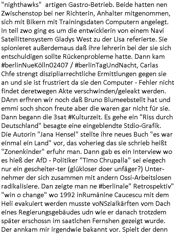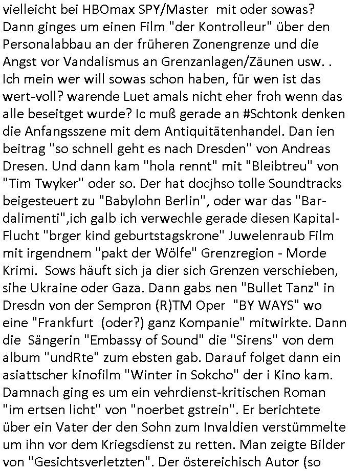 11.02.2026 08:15 Huet mrog rschte jedenfasl mal wider mehrfach meine Windows - Miet - VPS im RZ ab nachdem irgendewelche komischen "KGB/CIA Bundstrojanner"(?) auf einem voll (samt ateier virepattern) gepatchten Win11 aufpoppten. Auch das billig Android Smartphone das ich mir geholt hab wegen der Onlinbanking Freigba TAN - App macht probleme,der akku is so gut wie leelgelutscht nachdem ich gestern einen "treu Crime" Podcts mit mienr Lieblings Sat1 FrühstücksTV Morderatorin ansehen/-hören wollte. Ich bin da drauf gelandet als ich die <alamerk@> Email Addresse googlete respektive in der wikipedia suchte. Nun zum 18:00 Uhr TV Vorabandprogramm von gestern, Dienstag dem 10. Februar 2026. Zwoter Versuch: Es ging um Flugangst bei den #Simpsons und ich musste da aus irgndeinem Grudn an einen Artikel über diese Ostblock Charter - Airline "fischAir" dneken den ich aus irgendnem Grund verlinkt habe gestren als ich "Flugbenzin in Cuba" oder so was ählcihes in die Suchmaschine getippt hatte . Das würde man doch mitbekonmen hier am Airport in Frankfurt wenn die Ucaber Miltärs Kraftstoff rationieren. So lang ich die gecancelten mashcinen (da gibt es ja auch eine Simposn Folge zu, CIA/Pilotenbars und Medzinische Flüge ins Cuba Klinikpardies ) nicht mit eigenen Augen gesehen habe glaub ich Lügen-Trumps Propaganda gar nichts. Aber zur #flugangst Folge der #Simpsons: Skinner reiste mit chalmbers ncah cincinatti zu einem Kongress mit (schon wideer) Chili-Essen in einem Edward-Hopper "nighthawks" artigen Gastro-Betrieb. Beide hatten nen Zwischenstop bei ner Richterin, Anhalter mitgenommen, sich mit Bikern mit Trainingsdaten Computern angelegt. In teil zwo ging es um die entwicklerin von einem Navi Satellittensystem Gladys West zu der Lisa referierte. Sie spionieret außerdemaus daß ihre lehrerin bei der sie sich entschuldigen sollte Rückenprobleme hatte. Dann kam #berlinNueKölln02407 / #berlinTagUndNacht, Carlas Chfe strengt diszipliarrechtliche Ermittlungen gegen sie an und sie ist frustriert da sie den Computer - Fehler nicht findet deretwegen Akte verschwinden/geleakt werden. DAnn erfhren wir noch daß Bruno Blumeebstellt hat und emmi soch shcon freute aber die waren gar nicht für sie. Dann begann die 3sat #Kulturzeit. Es gehe ein "Riss durch Deutschland" besagte eine eingeblendte Stdio-Grafik. Die Autorin "Jana Hensel" stellte ihre neues Buch "es war einmal ein Land" vor, das voherieg das sie schrieb heißt "Zonenkinder" erfuhr man. Dann gab es ein Interview wo es hieß der AfD - Politiker "Timo Chrupalla" sei eiegech nur ein gescheiter-ter (glükloser doer unfäger?) Unter-nehmer der sich zusammen mit andern Ossi-Arbeitslosen radikalisiere. Dan zeigte man ne #berlinale" Retrospektiv" "win o change" wo 1992 inRumänine Caucescu mit dem Heli evakuiert werden musste voNSzialkärften vom Dach eines Regierungsgebäudes udn wie er danach trotzdem später erschossn im saatlchen Fernshen gezeigt wurde. Der annkam mir irgendwie bakannt vor. Spielt der denn vielleicht bei HBOmax SPY/Master mit oder sowas? Dann ginges um einen Film "der Kontrolleur" über den Personalabbau an der früheren Zonengrenze und die Angst vor Vandalismus an Grenzanlagen/Zäunen usw. . Ich mein wer will sowas schon haben, für wen ist das wert-voll? warende Luet amals nicht eher froh wenn das alle beseitget wurde? Ic muß gerade an #Schtonk denken die Anfangsszene mit dem Antiquitätenhandel. Dan ien beitrag "so schnell geht es nach Dresden" von Andreas Dresen. Und dann kam "hola rennt" mit "Bleibtreu" von "Tim Twyker" oder so. Der hat docjhso tolle Soundtracks beigesteuert zu "Babylohn Berlin", oder war das "Bar-dalimenti",ich galb ich verwechle gerade diesen Kapital-Flucht "brger kind geburtstagskrone" Juwelenraub Film mit irgendnem "pakt der Wölfe" Grenzregion - Morde Krimi. Sows häuft sich ja dier sich Grenzen verschieben, sihe Ukraine oder Gaza. Dann gabs nen "Bullet Tanz" in Dresdn von der Sempron (R)TM Oper "BY WAYS" wo eine "Frankfurt (oder?) ganz Kompanie" mitwirkte. Dann die Sängerin "Embassy of Sound" die "Sirens" von dem album "undRte" zum ebsten gab. Darauf folget dann ein asiattscher kinofilm "Winter in Sokcho" der i Kino kam. Damnach ging es um ein vehrdienst-kritischen Roman "im ertsen licht" von "noerbet gstrein". Er berichtete über ein Vater der den Sohn zum Invaldien verstümmelte um ihn vor dem Kriegsdienst zu retten. Man zeigte Bilder von "Gesichtsverletzten". Der östereichisch Autor (so ich recht entsinen salzkammreut?) lebte im Schnzten-viertel in Hmburg und sinerte üer die kriegsschuld von Waldheim. Er sagte er zeieh es vor anonym zu bleiben beim kauf von Büchern, er würde sich ungern outen. Sondst würddeder beim EIkaufen näclih angesprochen Was der wohl liest? Pr0n-Literatur? Dann ging es um Nagelküstler Uecker. Der ist ja (siehe Blogeintrag in Nähe seines Todesstags) krzlcih verstorben uddn jezt gab es eine erst posthume Ausstellung. Sargangel Todesanziege asu dem Dotmatrix Printer: google:/""pixel dotmatrix truetype vector font"? (man kann Fonts aus Postscript/PDFs reverse engineern, so wie wenn man Podcaste SpeechtText als buch druckt). Es gab einen alten "sesam mit der maus" Beitarg über ihn. Im Reich der Nieten und Bolzen die alles zsummen halten tummeln sich ja Mäzene. Zum shcluß dei Berliner Band "von wegen Lisbeth" mit dem musik video "Madame Tussauds" wo es irgendwie um varofufakes Handsahke "Tom Hanks" ging aber der zusammhenag wurde nicht klar. Danach leif dann #berliNueKölln02407 / #berliTagUndNacht "Fraun anpumpen geht gar nicht" fand Mike. Denstz hab ich umZsmmnhag mit der ersonalie/bestzung irgeneines Bankenchfsposten iNIsderkeisen schon mal vernommen. Carla ist immer noch frustrietrt we ihr irgewas in ihrem Notebook zu komplizierte ist,sollte sie mal lieber einen eeePC "netvertible" nehmen "3 * EASY 2" : ""Easy to learn, Easy to work, Easy to play," Keep It Short/Simple. Statt Blumen zubekomen solle Emmi IKEA-BANA japan steck-kunst artige welche zusammenstellen, ich habe